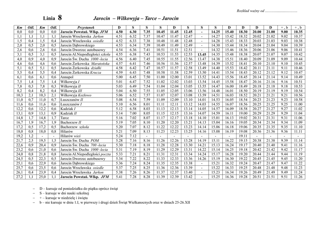 Rozkład ważny od .................................. Linia Km 0,0 1,1 1,5 2,0 2,6 3,1 4,0 4,6 5,1 5,5 6,1 7,5 7,8 8,2 10,3 11,0 11,6 12,2 13,1 14,8 16,7 17,2 18,0 19,2 21,7 22,6 23,2 24,0 24,5 25,1 25,7 26,1 27,2 Odl. 0,0 1,1 0,4 0,5 0,6 0,5 0,9 0,6 0,5 0,4 0,6 1,4 0,3 0,4 2,1 0,7 0,6 0,6 0,9 1,7 1,9 0,5 0,8 1,2 2,5 0,9 0,6 0,8 0,5 0,6 0,6 0,4 1,1 Km 0,0 1,1 1,5 2,0 2,6 3,1 4,0 4,6 5,1 5,5 6,1 7,5 7,8 8,2 10,3 11,0 11,6 12,2 13,1 14,8 16,7 17,2 18,0 19,5 20,4 21,0 21,8 22,3 22,9 23,5 23,9 25,0 Odl. 0,0 1,1 0,4 0,5 0,6 0,5 0,9 0,6 0,5 0,4 0,6 1,4 0,3 0,4 2,1 0,7 0,6 0,6 0,9 1,7 1,9 0,5 0,8 1,5 0,9 0,6 0,8 0,5 0,6 0,6 0,4 1,1 8 Jarocin – Wilkowyja – Tarce – Jarocin Przystanek Jarocin Powstań. Wlkp. JFM Jarocin Wrocławska Jarkon Jarocin Wrocławska osiedle Jarocin Dąbrowskiego Jarocin Dworzec autobusowy Jarocin Al.Niepodległości szkoła Jarocin Św. Ducha 1000 -lecia Jarocin Żerkowska Maratońska Jarocin Żerkowska działki Jarocin Żerkowska Krucza Annapol Wilkowyja I Wilkowyja II Wilkowyja III Wilkowyja Kozłowo Łuszczanów II Łuszczanów I Kadziak I Kadziak II Tarce Bachorzew II Bachorzew szkoła Hilarów Hilarów wieś Jarocin Św. Ducha POM Jarocin Św. Ducha 700 -lecia Jarocin Św. Ducha 1000 -lecia Jarocin Al.Niepodległości poczta Jarocin Dworzec autobusowy Jarocin Dąbrowskiego Jarocin Wrocławska osiedle Jarocin Wrocławska Jarkon Jarocin Powstań. Wlkp. JFM D 4.50 4.51 4.52 4.53 4.54 4.55 4.56 4.57 4.58 4.59 5.00 5.01 5.03 5.04 5.06 5.08 5.10 5.12 5.14 5.16 5.19 5.20 5.21 5.24 5.28 5.30 5.31 5.33 5.34 5.36 5.37 5.38 5.41 S 6.30 6.32 6.33 6.34 6.36 6.38 6.40 6.41 6.42 6.43 6.45 6.47 6.49 6.50 6.52 6.54 6.56 6.58 7.00 7.02 7.05 7.07 7.09 7.12 7.16 7.18 7.19 7.21 7.22 7.24 7.25 7.26 7.28 S 7.35 7.37 7.38 7.39 7.41 7.43 7.45 7.46 7.47 7.48 7.50 7.52 7.54 7.55 7.57 7.59 8.01 8.03 8.05 8.07 8.10 8.12 8.13 8.16 8.18 8.19 8.21 8.22 8.24 8.25 8.26 8.28 S 10.45 10.47 10.48 10.49 10.51 10.53 10.55 10.56 10.57 10.58 11.00 11.02 11.04 11.05 11.07 11.09 11.11 11.13 11.15 11.17 11.20 11.22 11.23 11.26 11.28 11.29 11.31 11.33 11.35 11.36 11.37 11.39 D 11.45 11.47 11.48 11.49 11.51 11.53 11.55 11.56 11.57 11.58 12.00 12.02 12.04 12.05 12.07 12.09 12.11 12.13 12.15 12.17 12.20 12.22 12.23 12.26 12.28 12.29 12.31 12.33 12.35 12.36 12.37 12.39 S 12.45 12.47 12.48 12.49 12.51 12.53 12.56 12.57 12.58 12.59 13.01 13.03 13.05 13.06 13.08 13.10 13.12 13.14 13.16 13.18 13.21 13.23 13.25 13.28 13.30 13.31 13.34 13.36 13.38 13.39 13.40 13.42 D – kursuje od poniedziałku do piątku oprócz świąt S – kursuje w dni nauki szkolnej + – kursuje w niedzielę i święta b – nie kursuje w dniu 1.I, w pierwszy i drugi dzień Świąt Wielkanocnych oraz w dniach 25-26.XII S 13.45 13.47 13.48 13.49 13.50 13.52 13.54 13.55 13.56 13.59 14.01 14.03 14.05 14.07 14.10 14.13 14.14 14.16 14.19 14.21 14.22 14.24 14.26 - S 14.25 14.27 14.28 14.30 14.32 14.35 14.38 14.39 14.40 14.41 14.43 14.45 14.47 14.48 14.51 14.53 14.55 14.57 14.59 15.01 15.04 15.06 15.08 15.11 15.13 15.14 15.17 15.19 15.21 15.22 15.23 15.25 D 15.40 15.42 15.43 15.44 15.46 15.48 15.51 15.52 15.53 15.54 15.56 15.58 16.00 16.01 16.03 16.05 16.07 16.09 16.11 16.13 16.16 16.18 16.19 16.22 16.24 16.25 16.28 16.30 16.32 16.33 16.34 16.36 D 18.30 18.32 18.33 18.34 18.36 18.38 18.40 18.41 18.42 18.43 18.45 18.47 18.49 18.50 18.52 18.54 18.56 18.58 19.00 19.02 19.05 19.06 19.08 19.11 19.15 19.17 19.18 19.20 19.22 19.24 19.25 19.26 19.28 D 20.00 20.02 20.03 20.04 20.06 20.07 20.09 20.10 20.11 20.12 20.14 20.16 20.18 20.19 20.21 20.23 20.25 20.27 20.29 20.31 20.34 20.35 20.36 20.38 20.40 20.42 20.44 20.45 20.47 20.48 20.49 20.51 D 21.00 21.02 21.03 21.04 21.06 21.07 21.09 21.10 21.11 21.12 21.14 21.16 21.18 21.19 21.21 21.23 21.25 21.27 21.29 21.31 21.34 21.35 21.36 21.38 21.40 21.42 21.44 21.45 21.47 21.48 21.49 21.51 +,b 9.00 9.02 9.03 9.04 9.06 9.07 9.09 9.10 9.11 9.12 9.14 9.16 9.18 9.19 9.21 9.23 9.25 9.27 9.29 9.31 9.34 9.35 9.36 9.39 9.41 9.42 9.44 9.45 9.47 9.48 9.49 9.51 +,b 10.35 10.37 10.38 10.39 10.41 10.42 10.44 10.45 10.46 10.47 10.49 10.51 10.53 10.54 10.56 10.58 11.00 11.02 11.04 11.06 11.09 11.10 11.11 11.14 11.16 11.17 11.19 11.20 11.22 11.23 11.24 11.26