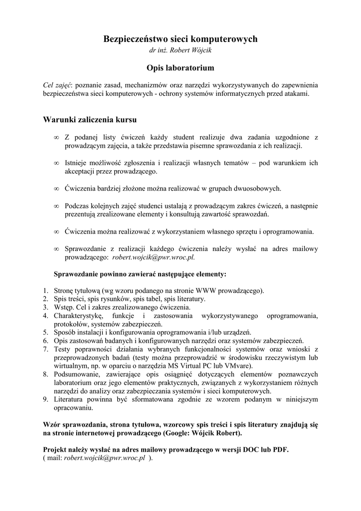 Bezpieczeństwo sieci komputerowych dr inż. Robert Wójcik Opis laboratorium Cel zajęć: poznanie zasad, mechanizmów oraz narzędzi wykorzystywanych do zapewnienia bezpieczeństwa sieci komputerowych - ochrony systemów informatycznych przed atakami. Warunki zaliczenia kursu • Z podanej listy ćwiczeń każdy student realizuje dwa zadania uzgodnione z prowadzącym zajęcia, a także przedstawia pisemne sprawozdania z ich realizacji. • Istnieje możliwość zgłoszenia i realizacji własnych tematów – pod warunkiem ich akceptacji przez prowadzącego. • Ćwiczenia bardziej złożone można realizować w grupach dwuosobowych. • Podczas kolejnych zajęć studenci ustalają z prowadzącym zakres ćwiczeń, a następnie prezentują zrealizowane elementy i konsultują zawartość sprawozdań. • Ćwiczenia można realizować z wykorzystaniem własnego sprzętu i oprogramowania. • Sprawozdanie z realizacji każdego ćwiczenia należy wysłać na adres mailowy prowadzącego: [email protected]. Sprawozdanie powinno zawierać następujące elementy: 1. 2. 3. 4. 5. 6. 7. 8. 9. Stronę tytułową (wg wzoru podanego na stronie WWW prowadzącego). Spis treści, spis rysunków, spis tabel, spis literatury. Wstęp. Cel i zakres zrealizowanego ćwiczenia. Charakterystykę, funkcje i zastosowania wykorzystywanego oprogramowania, protokołów, systemów zabezpieczeń. Sposób instalacji i konfigurowania oprogramowania i/lub urządzeń. Opis zastosowań badanych i konfigurowanych narzędzi oraz systemów zabezpieczeń. Testy poprawności działania wybranych funkcjonalności systemów oraz wnioski z przeprowadzonych badań (testy można przeprowadzić w środowisku rzeczywistym lub wirtualnym, np. w oparciu o narzędzia MS Virtual PC lub VMvare). Podsumowanie, zawierające opis osiągnięć dotyczących elementów poznawczych laboratorium oraz jego elementów praktycznych, związanych z wykorzystaniem różnych narzędzi do analizy oraz zabezpieczania systemów i sieci komputerowych. Literatura powinna być sformatowana zgodnie ze wzorem podanym w niniejszym opracowaniu. Wzór sprawozdania, strona tytułowa, wzorcowy spis treści i spis literatury znajdują się na stronie internetowej prowadzącego (Google: Wójcik Robert). Projekt należy wysłać na adres mailowy prowadzącego w wersji DOC lub PDF. ( mail: [email protected] ). Tematy laboratoriów 1. Zastosowanie programu Internet Anyware Toolkit lub innych (np. MTR, Axence): analiza połączeń TCP/IP, ustalanie adresów IP, śledzenie ścieżek połączeń, skanowanie portów i usług (Uwaga: na stronie tytułowej opisu podawać skrócone wersje, np. Zastosowanie programu Internet Anyware Toolkit do analizy połączeń internetowych). 2. Zastosowanie programu Nmap do analizy zabezpieczeń wybranych systemów operacyjnych: poznawanie wersji systemu operacyjnego, analiza usług serwera, skanowanie portów. 3. Analiza stanu zabezpieczeń i aktualizacji stacji roboczych w domenie Windows: stan aktualizacji, luki w systemie, problemy konfiguracyjne. Zastosowanie oprogramowania MS Baseline Security Analyzer lub Axence NetTools, Axence nVision). 4. Konfiguracja wielowarstwowego systemu zabezpieczeń sieci komputerowej w oparciu o zalecenia standardów bezpieczeństwa, np. konfigurowanie polityki haseł, ochrony plików. 5. Konfigurowanie systemu zabezpieczeń typu „firewalls” w oparciu o wybrane narzędzia (np. iptables, ISA Server, i inne). 6. Bezpieczeństwo haseł w systemach Windows oraz Linux. Obliczanie i łamanie haseł tworzonych z wykorzystaniem funkcji haszujących (np. MD5), szyfrów z dodatkiem „soli”. Zastosowanie narzędzi MDCrack, John the Ripper, pwdump2, SamInside, LC5, i innych, a także danych w postaci tęczowych tablic. 7. Zdalne logowanie do systemu bez użycia haseł z wykorzystaniem kluczy RSA oraz protokołu SSH. Konfigurowanie mechanizmu w środowisku Windows lub Linux. 8. Implementacja wybranego protokołu wymiany kluczy, np. Diffiego-Hellmana (konfiguracja parametrów protokołu dla wybranego zastosowania lub własny program ilustrujący działanie protokołu). 9. Implementacja wybranego protokołu wzajemnego uwierzytelniania użytkowników komunikacji sieciowej, np. protokół Needhama i Schroedera. 10. Zabezpieczanie komunikacji sieciowej – protokół Kerberos. Konfiguracja systemu w środowisku Windows lub Linux. 11. Zabezpieczanie komunikacji sieciowej – protokół Radius. Konfiguracja protokołu w środowisku Windows lub Linux. 12. Konfiguracja infrastruktury klucza publicznego PKI oparta o standard X.509. Urzędy certyfikacyjne (CA) główne i podrzędne, urzędy rejestracyjne (RA), podpisy cyfrowe, generowanie certyfikatów dla podmiotów, np. certyfikatu serwera WWW do obsługi protokołu SSL. Obsługa certyfikatów: żądanie, instalowanie, usuwanie, przeglądanie certyfikatów wystawionych i odwołanych. Uwierzytelnianie dostępu do sieci z wykorzystaniem certyfikatów (np. w sieciach bezprzewodowych). 13. Konfigurowanie bezpiecznych połączeń internetowych z wykorzystaniem protokołu SSL. Generowanie certyfikatów serwera i podmiotów. Wymuszanie szyfrowania połączeń. 14. Konfigurowanie bezpiecznych połączeń sieciowych z wykorzystaniem technologii VPN (ang. Virtual Private Network), np. w oparciu o narzędzie OpenVPN. 15. Zabezpieczanie poczty elektronicznej – systemy PGP lub PEM. Podpisywanie i szyfrowanie wiadomości pocztowych, plików, zarządzanie kluczami, rozpowszechnianie klucza publicznego. 16. Monitorowanie i przechwytywanie ruchu sieciowego. Analiza ruchu sieciowego dla połączeń na wybranych portach, np. połączeń z serwerem pocztowym wp.pl (POP3 port 110) w trybie otwartym i szyfrowanym SSL. Zastosowanie programów ethereal (wireshark) do uzyskania parametrów uwierzytelniania. 17. Konfigurowanie systemów wykrywania intruzów NIDS (ang. Network Intrusion Detection System) do pracy w trybie analizy ruchu sieciowego, rejestrowania pakietów, filtrowania strumieni pod 
