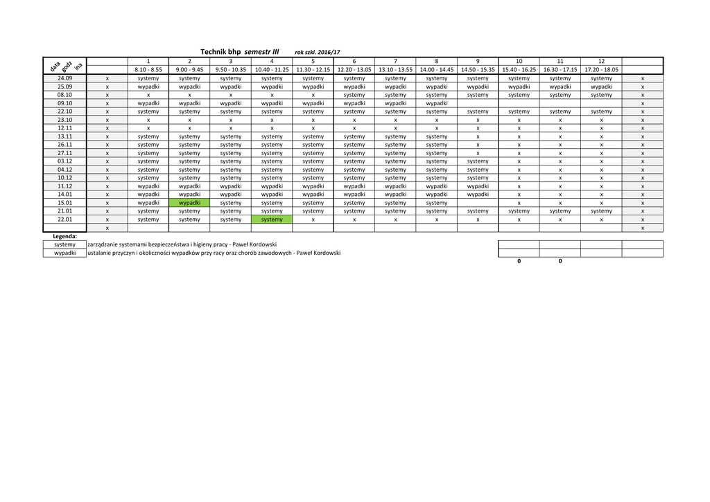 da ta go dz in a Technik bhp semestr III 24.09 25.09 08.10 09.10 22.10 23.10 12.11 13.11 26.11 27.11 03.12 04.12 10.12 11.12 14.01 15.01 21.01 22.01 Legenda: systemy wypadki x x x x x x x x x x x x x x x x x x x 1 8.10 - 8.55 systemy wypadki x wypadki systemy x x systemy systemy systemy systemy systemy systemy wypadki wypadki wypadki systemy systemy 2 9.00 - 9.45 systemy wypadki x wypadki systemy x x systemy systemy systemy systemy systemy systemy wypadki wypadki wypadki systemy systemy 3 9.50 - 10.35 systemy wypadki x wypadki systemy x x systemy systemy systemy systemy systemy systemy wypadki wypadki systemy systemy systemy 4 10.40 - 11.25 systemy wypadki x wypadki systemy x x systemy systemy systemy systemy systemy systemy wypadki wypadki systemy systemy systemy rok szkl. 2016/17 5 6 11.30 - 12.15 12.20 - 13.05 systemy systemy wypadki wypadki x systemy wypadki wypadki systemy systemy x x x x systemy systemy systemy systemy systemy systemy systemy systemy systemy systemy systemy systemy wypadki wypadki wypadki wypadki systemy systemy systemy systemy x x 7 13.10 - 13.55 systemy wypadki systemy wypadki systemy x x systemy systemy systemy systemy systemy systemy wypadki wypadki systemy systemy x 8 14.00 - 14.45 systemy wypadki systemy wypadki systemy x x systemy systemy systemy systemy systemy systemy wypadki wypadki systemy systemy x 9 14.50 - 15.35 systemy wypadki systemy 10 15.40 - 16.25 systemy wypadki systemy 11 16.30 - 17.15 systemy wypadki systemy 12 17.20 - 18.05 systemy wypadki systemy systemy x x x x x systemy systemy systemy wypadki wypadki systemy x x x x x x x x x x x systemy x systemy x x x x x x x x x x x systemy x systemy x x x x x x x x x x x systemy x 0 0 systemy x zarządzanie systemami bezpieczeostwa i higieny pracy - Paweł Kordowski ustalanie przyczyn i okoliczności wypadków przy racy oraz chorób zawodowych - Paweł Kordowski x x x x x x x x x x x x x x x x x x x