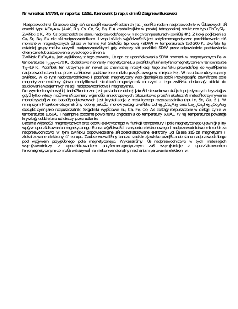 Nr wniosku: 147754, nr raportu: 12261. Kierownik (z rap.): dr inż. Zbigniew Bukowski Nadprzewodniki żelazowe stały się sensacją naukową ostatnich lat. Jedną z rodzin nadprzewodników żelazowych są arsenki typu AFe2 As2 (A=K, Rb, Cs, Ca, Sr, Ba, Eu) krystalizujące w prostej tetragonalnej strukturze typu ThCr2 Si2 . Związki z K, Rb, Cs przechodzą do stanu nadprzewodzącego w niskich temperaturach (poniżej 4K). Z kolei połączenia z Ca, Sr, Ba, Eu nie są nadprzewodnikami i wspólną ich właściwością jest antyferromagnetyczne porządkowanie się momentów magnetycznych żelaza w formie Fal Gęstości Spinowej (SDW) w temperaturach 150-200 K. Związki tej ostatniej grupy można uczynić nadprzewodzącymi gdy zniszczy się porządek SDW przez odpowiednie podstawienia chemiczne lub zastosowanie wysokiego ciśnienia. Związek EuFe2 As2 jest wyjątkowy z tego powodu, że oprócz uporządkowania SDW momentów magnetycznych Fe w temperaturze TSDW=170 K, dodatkowo momenty magnetyczne Eu porządkują się antyferromagnetycznie w temperaturze TN=19 K. Porządek ten utrzymuje się nawet po chemicznej modyfikacji tego związku prowadzącej do wystąpienia nadprzewodnictwa (np. przez częściowe podstawienie metalu przejściowego w miejsce Fe). W rezultacie otrzymujemy związek, w którym nadprzewodnictwo i porządek magnetyczny współistnieją ze sobą. Przykładając zewnętrzne pole magnetyczne możemy łatwo modyfikować strukturę magnetyczną co czyni z tego związku doskonały obiekt do studiowania wzajemnych relacji nadprzewodnictwa i magnetyzmu. Do wymienionych wyżej badań konieczne jest posiadanie dobrej jakości stosunkowo dużych pojedynczych kryształow gdyż tylko wtedy możliwe są pomiary własności anizotropowych. Stosunkowo prostą i skuteczną metodą otrzymywania monokryształów do badań podstawowych jest krystalizacja z metalicznego rozpuszczalnika (np. In, Sn, Ga, …). W niniejszym Projekcie otrzymaliśmy dobrej jakości monokryształy związku EuFe2-xCox As2 oraz Eu1-yCay Fe2-xCox As 2 stosując cynę jako rozpuszczalnik. Składniki wyjściowe Eu, Ca, Fe, Co, As zostały rozpuszczone w ciekłej cynie w temperaturze 1050°C i następnie poddane powolnemu chłodzeniu do temperatury 600°C. W tej temperaturze powstałe kryształy oddzielono od cieczy przez odlanie. Badania własności magnetycznych oraz oporu elektrycznego w funkcji temperatury i pola magnetycznego ujawniły silny wpływ uporządkowania magnetycznego Eu na właściwości transportu elektronowego i nadprzewodnictwo mimo że za nadprzewodnictwo w tym związku odpowiedzialne są zdelokalizowane elektrony 3d żelaza zaś za magnetyzm – zlokalizowane elektrony 4f europu. Zaobserwowaliśmy bardzo rzadkie zjawisko przejścia do stanu nadprzewodzącego pod wpływem przyłożonego pola magnetycznego. Wykazaliśmy, że nadprzewodnictwo w tych materiałach współzawodniczy z uporządkowaniem antyferromagnetycznym zaś współistnieje z uporządkowaniem ferromagnetycznym co może wskazywać na niekonwencjonalny mechanizm parowania elektronów.