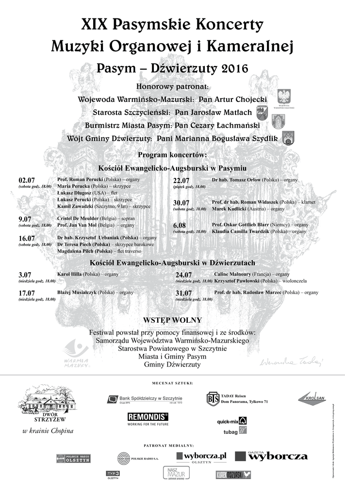 XIX Pasymskie Koncerty Muzyki Organowej i Kameralnej Pasym – Dźwierzuty 2016 Honorowy patronat: Wojewoda Warmińsko-Mazurski: Pan Artur Chojecki Starosta Szczycieński: Pan Jarosław Matłach Burmistrz Miasta Pasym: Pan Cezary Łachmański Wójt Gminy Dźwierzuty: Pani Marianna Bogusława Szydlik Program koncertów: Kościół ewangelicko-augsburski w Pasymiu 02.07 (sobota godz. 18.00) 9.07 (sobota godz. 18.00) 16.07 (sobota godz. 18.00) Prof. roman Perucki (Polska) – organy maria Perucka (Polska) – skrzypce Łukasz długosz (USA) – flet Łukasz Perucki (Polska) – skrzypce Kamil Zawadzki (Szczytno, 9 lat) – skrzypce 22.07 dr hab. Tomasz Orlow (Polska) – organy 30.07 Prof. dr hab. roman Widaszek (Polska) – klarnet marek Kudlicki (Austria) – organy 6.08 Prof. Oskar Gottlieb Blarr (Niemcy) – organy Klaudia Camilla Twardzik (Polska) – organy (piątek godz. 18.00) (sobota godz. 18.00) Cristel de meulder (Belgia) – sopran Prof. Jan Van mol (Belgia) – organy dr hab. Krzysztof Urbaniak (Polska) – organy dr Teresa Piech (Polska) – skrzypce barokowe magdalena Pilch (Polska) – flet traverso (sobota godz. 18.00) Kościół ewangelicko-augsburski w dźwierzutach 3.07 Karol Hilla (Polska) – organy 24.07 17.07 Błażej musiałczyk (Polska) – organy 31.07 Caline malnoury (Francja) – organy (niedziela godz. 18.00) Krzysztof Pawłowski (Polska) – wiolonczela (niedziela godz. 18.00) (niedziela godz. 18.00) Prof. dr hab. radosław marzec (Polska) – organy (niedziela godz. 18.00) WSTĘP WOLNY Festiwal powstał przy pomocy finansowej i ze środków: Samorządu Województwa Warmińsko-Mazurskiego Starostwa Powiatowego w Szczytnie Miasta i Gminy Pasym Gminy Dźwierzuty m e C e N aT S Z T U K i: TadaY reisen dom Panorama, Tylkowo 71 w krainie Chopina PaT r O N aT m e d i a L N Y: POLSKie radiO S.a. Opracowanie i druk: agencja reklamowo-Wydawnicza a. Grzegorczyk, www.grzeg.com.pl 0 C - 0 M - 0 Y - 15 K