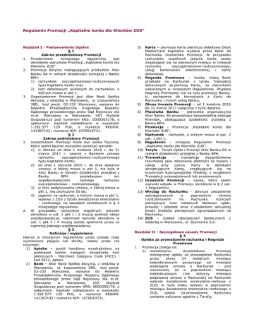 Regulamin Promocji „Kapitalne konto dla Klientów ZUS” Rozdział I - Postanowienia Ogólne §1 Zakres przedmiotowy Promocji 1. Przedmiotem niniejszego regulaminu jest określenie warunków Promocji „Kapitalne Konto dla Klientów ZUS”. 2. Promocja dotyczy następujących produktów Alior Banku SA w ramach działalności przejętej z Banku BPH: 1) rachunków oszczędnościowo-rozliczeniowych typu Kapitalne Konto oraz 2) kart debetowych wydanych do rachunków, o których mowa w pkt 1. 3. Organizatorem Promocji jest Alior Bank Spółka Akcyjna, z siedzibą w Warszawie, ul. Łopuszańska 38D, kod poczt. 02-232 Warszawa, wpisana do Rejestru Przedsiębiorców Krajowego Rejestru Sądowego prowadzonego przez Sąd Rejonowy dla m.st. Warszawy w Warszawie, XIII Wydział Gospodarczy pod numerem KRS: 0000305178, o opłaconym kapitale zakładowym w wysokości 1 292 577 120 PLN, o numerze REGON: 141387142 i numerze NIP: 1070010731. §2 Zakres podmiotowy Promocji 1. Uczestnikiem Promocji może być osoba fizyczna, która spełni łącznie wszystkie poniższe warunki: 1) w okresie od dnia 1 kwietnia 2015 r. do 31 marca 2017 r. zawrze z Bankiem umowę rachunku oszczędnościowo-rozliczeniowego typu Kapitalne Konto, 2) od dnia 1 stycznia 2015 r. do dnia zawarcia umowy, o której mowa w pkt 1, nie była w Alior Banku w ramach działalności przejętej z Banku BPH posiadaczem ani współposiadaczem żadnego rachunku oszczędnościowo – rozliczeniowego, 3) w dniu podpisywania umowy, o której mowa w pkt 1, ma ukończone 55 lat, 4) zapewni na rachunek, o którym mowa w pkt 1, wpływy z ZUS z tytułu świadczenia emerytalno – rentowego, na zasadach określonych w § 4 niniejszego regulaminu. 2. W przypadku rachunków wspólnych warunki określone w ust. 1 pkt 1 i 2 muszą spełniać oboje współposiadacze, natomiast warunki określone w ust. 1 pkt 3 i 4 muszą zostać spełnione przez co najmniej jednego współposiadacza. §3 Definicje i wyjaśnienia Ilekroć w niniejszym regulaminie użyte zostały niżej wymienione pojęcia lub skróty, należy przez nie rozumieć: 1) Apteka – punkt handlowy wyodrębniony na podstawie kodów kategorii akceptanta kart płatniczych - Merchant Category Code (MCC) kod 5912, Apteki. 2) Bank – Alior Bank Spółka Akcyjna, z siedzibą w Warszawie, ul. Łopuszańska 38D, kod poczt. 02-232 Warszawa, wpisana do Rejestru Przedsiębiorców Krajowego Rejestru Sądowego prowadzonego przez Sąd Rejonowy dla m.st. Warszawy w Warszawie, XIII Wydział Gospodarczy pod numerem KRS: 0000305178, o opłaconym kapitale zakładowym w wysokości 1 292 577 120 PLN, o numerze REGON: 141387142 i numerze NIP: 1070010731, 3) 4) 5) 6) 7) 8) 9) 10) 11) 12) 13) 14) Karta – pierwsza karta płatnicza debetowa Debit MasterCard Kapitalna wydana przez Bank do Rachunku Uczestnika Promocji. W przypadku rachunków wspólnych jedynie Karta osoby znajdującej się na pierwszym miejscu w Umowie rachunku oszczędnościowo-rozliczeniowego, usług bankowości elektronicznej i karty debetowej. Nagroda Premiowa – kwota, którą Bank przekaże na Rachunek z tytułu Transakcji dokonanych za pomocą Karty, na warunkach wskazanych w niniejszym Regulaminie. Wypłata Nagrody Premiowej ma na celu promocję Banku, tj. zachęcenie do korzystania z Karty do Rachunku i innych usług Banku, Okres trwania Promocji – od 1 kwietnia 2015 do 31 marca 2017 (włącznie z tymi datami), Placówka Banku - jednostka organizacyjna Alior Banku SA prowadząca bezpośrednią obsługę Klientów, obsługująca działalność przejętą z Banku BPH, Promocja – Promocja „Kapitalne konto dla Klientów ZUS”, Rachunek - rachunek, o którym mowa w par. 2 ust. 1 pkt 1, Regulamin – niniejszy Regulamin Promocji „Kapitalne konto dla Klientów ZUS”, Taryfa - Taryfa Opłat i Prowizji Alior Banku SA w ramach działalności przejętej z Banku BPH, Transakcja – transakcja bezgotówkowa rozumiana jako dokonanie płatności za towary i usługi przy użyciu Karty w Aptekach akceptujących Kartę, znajdujących się na terytorium Rzeczpospolitej Polskiej, z wyjątkiem Transakcji unieważnionych lub anulowanych. Uczestnik Promocji – osoba, która spełni warunki udziału w Promocji, określone w § 2 ust. 1 Regulaminu. Wyciąg do Rachunku - zbiorcze zestawienie zaksięgowanych w poprzednim okresie rozliczeniowym na Rachunku rozliczeń pieniężnych oraz należnych Bankowi opłat, prowizji i odsetek wraz z ustaleniem aktualnej kwoty środków pieniężnych zgromadzonych na Rachunku. ZUS – Zakład Ubezpieczeń Społecznych z siedzibą w Warszawie, ul. Szamocka 3,5. Rozdział II - Szczegółowe zasady Promocji §4 Opłata za prowadzenie rachunku i Nagroda Premiowa 1. Promocja polega na: 1) nienaliczeniu Uczestnikowi Promocji miesięcznej opłaty za prowadzenie Rachunku przez okres 24 kolejnych miesięcy kalendarzowych poczynając od miesiąca podpisania umowy o Rachunek - pod warunkiem, że w poprzednim miesiącu kalendarzowym (nie dotyczy miesiąca podpisania umowy o Rachunek) na Rachunek wpłynie świadczenie emerytalno-rentowe z ZUS; w razie braku wpływu w poprzednim miesiącu świadczenia emerytalno-rentowego z ZUS, opłata za prowadzenie Rachunku zostanie naliczona zgodnie z Taryfą; 2) 2. 3. 4. 5. 6. 7. przyznaniu Uczestnikowi Promocji, który w Okresie trwania Promocji złoży wniosek o wydanie Karty do Rachunku, Nagrody Premiowej w wysokości 5% wartości Transakcji zaksięgowanych na Rachunku w miesiącu kalendarzowym poprzedzającym przekazanie Nagrody Premiowej, nie więcej jednak niż 30 zł w danym miesiącu kalendarzowym, co miesiąc poczynając od miesiąca następującego po miesiącu, w którym złożony został wniosek o Kartę, maksymalnie przez okres 24 kolejnych miesięcy kalendarzowych licząc od miesiąca podpisania umowy o Rachunek. Nagroda Premiowa zostanie przekazana na Rachunek Uczestnika Promocji, który spełni warunki jej przyznania, do końca miesiąca kalendarzowego następującego po miesiącu, w któ