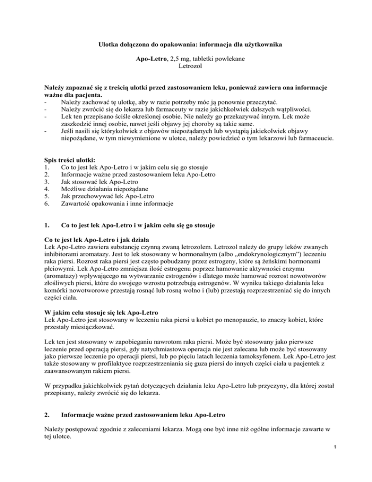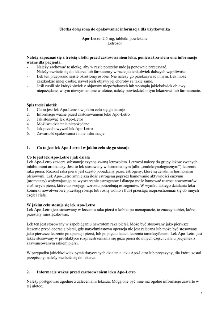 Ulotka dołączona do opakowania: informacja dla użytkownika Apo-Letro, 2,5 mg, tabletki powlekane Letrozol Należy zapoznać się z treścią ulotki przed zastosowaniem leku, ponieważ zawiera ona informacje ważne dla pacjenta. Należy zachować tę ulotkę, aby w razie potrzeby móc ją ponownie przeczytać. Należy zwrócić się do lekarza lub farmaceuty w razie jakichkolwiek dalszych wątpliwości. Lek ten przepisano ściśle określonej osobie. Nie należy go przekazywać innym. Lek może zaszkodzić innej osobie, nawet jeśli objawy jej choroby są takie same. Jeśli nasili się którykolwiek z objawów niepożądanych lub wystąpią jakiekolwiek objawy niepożądane, w tym niewymienione w ulotce, należy powiedzieć o tym lekarzowi lub farmaceucie. Spis treści ulotki: 1. Co to jest lek Apo-Letro i w jakim celu się go stosuje 2. Informacje ważne przed zastosowaniem leku Apo-Letro 3. Jak stosować lek Apo-Letro 4. Możliwe działania niepożądane 5. Jak przechowywać lek Apo-Letro 6. Zawartość opakowania i inne informacje 1. Co to jest lek Apo-Letro i w jakim celu się go stosuje Co te jest lek Apo-Letro i jak działa Lek Apo-Letro zawiera substancję czynną zwaną letrozolem. Letrozol należy do grupy leków zwanych inhibitorami aromatazy. Jest to lek stosowany w hormonalnym (albo „endokrynologicznym”) leczeniu raka piersi. Rozrost raka piersi jest często pobudzany przez estrogeny, które są żeńskimi hormonami płciowymi. Lek Apo-Letro zmniejsza ilość estrogenu poprzez hamowanie aktywności enzymu (aromatazy) wpływającego na wytwarzanie estrogenów i dlatego może hamować rozrost nowotworów złośliwych piersi, które do swojego wzrostu potrzebują estrogenów. W wyniku takiego działania leku komórki nowotworowe przestają rosnąć lub rosną wolno i (lub) przestają rozprzestrzeniać się do innych części ciała. W jakim celu stosuje się lek Apo-Letro Lek Apo-Letro jest stosowany w leczeniu raka piersi u kobiet po menopauzie, to znaczy kobiet, które przestały miesiączkować. Lek ten jest stosowany w zapobieganiu nawrotom raka piersi. Może być stosowany jako pierwsze leczenie przed operacją piersi, gdy natychmiastowa operacja nie jest zalecana lub może być stosowany jako pierwsze leczenie po operacji piersi, lub po pięciu latach leczenia tamoksyfenem. Lek Apo-Letro jest także stosowany w profilaktyce rozprzestrzeniania się guza piersi do innych części ciała u pacjentek z zaawansowanym rakiem piersi. W przypadku jakichkolwiek pytań dotyczących działania leku Apo-Letro lub przyczyny, dla której został przepisany, należy zwrócić się do lekarza. 2. Informacje ważne przed zastosowaniem leku Apo-Letro Należy postępować zgodnie z zaleceniami lekarza. Mogą one być inne niż ogólne informacje zawarte w tej ulotce. 1 Kiedy nie stosować leku Apo-Letro: jeśli pacjentka ma uczulenie na letrozol lub którykolwiek z pozostałych składników tego leku (wymienione w punkcie 6), jeśli pacjentka nadal miesiączkuje, tzn. jest jeszcze przed menopauzą, jeśli pacjentka jest w ciąży, jeśli pacjentka karmi piersią. Nie stosować leku, jeśli którykolwiek z tych punktów dotyczy pacjentki - należy poradzić się lekarza. Ostrzeżenia i środki ostrożności Przed rozpoczęciem stosowania leku Apo-Letro należy zwrócić się do lekarza lub farmaceuty jeśli u pacjentki występuje ciężka choroba nerek, jeśli u pacjentki występuje ciężka choroba wątroby, w przypadku osteoporozy lub gdy u pacjentki wystąpiły wcześniej złamania kości (patrz także punkt "Kontrola podczas leczenia lekiem Apo-Letro” w punkcie 3). Jeśli którykolwiek z tych punktów dotyczy pacjentki, należy powiedzieć o tym lekarzowi. Lekarz weźmie pod uwagę te informacje w czasie leczenia lekiem Apo-Letro. Dzieci i młodzież (w wieku poniżej 18 lat) Nie należy stosować tego leku u dzieci i młodzieży. Pacjentki w podeszłym wieku (65 lat i starsze) Pacjentki w wieku 65 lat i starsze mogą stosować lek w takich samych dawkach jak inne dorosłe pacjentki. Inne leki i Apo-Letro Należy powiedzieć lekarzowi lub farmaceucie o wszystkich lekach stosowanych obecnie lub ostatnio, a także o lekach, które pacjentka planuje stosować, w tym także lekach dostępnych bez recepty. Ciąża, karmienie piersią i wpływ na płodność Lek Apo-Letro należy stosować wyłącznie wtedy, kiedy pacjentka jest po menopauzie. Jednak lekarz omówi z pacjentką konieczność stosowania skutecznej metody zapobiegania ciąży, ponieważ pacjentka może nadal zajść w ciążę podczas leczenia lekiem Apo-Letro. Nie wolno stosować leku Apo-Letro, jeśli pacjentka jest w ciąży lub karmi piersią, ponieważ leczenie może mieć szkodliwy wpływ na dziecko. Prowadzenie pojazdów i obsługiwanie maszyn Jeśli u pacjentki wystąpią zawroty głowy, uczucie zmęczenia, senność lub ogólnie złe samopoczucie, nie może ona prowadzić samochodu, obsługiwać narzędzi i urządzeń mechanicznych, aż do chwili, gdy samopoczucie pacjentki będzie znowu prawidłowe. 3. Jak stosować lek Apo-Letro Lek Apo-Letro należy zawsze stosować zgodnie z zaleceniami lekarza. W razie wątpliwości należy zwrócić się do lekarza lub farmaceuty. Zazwyczaj stosowana dawka to jedna tabletka leku Apo-Letro przyjmowana raz na dobę. Przyjmowanie leku Apo-Letro o tej samej porze każdego dnia ułatwia zapamiętanie, kiedy należy zażyć tabletkę. Tabletkę można przyjmować z posiłkiem lub bez posiłku i zawsze należy ją połykać w całości popijając szklanką wody lub innego płynu. 2 Jak długo stosować lek Apo-Letro Należy przyjmować lek Apo-Letro codziennie tak długo, jak to zalecił lekarz. Może zajść konieczność przyjmowania leku przez kilka miesięcy, a nawet lat. W razie jakichkolwiek pytań o to, jak długo przyjmować lek Apo-Letro, należy zwrócić się do lekarza. Kontrola podczas leczenia lekiem Apo-Letro Ten lek należy zawsze stosować pod ścisłym nadzorem me