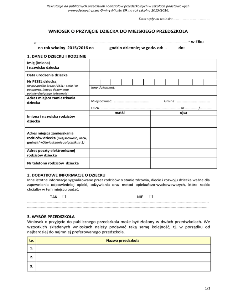 WNIOSEK O PRZYJĘCIE DZIECKA DO MIEJSKIEGO PRZEDSZKOLA