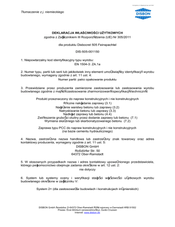 Tłumaczenie z j. niemieckiego DEKLARACJA WŁAŚCIWOŚCI UŻYTKOWYCH zgodna z Załącznikiem III Rozporządzenia (UE) Nr 305/2011 dla produktu Disbocret 505 Feinspachtel DIS-505-001150 1. Niepowtarzalny kod identyfikacyjny typu wyrobu: EN 1504-3: ZA.1a 2. Numer typu, partii lub serii lub jakikolwiek inny element umożliwiający identyfikację wyrobu budowlanego, wymagany zgodnie z art. 11 ust. 4: Numer partii: patrz opakowanie produktu 3. Przewidziane przez producenta zamierzone zastosowanie lub zastosowania wyrobu budowlanego zgodnie z mającą zastosowanie zharmonizowaną specyfikacją techniczną: Produkt przeznaczony do napraw konstrukcyjnych i nie konstrukcyjnych Ręczne nakładanie zaprawy (3.1) Nałożenie warstwy betonu lub zaprawy (3.2) Natryskiwanie betonu lub zaprawy (3.3) Nadkład zaprawy lub betonu (4.4) Zwiększenie grubości otuliny przez dodanie zaprawy lub betonu (7.1) Wymiana skażonego lub skarbonatyzowanego betonu (7.2) Zaprawa typu PCC do napraw konstrukcyjnych i nie konstrukcyjnych (na bazie cementu hydraulicznego) 4. Nazwa, zastrzeżona nazwa handlowa lub zastrzeżony znak towarowy oraz adres kontaktowy producenta, wymagany zgodnie z art. 11 ust. 5: DISBON GmbH Roßdörfer Str. 50 64372 Ober-Ramstadt 5. W stosownych przypadkach nazwa i adres kontaktowy upoważnionego przedstawiciela, którego pełnomocnictwo obejmuje zadania określone w art. 12 ust. 2: nie dotyczy 6. System lub systemy oceny i weryfikacji stałości właściwości użytkowych wyrobu budowlanego określone w załączniku V: System 2+ (dla zastosowań w budowlach i konstrukcjach inżynierskich) DISBON GmbH • siedziba: D-64372 Ober-Ramstadt • Sąd rejonowy w Darmstadt HRB 91502 Prezes: Öcal Altinkum (przewodniczący), Guido Cruzsen Internet: www.disbon.de Tłumaczenie z j. niemieckiego 7. W przypadku deklaracji właściwości użytkowych dotyczącej wyrobu budowlanego objętego normą zharmonizowaną: EN 1504-3: System 2+ Jednostka notyfikowana "KIWA Polymer Institut, Quellenstraße 3, 65439 Flörsheim-Wicker " numer identyfikacyjny 1119 przeprowadziła wstępny audyt zakładu produkcyjnego i zakładowej kontroli produkcji oraz prowadzi stały nadzór, ocenę i akceptację zgodnie z systemem 2 +, wydała: Certyfikat zgodności zakładowej kontroli produkcji Nr. 1119 - CPR – 0950 8. W przypadku deklaracji właściwości użytkowych dotyczącej wyrobu budowlanego, dla którego wydana została europejska ocena techniczna: nie dotyczy 9. Deklarowane właściwości użytkowe Zasadnicze charakterystyki Wytrzymałość na ściskanie Zawartość jonów chlorkowych Współczynnik rozszerzalności cieplnej Wodochłonność kapilarna ≤0,05% 4) Reakcja na ogień Substancje niebezpieczne 2) Zharmonizowana specyfikacja techniczna Klasa R3 1) Przyczepność 2) Ograniczony skurcz / pęcznienie 1) 3) Odporność na karbonatyzację Moduł sprężystości Kompatybilność dot. zmian temperatury Uszorstnienie 1) Właściwości użytkowe ≥1,5 MPa NPD NPD NPD ≥1,5 MPa NPD EN 1504-3:2005 NPD NPD Klasa E NPD Tylko w naprawie zbrojonego betonu ; Nie wymagane jeżeli przeprowadzono badanie kompatybilności ; 3) Nie wymagane jeżeli system ochrony w tym System OS obejmuje sprawdzoną ochronę przed karbonatyzacją lub jest zaprawą PC (patrz EN 1504-2) ; 4) Tylko dla polimerobetonu (PC). 10. Właściwości użytkowe wyrobu określone w pkt 1 i 2 są zgodne z właściwościami użytkowymi deklarowanymi w pkt 9. Niniejsza deklaracja właściwości użytkowych wydana zostaje na wyłączną odpowiedzialność producenta określonego w pkt 4. W imieniu producenta podpisał: Jürgen Kirchbaum, kierownik działu Produktmanagement (-) podpis nieczytelny Ober-Ramstadt, 1 lipca 2013 DISBON GmbH • siedziba: D-64372 Ober-Ramstadt • Sąd rejonowy w Darmstadt HRB 91502 Prezes: Öcal Altinkum (przewodniczący), Guido Cruzsen Internet: www.disbon.de