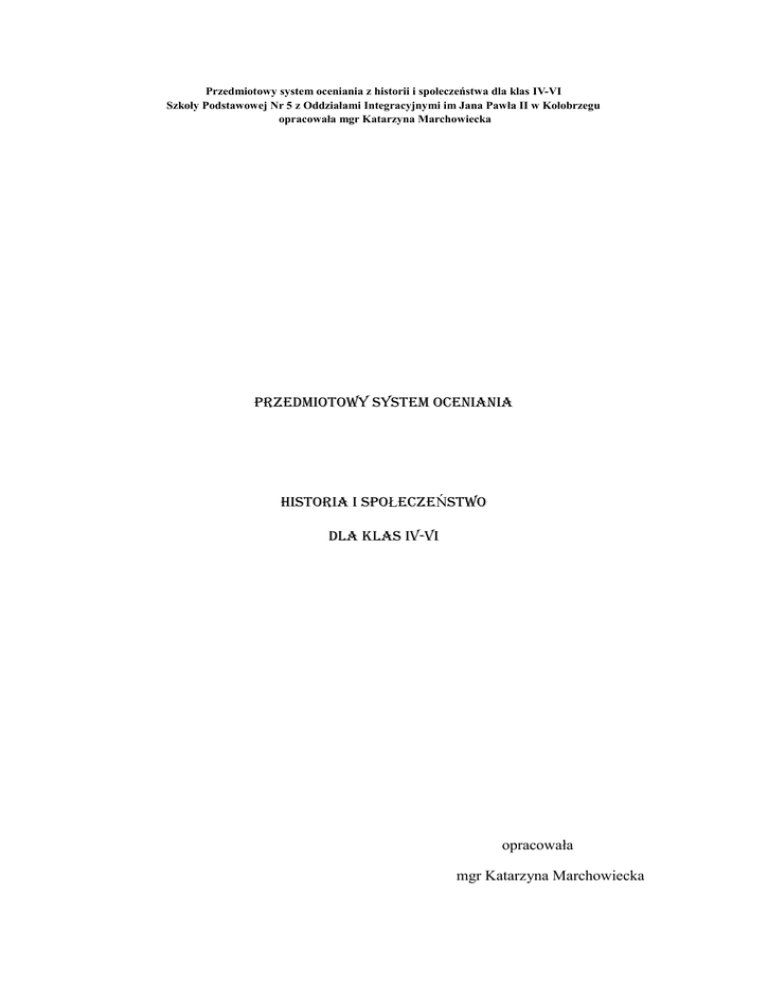 Przedmiotowy system oceniania z historii i społeczeństwa dla klas IV-VI Szkoły Podstawowej Nr 5 z Oddziałami Integracyjnymi im Jana Pawła II w Kołobrzegu opracowała mgr Katarzyna Marchowiecka PRZEDMIOTOWY SYSTEM OCENIANIA HISTORIA I SPOŁECZEŃSTWO DLA KLAS IV-VI opracowała mgr Katarzyna Marchowiecka Przedmiotowy system oceniania z historii i społeczeństwa dla klas IV-VI Szkoły Podstawowej Nr 5 z Oddziałami Integracyjnymi im Jana Pawła II w Kołobrzegu opracowała mgr Katarzyna Marchowiecka PODSTAWA PRAWNA USTAWĄ z dnia 20 lutego 2015 r. o zmianie ustawy o systemie oświaty oraz niektórych innych ustaw, Rozdział 3a (Dz. U. z 2015 r. poz. 357) 7. Rozporządzeniem MEN z dnia 10 czerwca 2015 r. w sprawie szczegółowych warunków i sposobu oceniania, klasyfikowania i promowania uczniów i słuchaczy w szkołach publicznych. 8. Rozporządzeniem MEN z dnia 25 czerwca 2015 r. w sprawie szczegółowych warunków i sposobu przeprowadzania sprawdzianu, egzaminu gimnazjalnego i egzaminu matura Przedmiotowy system oceniania z historii i społeczeństwa dla klas IV-VI Szkoły Podstawowej Nr 5 z Oddziałami Integracyjnymi im Jana Pawła II w Kołobrzegu opracowała mgr Katarzyna Marchowiecka Spis treści: I Kontrakt z uczniami i rodzicami. II Narzędzia, czas pomiaru i obserwacji ucznia. III Obszary aktywności. IV Kryteria oceny semestralnej i rocznej. V Dostosowania edukacyjne VI Informacja zwrotna ( nauczyciel – uczeń, nauczyciel – rodzic, nauczyciel – wychowawca klasy – pedagog). VII Ewaluacja przedmiotowego systemu oceniania. Przedmiotowy system oceniania z historii i społeczeństwa dla klas IV-VI Szkoły Podstawowej Nr 5 z Oddziałami Integracyjnymi im Jana Pawła II w Kołobrzegu opracowała mgr Katarzyna Marchowiecka I. KONTRAKT Z UCZNIEM I RODZICAMI Każdy uczeń: prowadzi zeszyt przedmiotowy (60 kartkowy w kratkę) w razie nieobecności ma obowiązek uzupełniać go systematycznie posiada zestaw podręczników do historii (podręcznik i zeszyt ćwiczeń) uczeń ma obowiązek czytania tematu w podręczniku systematycznie wykonuje zadania domowe brak zadania zgłasza przed lekcją Braki oznacza się w dzienniku elektronicznym znakiem minus. Znaki te mają wpływ na ocenę końcową, jeśli ich liczba przekroczy trzy w ciągu każdego semestru będą sprawdziany i niezapowiedziane kartkówki nawiązujące do problematyki działu lub kilku ostatnich lekcji uczniowie oceniani będą za: odpowiedzi ustne, znajomość zagadnień z podręcznika i spoza niego, prace pisemne, zadania dodatkowe, aktywność na lekcji i pracę w grupach wszyscy mają prawo do poprawienia ocen poniżej oceny dobrej ze sprawdzianów i kartkówek w terminie ustalonym przez nauczyciela, poprawiona ocena jest wstawiana zamiast poprawionej, szczególne osiągnięcia, np. konkursy itp. mają wpływ na ocenę celującą wszyscy uczniowie zobowiązani są dbać o to, by poznawać najważniejsze wydarzenia z historii Polski i rozumieć ich znaczenie dla przyszłości naszego kraju uczniowie potrafią korzystać z mapy i czytać ją. Przedmiotowy system oceniania z historii i społeczeństwa dla klas IV-VI Szkoły Podstawowej Nr 5 z Oddziałami Integracyjnymi im Jana Pawła II w Kołobrzegu opracowała mgr Katarzyna Marchowiecka II. NARZĘDZIA, CZAS POMIARU I OBSERWACJI UCZNIA Pomiar osiągnięć uczniów odbywa się za pomocą takich narzędzi jak: zapowiedziane (z tygodniowym wyprzedzeniem) prace klasowe, sprawdziany i klasówki obejmujące materiał działu lub jego części (czas oceny i poprawy wyznacza nauczyciel),testy diagnostyczne na początek i koniec roku szkolnego prowadzenie zeszytu przedmiotowego i zeszytu ćwiczeń niezapowiedziane kartkówki (materiał z 3 ostatnich lekcji, ocenione w ciągu tygodnia) odpowiedzi ustne zadania domowe pisemne i ustne (prace krótko- i długoterminowe) samodzielne i grupowe prace na lekcji aktywność podczas lekcji uczeń może zgłosić nieprzygotowanie do lekcji bez konsekwencji, raz w semestrze na zajęciach odbywających się w raz w tygodniu; 2 razy w semestrze na pozostałych zajęciach uczeń, który nie zgłosił nieprzygotowania otrzymuje ocenę niedostateczną na lekcjach powtórkowych i sprawdzianie nie można zgłaszać nieprzygotowania Rodzaj pracy pisemnej W ciągu dnia Praca klasowa/sprawdzian Kartkówka W ciągu tygodnia 1 Bez ograniczeń 2 Bez ograniczeń zadanie domowe powinno być dla wszystkich uczniów formą ćwiczenia wiadomości i umiejętności zdobytych na lekcji (zasady sprawdzania: na każdej lekcji wyrywkowo, 2 -3 w semestrze całościowo, brak zadania oznacza się znakiem kółka lub kreski, zadanie wykonane oznacza się krzyżykiem lub oceną) wszelkie plagiaty karane są oceną niedostateczną Przedmiotowy system oceniania z historii i społeczeństwa dla klas IV-VI Szkoły Podstawowej Nr 5 z Oddziałami Integracyjnymi im Jana Pawła II w Kołobrzegu opracowała mgr Katarzyna Marchowiecka uczeń, który nie odrabia zadania domowego otrzymuje ocenę niedostateczną po dwóch nie odrobionych zadaniach w semestrze (oceny niedostateczne za brak zadania domowego mają wpływ na oceną śródroczną lub roczną) obserwacja ucznia: - przygotowanie do lekcji - systematyczność i pilność - samodzielność - prezentacja własnej pracy - chęć do podejmowania zadań dodatkowych - zachowanie i praca podczas lekcji O planowanych formach pomiaru uczniowie będą odpowiednio wcześniej informowani, podobnie jak o sposobie i czasie poprawiania ocen niedostatecznych. Z regulaminowym wyprzedzeniem uczniowie zagrożeni oceną niedostateczną zostaną, podobnie jak ich rodzice poinformowani. Uczeń oceniany będzie ocena kształtującą raz w semestrze w formie pisemnej lub ustnej. III. OBSZARY AKTYWNOŚCI Każdy uczeń ma możliwość wykazania się wiadomościami i umiejętnościami podczas następujących czynności: podczas lekcji: - ćwiczenia w operowaniu pojęciami historycznymi - sprawdziany i kartkówki - odpowiedzi ustne - znajomo
