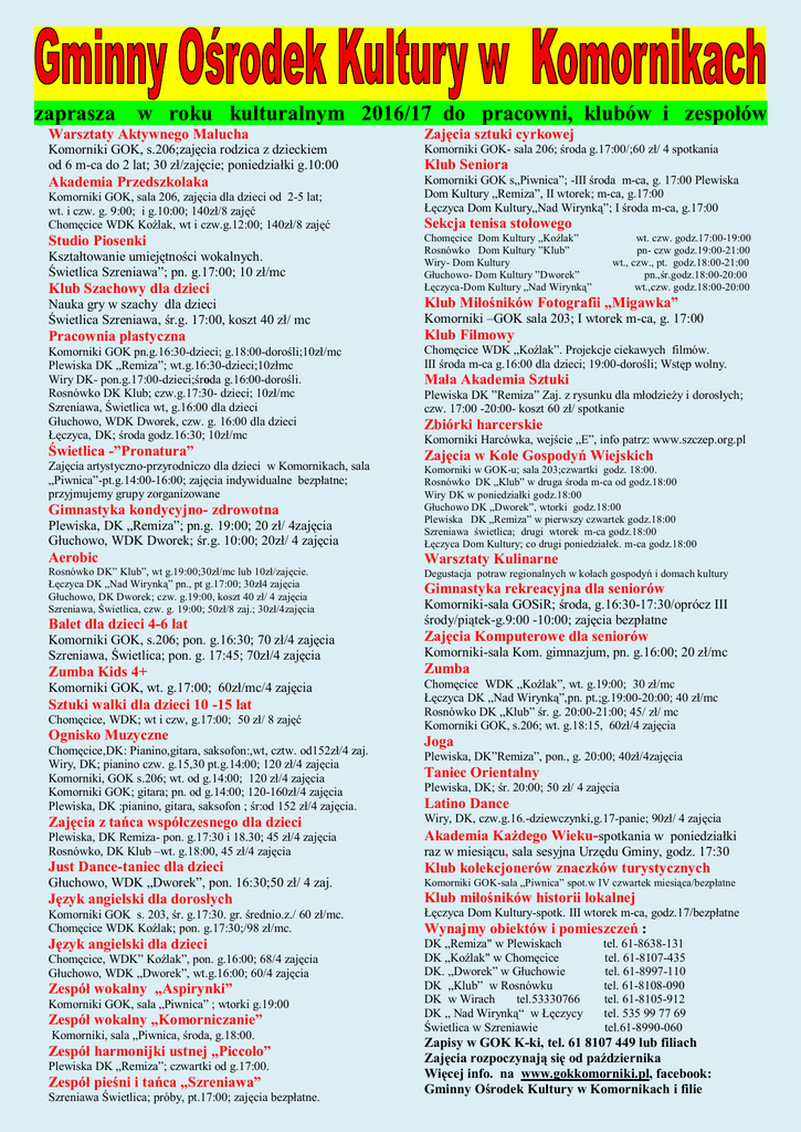 zaprasza w roku kulturalnym 2016/17 do pracowni, klubów i zespołów Warsztaty Aktywnego Malucha Komorniki GOK, s.206;zajęcia rodzica z dzieckiem od 6 m-ca do 2 lat; 30 zł/zajęcie; poniedziałki g.10:00 Akademia Przedszkolaka Komorniki GOK, sala 206, zajęcia dla dzieci od 2-5 lat; wt. i czw. g. 9:00; i g.10:00; 140zł/8 zajęć Chomęcice WDK Koźlak, wt i czw.g.12:00; 140zł/8 zajęć Studio Piosenki Kształtowanie umiejętności wokalnych. Świetlica Szreniawa”; pn. g.17:00; 10 zł/mc Klub Szachowy dla dzieci Nauka gry w szachy dla dzieci Świetlica Szreniawa, śr.g. 17:00, koszt 40 zł/ mc Pracownia plastyczna Zajęcia sztuki cyrkowej Komorniki GOK- sala 206; środa g.17:00/;60 zł/ 4 spotkania Klub Seniora Komorniki GOK s„Piwnica”; -III środa m-ca, g. 17:00 Plewiska Dom Kultury „Remiza”, II wtorek; m-ca, g.17:00 Łęczyca Dom Kultury„Nad Wirynką”; I środa m-ca, g.17:00 Sekcja tenisa stołowego Chomęcice Dom Kultury „Koźlak” Rosnówko Dom Kultury ”Klub” Wiry- Dom Kultury Głuchowo- Dom Kultury ”Dworek” Łęczyca-Dom Kultury „Nad Wirynką” wt. czw. godz.17:00-19:00 pn- czw godz.19:00-21:00 wt., czw., pt. godz.18:00-21:00 pn.,śr.godz.18:00-20:00 wt.,czw. godz.18:00-20:00 Klub Miłośników Fotografii „Migawka” Komorniki –GOK sala 203; I wtorek m-ca, g. 17:00 Klub Filmowy Komorniki GOK pn.g.16:30-dzieci; g.18:00-dorośli;10zł/mc Plewiska DK „Remiza”; wt.g.16:30-dzieci;10złmc Wiry DK- pon.g.17:00-dzieci;środa g.16:00-dorośli. Rosnówko DK Klub; czw.g.17:30- dzieci; 10zł/mc Szreniawa, Świetlica wt, g.16:00 dla dzieci Głuchowo, WDK Dworek, czw. g. 16:00 dla dzieci Łęczyca, DK; środa godz.16:30; 10zł/mc Chomęcice WDK „Koźlak”. Projekcje ciekawych filmów. III środa m-ca g.16:00 dla dzieci; 19:00-dorośli; Wstęp wolny. Świetlica -”Pronatura” Zajęcia w Kole Gospodyń Wiejskich Zajęcia artystyczno-przyrodniczo dla dzieci w Komornikach, sala „Piwnica”-pt.g.14:00-16:00; zajęcia indywidualne bezpłatne; przyjmujemy grupy zorganizowane Gimnastyka kondycyjno- zdrowotna Plewiska, DK „Remiza”; pn.g. 19:00; 20 zł/ 4zajęcia Głuchowo, WDK Dworek; śr.g. 10:00; 20zł/ 4 zajęcia Aerobic Rosnówko DK” Klub”, wt g.19:00;30zł/mc lub 10zł/zajęcie. Łęczyca DK „Nad Wirynką” pn., pt g.17:00; 30zł4 zajęcia Głuchowo, DK Dworek; czw. g.19:00, koszt 40 zł/ 4 zajęcia Szreniawa, Świetlica, czw. g. 19:00; 50zł/8 zaj.; 30zł/4zajęcia Mała Akademia Sztuki Plewiska DK ”Remiza” Zaj. z rysunku dla młodzieży i dorosłych; czw. 17:00 -20:00- koszt 60 zł/ spotkanie Zbiórki harcerskie Komorniki Harcówka, wejście „E”, info patrz: www.szczep.org.pl Komorniki w GOK-u; sala 203;czwartki godz. 18:00. Rosnówko DK „Klub” w druga środa m-ca od godz.18:00 Wiry DK w poniedziałki godz.18:00 Głuchowo DK „Dworek”, wtorki godz.18:00 Plewiska DK „Remiza” w pierwszy czwartek godz.18:00 Szreniawa świetlica; drugi wtorek m-ca godz.18:00 Łęczyca Dom Kultury; co drugi poniedziałek. m-ca godz.18:00 Warsztaty Kulinarne Degustacja potraw regionalnych w kołach gospodyń i domach kultury Gimnastyka rekreacyjna dla seniorów Balet dla dzieci 4-6 lat Komorniki-sala GOSiR; środa, g.16:30-17:30/oprócz III środy/piątek-g.9:00 -10:00; zajęcia bezpłatne Komorniki GOK, s.206; pon. g.16:30; 70 zł/4 zajęcia Szreniawa, Świetlica; pon. g. 17:45; 70zł/4 zajęcia Komorniki-sala Kom. gimnazjum, pn. g.16:00; 20 zł/mc Zumba Kids 4+ Komorniki GOK, wt. g.17:00; 60zł/mc/4 zajęcia Sztuki walki dla dzieci 10 -15 lat Chomęcice, WDK; wt i czw, g.17:00; 50 zł/ 8 zajęć Ognisko Muzyczne Chomęcice,DK: Pianino,gitara, saksofon:,wt, cztw. od152zł/4 zaj. Wiry, DK; pianino czw. g.15,30 pt.g.14:00; 120 zł/4 zajęcia Komorniki, GOK s.206; wt. od g.14:00; 120 zł/4 zajęcia Komorniki GOK; gitara; pn. od g.14:00; 120-160zł/4 zajęcia Plewiska, DK :pianino, gitara, saksofon ; śr:od 152 zł/4 zajęcia. Zajęcia Komputerowe dla seniorów Zumba Chomęcice WDK „Koźlak”, wt. g.19:00; 30 zł/mc Łęczyca DK „Nad Wirynką”,pn. pt.;g.19:00-20:00; 40 zł/mc Rosnówko DK „Klub” śr. g. 20:00-21:00; 45/ zł/ mc Komorniki GOK, s.206; wt. g.18:15, 60zł/4 zajęcia Joga Plewiska, DK”Remiza”, pon., g. 20:00; 40zł/4zajęcia Taniec Orientalny Plewiska, DK; śr. 20:00; 50 zł/ 4 zajęcia Latino Dance Zajęcia z tańca współczesnego dla dzieci Wiry, DK, czw.g.16.-dziewczynki,g.17-panie; 90zł/ 4 zajęcia Plewiska, DK Remiza- pon. g.17:30 i 18.30; 45 zł/4 zajęcia Rosnówko, DK Klub –wt. g.18:00, 45 zł/4 zajęcia Akademia Każdego Wieku-spotkania w poniedziałki Just Dance-taniec dla dzieci raz w miesiącu, sala sesyjna Urzędu Gminy, godz. 17:30 Klub kolekcjonerów znaczków turystycznych Głuchowo, WDK „Dworek”, pon. 16:30;50 zł/ 4 zaj. Komorniki GOK-sala „Piwnica” spot.w IV czwartek miesiąca/bezpłatne Język angielski dla dorosłych Klub miłośników historii lokalnej Komorniki GOK s. 203, śr. g.17:30. gr. średnio.z./ 60 zł/mc. Chomęcice WDK Koźlak; pon. g.17:30;/98 zł/mc. Łęczyca Dom Kultury-spotk. III wtorek m-ca, godz.17/bezpłatne Język angielski dla dzieci Wynajmy obiektów i pomieszczeń : DK „Remiza" w Plewiskach DK „Koźlak" w Chomęcice DK. „Dworek” w Głuchowie DK „Klub” w Rosnówku DK w Wirach tel.53330766 DK „ Nad Wirynką“ w Łęczycy Świetlica w Szreniawie Chomęcice, WDK” Koźlak”, pon. g.16:00; 68/4 zajęcia Głuchowo, WDK „Dworek”, wt.g.16:00; 60/4 zajęcia Zespół wokalny „Aspirynki” Komorniki GOK, sala „Piwnica” ; wtorki g.19:00 Zespół wokalny „Komorniczanie” Komorniki, sala „Piwnica, środa, g.18:00. Zespół harmonijki ustnej „Piccolo” Plewiska DK „Remiza”; czwartki od g.17:00. Zespół pieśni i tańca „Szreniawa” Szreniawa Świetlica; próby, pt.17:00; zajęcia bezpłatne. tel. 61-8638-131 tel. 61-8107-435 tel. 61-8997-110 tel. 61-8108-090 tel. 61-8105-912 tel. 535 99 77 69 tel.61-8990-060 Zapisy w GOK K-ki, tel. 61 810