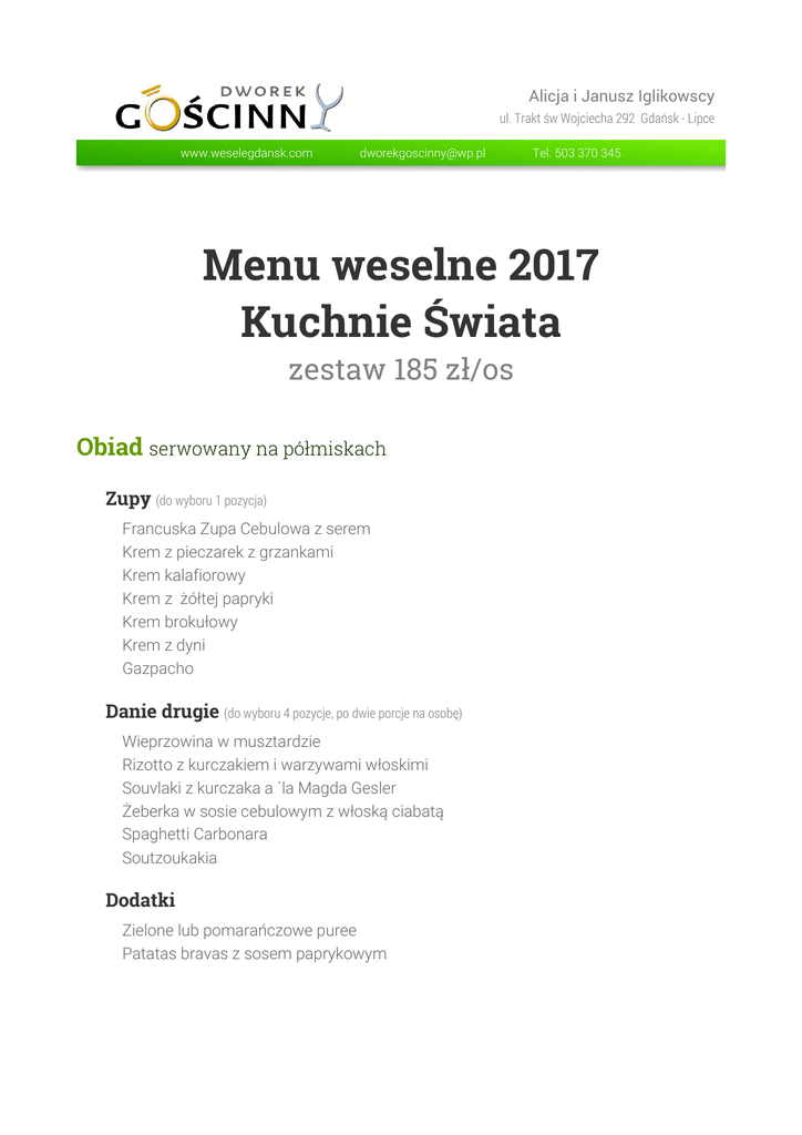 Alicja i Janusz Iglikowscy ul. Trakt św Wojciecha 292 Gdańsk - Lipce www.weselegdansk.com [email protected] Tel. 503 370 345 Menu weselne 2017 Kuchnie Świata zestaw 185 zł/os Obiad serwowany na półmiskach Zupy (do wyboru 1 pozycja) Francuska Zupa Cebulowa z serem Krem z pieczarek z grzankami Krem kalafiorowy Krem z żółtej papryki Krem brokułowy Krem z dyni Gazpacho Danie drugie (do wyboru 4 pozycje, po dwie porcje na osobę) Wieprzowina w musztardzie Rizotto z kurczakiem i warzywami włoskimi Souvlaki z kurczaka a `la Magda Gesler Żeberka w sosie cebulowym z włoską ciabatą Spaghetti Carbonara Soutzoukakia Dodatki Zielone lub pomarańczowe puree Patatas bravas z sosem paprykowym Alicja i Janusz Iglikowscy ul. Trakt św Wojciecha 292 Gdańsk - Lipce www.weselegdansk.com Surówki [email protected] Tel. 503 370 345 (do wyboru 3 pozycje) Sałatka Cezara Surówka z rzodkwi i jabłka Surówka z kapusty po włosku Surówka z selera i orzechów włoskich Surówka z porem i rodzynkami Surówka z pomidorów, ogórków z cebulka w sosie śmietanowym Seler z rodzynkami Deser (do wyboru 1 pozycja) Panna Cotta Lody z owocami egzotycznymi Sorbet cytrynowy Zakąski serwowane na półmiskach (do wyboru 9 pozycji) Przekąski z hiszpańskich tapas Gemista Lwowska sałatka śledziowa Dorsz po Grecku Śledź po skandynawsku Sałatka Waldorff Sałatka nicejska Sałatka cesarska a`la Magda Gessler Jajko w majonezie po tatarsku Grecka sałatka horiatiki Sałatka z kozim serem, suszonymi pomidorami, oliwkami i kaparami Burschetta al pomodoro Tortilla hiszpańska z kurczakiem i marynowana papryką Deska wędlin staropolskich Sałatka meksykańska Kalafior z brokułami w sosie koperkowo-czosnkowym przekładane jajkiem, ogórkiem i pomidorem Masło, pieczywo, kawa, herbata Alicja i Janusz Iglikowscy ul. Trakt św Wojciecha 292 Gdańsk - Lipce www.weselegdansk.com Dania na ciepło w nocy [email protected] Tel. 503 370 345 (do wyboru 2 pozycje, serwowane w różnych godzinach) Boeuf Strogonow ( kuchnia rosyjska) Barszcz ukraiński Żurek rzymski Pstrąg po baskijsku Ratatouille z kurczakiem i ryżem Hiszpańskie pulpeciki w sosie migdałowym. Sajgonki po wietnamsku Souvlaki klasyczne Briam po grecku Kawa i herbata w formie bufetu szwedzkiego Porządek uroczystości Obiad - Deser - Zakąski na zimno - Danie na ciepło o 22:00 - Tort o 23:15 Oczepiny o północy - Danie na ciepło o 2:00 Poprawiny Serwowane potrawy i zakąski weselne. W godzinach 13:00-20:00 w cenie 1200 zł bez limitu gości. Inne godziny możliwe do uzgodnienia. Serdecznie zapraszamy