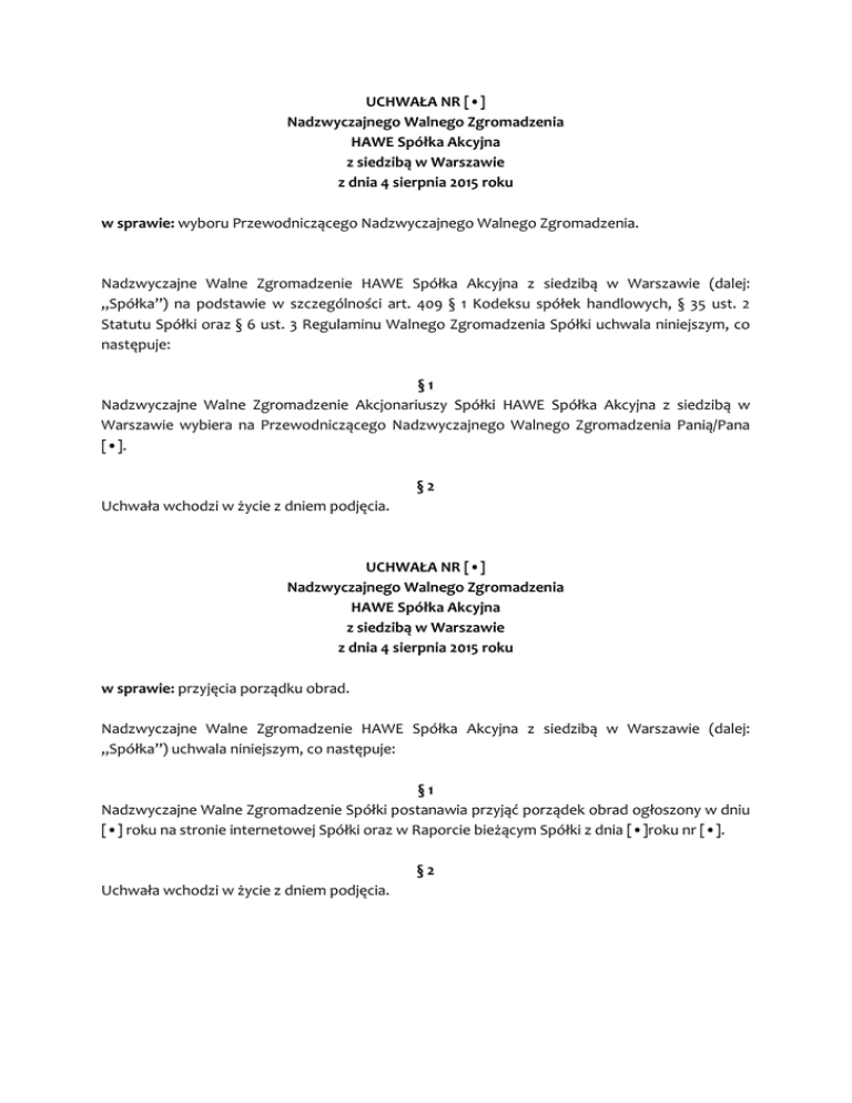 UCHWAŁA NR [•] Nadzwyczajnego Walnego Zgromadzenia HAWE Spółka Akcyjna z siedzibą w Warszawie z dnia 4 sierpnia 2015 roku w sprawie: wyboru Przewodniczącego Nadzwyczajnego Walnego Zgromadzenia. Nadzwyczajne Walne Zgromadzenie HAWE Spółka Akcyjna z siedzibą w Warszawie (dalej: „Spółka”) na podstawie w szczególności art. 409 § 1 Kodeksu spółek handlowych, § 35 ust. 2 Statutu Spółki oraz § 6 ust. 3 Regulaminu Walnego Zgromadzenia Spółki uchwala niniejszym, co następuje: §1 Nadzwyczajne Walne Zgromadzenie Akcjonariuszy Spółki HAWE Spółka Akcyjna z siedzibą w Warszawie wybiera na Przewodniczącego Nadzwyczajnego Walnego Zgromadzenia Panią/Pana [•]. §2 Uchwała wchodzi w życie z dniem podjęcia. UCHWAŁA NR [•] Nadzwyczajnego Walnego Zgromadzenia HAWE Spółka Akcyjna z siedzibą w Warszawie z dnia 4 sierpnia 2015 roku w sprawie: przyjęcia porządku obrad. Nadzwyczajne Walne Zgromadzenie HAWE Spółka Akcyjna z siedzibą w Warszawie (dalej: „Spółka”) uchwala niniejszym, co następuje: §1 Nadzwyczajne Walne Zgromadzenie Spółki postanawia przyjąć porządek obrad ogłoszony w dniu [•] roku na stronie internetowej Spółki oraz w Raporcie bieżącym Spółki z dnia [•]roku nr [•]. §2 Uchwała wchodzi w życie z dniem podjęcia. UCHWAŁA NR [•] Nadzwyczajnego Walnego Zgromadzenia HAWE Spółka Akcyjna z siedzibą w Warszawie z dnia 4 sierpnia 2015 roku w sprawie: podwyższenia kapitału zakładowego Spółki w drodze publicznej emisji akcji serii I z zachowaniem prawa poboru dotychczasowych akcjonariuszy Spółki oraz zmiany Statutu Spółki, dematerializacji akcji serii I, praw do akcji serii I oraz praw poboru akcji serii I, ubiegania się przez Spółkę o ich dopuszczenie i wprowadzenie do obrotu na rynku prowadzonym przez Giełdę Papierów Wartościowych w Warszawie S.A. Nadzwyczajne Walne Zgromadzenie HAWE Spółka Akcyjna z siedzibą w Warszawie (dalej: „Spółka”) na podstawie art. 430, art. 431 § 1 i § 2 pkt 2), art. 432 w związku z art. 310 § 2, art. 433 i art. 436 Kodeksu spółek handlowych, oraz art.5 ustawy z dnia 29 lipca 2005 roku o obrocie instrumentami finansowymi („Ustawa o Obrocie”) uchwala, co następuje: §1 1. Podwyższa się kapitał zakładowy Spółki z kwoty 107.237.064,00 zł (sto siedem milionów dwieście trzydzieści siedem tysięcy sześćdziesiąt cztery złote) do kwoty nie niższej niż 107.237.065,00 zł (sto siedem milionów dwieście trzydzieści siedem tysięcy sześćdziesiąt pięć złotych) i nie wyższej niż 160.855.596 zł (sto sześćdziesiąt milionów osiemset pięćdziesiąt pięć tysięcy pięćset dziewięćdziesiąt sześć złotych), to jest o kwotę nie mniejszą niż 1,00 zł (jeden złoty) i nie większą niż 53.618.532 zł ( pięćdziesiąt trzy miliony sześćset osiemnaście tysięcy pięćset trzydzieści dwa złote). 2. Podwyższenie kapitału zakładowego Spółki, o którym mowa w ust.1 powyżej, zostanie dokonane poprzez emisję nie mniej niż 1 (jednej) i nie więcej niż 53.618.532 (pięćdziesiąt trzy miliony sześćset osiemnaście tysięcy pięćset trzydzieści dwie) akcje zwykłe na okaziciela serii I o wartości nominalnej 1,00 zł (jeden złoty) każda akcja („Akcje serii I”). 3. Akcje serii I będą uczestniczyć w dywidendzie począwszy od wypłat z zysku, jaki przeznaczony będzie do podziału za rok obrotowy 2015, to jest od dnia 1 stycznia 2015 roku, na równi z pozostałymi akcjami. §2 1. Emisja Akcji serii I przeprowadzona zostanie w ramach oferty publicznej zgodnie z przepisami ustawy z dnia 29 lipca 2005 roku o ofercie publicznej i warunkach wprowadzania instrumentów finansowych do zorganizowanego systemu obrotu oraz o spółkach publicznych (dalej „Ustawa o ofercie”). 2. Cena emisyjna Akcji serii I zostaje ustalona na kwotę [•] zł ( [•] złotych) za jedną akcję. 3. Akcje serii I zostaną opłacone wkładami pieniężnymi. Wkłady na pokrycie akcji zostaną wniesione przed zarejestrowaniem podwyższenia kapitału w wysokości ich ceny emisyjnej. 1. §3 Akcje serii I zostaną zaoferowane w drodze subskrypcji zamkniętej, w rozumieniu art. 431 § 2 pkt 2) Kodeksu spółek handlowych, tj. z zachowaniem prawa poboru dotychczasowych Akcjonariuszy Spółki, w stosunku do liczby posiadanych przez nich akcji Spółki. Każdy Akcjonariusz posiadający 1 (jedną) akcję otrzymuje 1 (jedno) prawo poboru, przy czym 2 (dwa) prawa poboru uprawniają do objęcia 1 (jednej) Akcji serii I (emisja w stosunku 2:1). 2. Ustala się, że dniem według którego określa się Akcjonariuszy, którym przysługuje prawo poboru akcji serii I (dzień prawa poboru) jest dzień 7 października 2015 roku. §4 1. Zamiarem Spółki jest podjęcie czynności faktycznych i prawnych zmierzających do dopuszczenia i wprowadzenia Akcji serii I do obrotu na rynku prowadzonym przez Giełdę Papierów Wartościowych w Warszawie S.A. 2. Zarząd podejmie wszelkie niezbędne czynności w celu dopuszczenia i wprowadzenia akcji objętych niniejszą Uchwałą do obrotu na rynku prowadzonym przez Giełdę Papierów Wartościowych w Warszawie S.A. §5 Nadzwyczajne Walne Zgromadzenie, w związku z emisją Akcji serii I: 1) upoważnia i zobowiązuje Zarząd Spółki do podejmowania wszystkich czynności niezbędnych dla realizacji niniejszej uchwały, w szczególności do: a) określenia terminów, w jakich wykonywane będzie prawo poboru Akcji serii I, b) określenia szczegółowych zasad płatności za Akcje serii I, c) ustalenia szczegółowych zasad dystrybucji, zasad przydziału i dokonania przydziału Akcji serii I w ramach wykonania prawa poboru, d) ustalenia szczegółowych zasad przydziału i dokonania przydziału Akcji serii I, nieobjętych w ramach prawa poboru, z uwzględnieniem art. 436 § 4 Kodeksu spółek handlowych, e) zawarcia umowy/umów na subemisję usługową lub inwestycyjną dotyczącą wszystkich lub części Akcji serii I, jeżeli w ocenie Zarządu