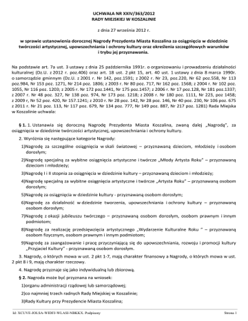 UCHWAŁA NR XXIV/363/2012 RADY MIEJSKIEJ W KOSZALINIE z dnia 27 września 2012 r. w sprawie ustanowienia dorocznej Nagrody Prezydenta Miasta Koszalina za osiągnięcia w dziedzinie twórczości artystycznej, upowszechniania i ochrony kultury oraz określenia szczegółowych warunków i trybu jej przyznawania. Na podstawie art. 7a ust. 3 ustawy z dnia 25 października 1991r. o organizowaniu i prowadzeniu działalności kulturalnej (Dz.U. z 2012 r. poz.406) oraz art. 18 ust. 2 pkt 15, art. 40 ust. 1 ustawy z dnia 8 marca 1990r. o samorządzie gminnym (Dz.U. z 2001 r. Nr 142, poz.1591; z 2002 r. Nr 23, poz.220, Nr 62 poz.558, Nr 113 poz.984, Nr 153 poz. 1271, Nr 214 poz. 1806; z 2003 r. Nr 80 poz. 717, Nr 162 poz. 1568; z 2004 r. Nr 102 poz. 1055, Nr 116 poz. 1203; z 2005 r. Nr 172 poz.1441, Nr 175 poz.1457; z 2006 r. Nr 17 poz.128, Nr 181 poz.1337; z 2007 r. Nr 48 poz. 327, Nr 138 poz. 974, Nr 173 poz. 1218; z 2008 r. Nr 180 poz. 1111, Nr 223, poz 1458; z 2009 r, Nr 52 poz. 420, Nr 157.1241; z 2010 r. Nr 28 poz. 142, Nr 28 poz. 146, Nr 40 poz. 230, Nr 106 poz. 675 z 2011 r. Nr 21 poz. 113, Nr 117 poz. 679, Nr 134 poz. 777, Nr 149 poz. 887, Nr 217 poz. 1281) Rada Miejska w Koszalinie uchwala: § 1. 1. Ustanawia się doroczną Nagrodę Prezydenta Miasta Koszalina, zwaną dalej „Nagrodą”, za osiągnięcia w dziedzinie twórczości artystycznej, upowszechniania i ochrony kultury. 2. Wyróżnia się następujące kategorie Nagrody: 1)Nagrodę za szczególne osiągnięcia w skali światowej – przyznawaną dzieciom, młodzieży i osobom dorosłym; 2)Nagrodę specjalną za wybitne osiągnięcia artystyczne i twórcze „Młody Artysta Roku” – przyznawaną dzieciom i młodzieży; 3)Nagrodę I i II stopnia za osiągnięcia w dziedzinie kultury – przyznawaną dzieciom i młodzieży; 4)Nagrodę specjalną za wybitne osiągnięcia artystyczne i twórcze „Artysta Roku” – przyznawaną osobom dorosłym; 5)Nagrodę za osiągnięcia w dziedzinie kultury - przyznawaną osobom dorosłym; 6)Nagrodę za działalność w dziedzinie tworzenia, upowszechniania i ochrony kultury – przyznawaną osobom dorosłym; 7)Nagrodę z okazji jubileuszu twórczego – przyznawaną osobom dorosłym, osobom prawnym i innym podmiotom; 8)Nagrodę za realizację przedsięwzięcia artystycznego „Wydarzenie Kulturalne Roku ” – przyznawaną osobom fizycznym, osobom prawnym i innym podmiotom; 9)Nagrodę za zaangażowanie i pracę przyczyniającą się do upowszechniania, rozwoju i promocji kultury „Przyjaciel Kultury” - przyznawaną osobom dorosłym. 3. Nagrody, o których mowa w ust. 2 pkt 1-7, mają charakter finansowy a Nagrody, o których mowa w ust. 2 pkt 8 i 9, mają charakter rzeczowy. 4. Nagrodę przyznaje się jako indywidualną lub zbiorową. § 2. Nagroda może być przyznana na wniosek: 1)organu administracji rządowej lub samorządowej; 2)co najmniej trzech radnych Rady Miejskiej w Koszalinie; 3)Rady Kultury przy Prezydencie Miasta Koszalina; ———————————————————————————————————————————————————————————— Id: XCUVE-JOLSA-WIDFJ-WLASI-NBKKX. Podpisany Strona 1 4)instytucji kultury; 5)związku lub stowarzyszenia zawodowego, twórczego i kulturalnego; 6)szkoły podstawowej, gimnazjum, szkoły ponadgimnazjalnej i artystycznej, placówki oświatowo wychowawczej, specjalnego ośrodka szkolno–wychowawczego; 7)szkoły wyższej; 8)spółdzielni mieszkaniowej; 9)prasy, radia, telewizji. § 3. 1. Wniosek o przyznanie Nagrody dzieciom i młodzieży stanowi załącznik nr 1. 2. Wniosek o przyznanie Nagrody osobom dorosłym stanowi załącznik nr 2. 3. Wniosek o przyznanie Nagrody z okazji jubileuszu twórczego stanowi załącznik nr 3. 4. Wniosek o przyznanie Nagrody za realizację przedsięwzięcia artystycznego „Wydarzenie Kulturalne Roku” stanowi załącznik nr 4. 5. Do wniosków, o których mowa w ust. 1, 2 i 3, należy dołączyć potwierdzone za zgodność z oryginałem kserokopie dyplomów lub protokołów oraz pism zawierające informacje o kandydacie, jego osiągnięciach oraz uzyskanych nagrodach i wyróżnieniach. 6. Do wniosków, o których mowa w ust. 4, należy dołączyć potwierdzone za zgodność z oryginałem kserokopie protokołów, opinii, recenzji lub materiały prasowe zawierające informacje o przebiegu i efektach realizacji danego przedsięwzięcia. § 4. 1. Nagroda przyznawana jest za miniony rok kalendarzowy. Wnioski w sprawie przyznania Nagrody składa się w kancelarii Urzędu Miejskiego w Koszalinie - Rynek Staromiejski 6–7, w terminie do dnia 15 stycznia następnego roku, z zastrzeżeniem ust. 2. 2. W każdym czasie może być złożony wniosek w sprawie przyznania Nagrody za szczególne osiągnięcia w skali światowej. 3. Wniosek w sprawie przyznania Nagrody z okazji jubileuszu twórczego może dotyczyć zarówno jubileuszu przypadającego w roku minionym, jak i bieżącym. 4. W razie stwierdzenia braków formalnych, wnioskodawca jest zobowiązany do ich usunięcia w terminie 7 dni od dnia doręczenia wezwania. 5. Wniosek pozostawia się bez rozpatrzenia w przypadku: 1)złożenia po terminie; 2)cofnięcia przez wnioskodawcę; 3)rezygnacji kandydata; 4)braków formalnych, jeżeli nie zostały usunięte w terminie. § 5. 1. W terminie do dnia 31 marca każdego roku przyznaje się i wręcza: 1)Nagrodę specjalną za wybitne osiągnięcia artystyczne i twórcze „Młody Artysta Roku”; 2)Nagrodę I i II stopnia za osiągnięcia w dziedzinie kultury; 3)Nagrodę specjalną za wybitne osiągnięcia artystyczne i twórcze „ Artysta Roku”; 4)Nagrodę za osiągnięcia w dziedzinie kultury; 5)Nagrodę za działalność w dziedzinie tworzenia, upowszechniania i ochrony kultury; 6)Nagrodę za realizację przedsięwzięcia artystycznego „Wydarzenie Kulturalne Roku”; 7)Nagrodę z okazji jubileuszu twórczego, z zastrzeżeniem ust. 3; ———————