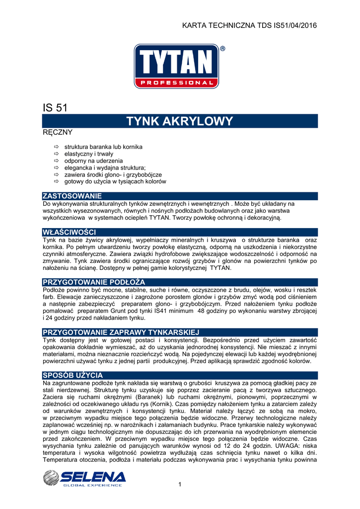 KARTA TECHNICZNA TDS IS51/04/2016 IS 51 TYNK AKRYLOWY RĘCZNY struktura baranka lub kornika elastyczny i trwały odporny na uderzenia elegancka i wydajna struktura; zawiera środki glono- i grzybobójcze gotowy do użycia w tysiącach kolorów ZASTOSOWANIE Do wykonywania strukturalnych tynków zewnętrznych i wewnętrznych . Może być układany na wszystkich wysezonowanych, równych i nośnych podłożach budowlanych oraz jako warstwa wykończeniowa w systemach ociepleń TYTAN. Tworzy powłokę ochronną i dekoracyjną. WŁAŚCIWOŚCI Tynk na bazie żywicy akrylowej, wypełniaczy mineralnych i kruszywa o strukturze baranka oraz kornika. Po pełnym utwardzeniu tworzy powłokę elastyczną, odporną na uszkodzenia i niekorzystne czynniki atmosferyczne. Zawiera związki hydrofobowe zwiększające wodoszczelność i odporność na zmywanie. Tynk zawiera środki ograniczające rozwój grzybów i glonów na powierzchni tynków po nałożeniu na ścianę. Dostępny w pełnej gamie kolorystycznej TYTAN. PRZYGOTOWANIE PODŁOŻA Podłoże powinno być mocne, stabilne, suche i równe, oczyszczone z brudu, olejów, wosku i resztek farb. Elewacje zanieczyszczone i zagrożone porostem glonów i grzybów zmyć wodą pod ciśnieniem a następnie zabezpieczyć preparatem glono- i grzybobójczym. Przed nałożeniem tynku podłoże pomalować preparatem Grunt pod tynki IS41 minimum 48 godziny po wykonaniu warstwy zbrojącej i 24 godziny przed nakładaniem tynku. PRZYGOTOWANIE ZAPRAWY TYNKARSKIEJ Tynk dostępny jest w gotowej postaci i konsystencji. Bezpośrednio przed użyciem zawartość opakowania dokładnie wymieszać, aż do uzyskania jednorodnej konsystencji. Nie mieszać z innymi materiałami, można nieznacznie rozcieńczyć wodą. Na pojedynczej elewacji lub każdej wyodrębnionej powierzchni używać tynku z jednej partii produkcyjnej. Przed aplikacją sprawdzić zgodność kolorów. SPOSÓB UŻYCIA Na zagruntowane podłoże tynk nakłada się warstwą o grubości kruszywa za pomocą gładkiej pacy ze stali nierdzewnej. Strukturę tynku uzyskuje się poprzez zacieranie pacą z tworzywa sztucznego. Zaciera się ruchami okrężnymi (Baranek) lub ruchami okrężnymi, pionowymi, poprzecznymi w zależności od oczekiwanego układu rys (Kornik). Czas pomiędzy nałożeniem tynku a zatarciem zależy od warunków zewnętrznych i konsystencji tynku. Materiał należy łączyć ze sobą na mokro, w przeciwnym wypadku miejsce tego połączenia będzie widoczne. Przerwy technologiczne należy zaplanować wcześniej np. w narożnikach i załamaniach budynku. Prace tynkarskie należy wykonywać w jednym ciągu technologicznym nie dopuszczając do ich przerwania na wyodrębnionym elemencie przed zakończeniem. W przeciwnym wypadku miejsce tego połączenia będzie widoczne. Czas wysychania tynku zależnie od panujących warunków wynosi od 12 do 24 godzin. UWAGA: niska temperatura i wysoka wilgotność powietrza wydłużają czas schnięcia tynku nawet o kilka dni. Temperatura otoczenia, podłoża i materiału podczas wykonywania prac i wysychania tynku powinna 1 KARTA TECHNICZNA TDS IS51/04/2016 º º wynosić od +5 C do +25 C. Należy chronić tynkowaną powierzchnię przed niekorzystnymi warunkami atmosferycznymi. Stosować siatki i plandeki ochronne. Narzędzia umyć czystą wodą bezpośrednio po użyciu. ZUŻYCIE Średnio zużywa się w zależności od grubości kruszywa strukturyzującego od 2,2 kg do 3,1 kg ± 5% na równym i zagruntowanym podłożu. Zaleca się dokładne określenie zużycia na podstawie próby. Orientacyjne zużycie tynku 1,5 mm 2,0 mm BARANEK (kg/m²) 2,2-2,4 2,9-3,1 KORNIK (kg/m²) 2,4 3,0 DANE TECHNICZNE temperatura stosowania (podłoża, otoczenia i zaprawy ) gęstość gotowego wyrobu średni czas wysychania tynku o o od +5 C do +25 C 3 ok. 1,85 g/cm od 12h do 24h SKŁADOWANIE I TRANSPORT Tynk należy przewozić i przechowywać w suchych warunkach na paletach i w oryginalnych, º º nieuszkodzonych opakowaniach w temperaturze od +5 C do +25 C. Chronić przed mrozem i bezpośrednim działaniem słońca. Tak przechowywany produkt posiada okres przydatności do użycia 12 miesięcy. Opakowanie po otwarciu szczelnie zamknąć i pozostałą zawartość jak najszybciej zużyć. ZGODNOŚĆ Z NORMAMI I WYMAGANIAMI JAKOŚCIOWYMI Produkt zgodny z Europejską Oceną Techniczną ETA-16/0161 , ETA-16/0166, Aprobatą Techniczną ITB AT-15-7286/2013, posiada Deklarację Właściwości Użytkowych oraz Krajową Deklarację Zgodności. Aktualizacja 01.03.2016 Powyższe dane, zalecenia i wskazówki opierają się na naszej najlepszej wiedzy, badaniach oraz doświadczeniach i zostały udzielone w dobrej wierze zgodnie z zasadami obowiązującymi w naszej firmie i u naszych dostawców. Zaproponowane sposoby postępowania uznane są za powszechne, jednak każdy z użytkowników tego materiału powinien upewnić się na wszelkie możliwe sposoby, włącznie ze sprawdzeniem produktu końcowego w odpowiednich warunkach, o przydatności dostarczanych materiałów dla osiągnięcia celów przez niego zamierzonych. Ani Spółka, ani jej upoważnieni przedstawiciele nie mogą ponosić odpowiedzialności za jakiekolwiek straty poniesione na skutek nieprawidłowego, bądź błędnego użycia jej materiałów. 2