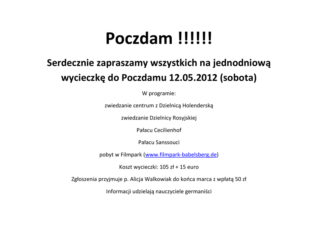 Poczdam !!!!!! Serdecznie zapraszamy wszystkich na jednodniową wycieczkę do Poczdamu 12.05.2012 (sobota) W programie: zwiedzanie centrum z Dzielnicą Holenderską zwiedzanie Dzielnicy Rosyjskiej Pałacu Cecilienhof Pałacu Sanssouci pobyt w Filmpark (www.filmpark-babelsberg.de) Koszt wycieczki: 105 zł + 15 euro Zgłoszenia przyjmuje p. Alicja Walkowiak do kooca marca z wpłatą 50 zł Informacji udzielają nauczyciele germaniści