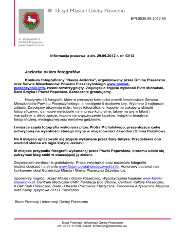 BPI.0530.69.2012.MI Informacja prasowa z dn. 29.06.2012 r. nr 43/12 Jeziorka okiem fotografów Konkurs fotograficzny "Nasza Jeziorka", organizowany przez Gminę Piaseczno oraz Serwis Mieszkańców Powiatu Piaseczyńskiego www.powiatpiaseczynski.info, został rozstrzygnięty. Zwycięskie zdjęcia wykonali Piotr Michalski, Sara Smyka i Paweł Popowicz. Serdecznie gratulujemy. Napłynęło 45 fotografii, które w pierwszej kolejności ocenili forumowicze Serwisu Mieszkańców Powiatu Piaseczyńskiego, a następnie 6 osobowe jury. Wybrano 3 najlepsze zdjęcia. Zwycięzcy otrzymają m.in.: kursy fotograficzne, kupony na zakupy w sklepie fotograficznym, darmowe wejściówki na imprezy kulturalne, talony na grę w bilard i warsztaty z decoupage, kupony na wypożyczenie kajaków, książki o tematyce fotograficznej, ekologicznej oraz mnóstwo gadżetów. I miejsce zajęła fotografia wykonana przez Piotra Michalskiego, prezentująca rzekę uchwyconą na wysokości starego młyna w miejscowości Zawodne (Gmina Prażmów). Na II miejscu uplasowało się zdjęcie wykonane przez Sarę Smyka. Przedstawia ono wschód słońca we mgle koryta Jeziorki. III miejsce przypadło fotografii wykonanej przez Pawła Popowicza, któremu udało się zatrzymać bieg rzeki w otaczającej ją zieleni. Zwycięzcom serdecznie gratulujemy. Prace zwycięskie oraz pozostałe fotografie można obejrzeć na stronie www.forum.powiat-piaseczynski.info. Honorowy patronat nad konkursem objął Burmistrza Miasta i Gminy Piaseczno Zdzisław Lis. Sponsorzy nagród: Urząd Miasta i Gminy Piaseczno, Wypożyczalnia kajaków www.kajakipiaseczno.pl, Centrum Medyczne CMP, Fundacja Eco Choice, Centrum Kultury Piaseczno, 8 Ball Club Piaseczno, Biała - Otwarta Pracownia Plastyczna, Pracownia Artystyczna Alegoria oraz Kursy Językowe SPOT Piaseczno. Biuro Promocji i Informacji Gminy Piaseczno Biuro Promocji i Informacji Gminy Piaseczno tel. 22 70 17 650, e-mail: [email protected]