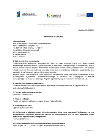 Projekt współfinansowany przez Unię Europejską w ramach Europejskiego Funduszu Społecznego Kraków, 17.03.2011 ZAPYTANIE OFERTOWE I. Zamawiający InterActive Agencja Komunikacji Marketingowej Adres siedziby: ul. Zdrojowa 42/12 Tel. 12/ 410 50 35 faks 12/ 417 38 78 E-mail [email protected] Adres biura projektu: ul. Szenwalda 18 31-571 Kraków II. Opis przedmiotu zamówienia Przeprowadzenie wywiadów bezpośrednich (face to face) techniką (PAPI) przy wykorzystaniu papierowego kwestionariusza z pracodawcami z powiatów: tarnogórskiego, lublinieckiego, miasta Bytom, miasta Piekary Śląskie. Ankieterom dostarczona zostanie lista pracodawców z ich danymi teleadresowymi. Przeprowadzenie wywiadu musi byd potwierdzone podpisem respondenta oraz pieczątką firmy/ instytucji na tzw. liście respondentów. Badanie to jest realizowane w ramach projektu badawczego „Diagnoza sytuacji zawodowej kobiet w podregionie bytomskim”, współfinansowanego ze środków Unii Europejskiej w ramach Europejskiego Funduszu Społecznego, Program Operacyjny Kapitał Ludzki, Poddziałanie 6.1.1. III. Wymagania stawiane Wykonawcy: Doświadczenie w realizacji bezpośrednich wywiadów wśród pracodawców w ciągu ostatnich 3 lat (techniką PAPI lub CAPI) IV. Termin wykonania zamówienia: Kwiecieo – czerwiec 2011 V. Miejsce realizacji: Powiat tarnogórski, lubliniecki, miasta Bytom, Piekary Śląskie VI. Przewidywana ilośd: Ogółem: 1940 wywiadów VII. Informacje o oświadczeniach lub dokumentach, jakie mają dostarczyd Wykonawcy w celu potwierdzenia spełnienia warunków udziału w postępowaniu oraz w celu wykazania braku podstaw do wykluczenia z postępowania Formularz ofertowy VIII. Osoby uprawnione do porozumiewania się z wykonawcami Jagna Wajler, tel. (12) 410 50 35 [email protected] Strona 1 z 3 Projekt współfinansowany przez Unię Europejską w ramach Europejskiego Funduszu Społecznego IX. Termin i sposób składania ofert Oferty w formie formularza ofertowego (znajdującego się w załączniku) należy przesyład na adres: [email protected] w nieprzekraczalnym terminie do 27 marca 2011. Oferty nadesłane po tym terminie nie będą rozpatrywane. X. Sposób oceny ofert i kryteria oceny oferty Kryteria oceny oferty: cena max 40% –nie wyższa niż 34 zł/brutto od zrealizowanego wywiadu. Oferowana cena musi obejmowad wszystkie koszty zrealizowania wywiadu między innymi przejazdy i noclegi. wykształcenie 30% o 30 punktów – ukooczone studia wyższe na kierunkach: psychologia, socjologia, o 15 punktów – ukooczone inne studia wyższe o 10 punktów – studia na kierunkach: psychologia, socjologia o 5 punktów – studia na innych kierunkach doświadczenie w realizacji ankiet wśród pracodawców 30% w ciągu ostatnich 3 lat XI. Oferty częściowe Zamawiający dopuszcza składanie ofert częściowych XII. Podwykonawcy Zamawiający nie dopuszcza wykonywania prac przez podwykonawców. XIII. Ogólne warunki zaproszenia 1. Oferent oświadcza, że podane koszty jednostkowe są pełnym kosztem usługi. 2. Zamawiającemu przysługuje prawo do swobodnego wyboru oferty z zachowaniem zasad konkurencyjności 3. Oferent oświadcza, że jest w sytuacji finansowej i organizacyjne pozwalającej na realizację zamówienia przez cały okres wskazany w zaproszeniu. 4. Zamawiający zastrzega sobie możliwośd bezkosztowej rezygnacji z usługi. Strona 2 z 3 Projekt współfinansowany przez Unię Europejską w ramach Europejskiego Funduszu Społecznego FORMULARZ OFERTOWY Zamawiający InterActive Agencja Komunikacji Marketingowej Adres siedziby: ul. Zdrojowa 42/12 Tel. 12/ 410 50 35 faks 12/ 417 38 78 E-mail : [email protected] Adres biura projektu: ul. Szenwalda 18 31-571 Kraków Oferent: Imię i nazwisko:……………………………………………. Adres zameldowania:………………………………….. Telefon kontaktowy:……………………………………. Adres e-mail:………………………………………………… OFERTA Dotyczy: zapytania ofertowego na usługę przeprowadzenia wywiadów (PAPI) wśród pracodawców w ramach projektu „ Diagnoza sytuacji zawodowej kobiet w podregionie bytomskim” 1) Cena: proponowana cena za jeden wywiad:………………………………………………………………………brutto słownie:…………………………………………………………………………………………………….(nie więcej niż 34 zł brutto). 2) Doświadczenie: liczba bezpośrednich wywiadów zrealizowanych wśród pracodawców w ciągu ostatnich 3 lat (techniką PAPI lub CAPI):…………………….słownie……………………………………………………… 3) Wykształcenie: zaznacz właściwą odpowiedź z poniższych: Wyższe psychologiczne/ socjologiczne…………………………………………………………………………….. Wyższe na innym kierunku ………………………………………………………………………………………………. Wykształcenie średnie i studia na kierunku psychologia/ socjologia………………………………… Wykształcenia średnie i studia na innym kierunku……………………………………………………………. Wykształcenie średnie………………………………………………………………………………………………………. 4) Powiat(y), w których jestem gotowy/a prowadzid wywiady (minimalnie 1, maksymalnie4): 1) 2) 3) 4) 5) Lubliniecki…………………………………………………………………………………………………………………… Tarnogórski…………………………………………………………………………………………………................ Miasto Bytom……………………………………………………………………………………………………………… Miasto Piekary Śląskie……………………………………