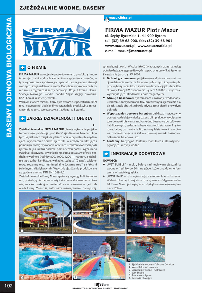 BASENY I ODNOWA BIOLOGICZNA ZJEŻDŻALNIE WODNE, BASENY mazur.ibiss.pl FIRMA MAZUR Piotr Mazur ul. Szyby Rycerskie 1, 41-909 Bytom tel. (32) 39 68 900, faks (32) 39 68 901 www.mazur.net.pl, www.sztucznafala.pl e-mail: [email protected] O FIRMIE FIRMA MAZUR zajmuje się projektowaniem, produkcją i montażem zjeżdżalni wodnych, elementów wyposażenia basenów, w tym wyposażenia sportowego i specjalistycznego oraz atrakcji wodnych, stacji uzdatniania wody. Dotychczas wykonała na terenie kraju i zagranicą (Czechy, Słowacja, Rosja, Ukraina, Dania, Szwecja, Norwegia, Islandia, Irlandia, Anglia, Węgry , Słowenia, USA, Korea) kilkaset zjeżdżalni. Ważnym etapem rozwoju firmy było otwarcie, z początkiem 2009 roku, nowoczesnej siedziby firmy wraz z halą produkcyjną, mieszczącej się w sercu województwa śląskiego, w Bytomiu. ZAKRES DZIAŁALNOŒCI I OFERTA Zjeżdżalnie wodne: FIRMA MAZUR oferuje wykonanie projektu technicznego, produkcję „pod klucz” zjeżdżalni na basenach krytych, kąpieliskach miejskich, plażach oraz w prywatnych rezydencjach, wyposażenie obiektu zjeżdżalni w urządzenia filtrujące i pompujące wodę, wykonanie wszelkich urządzeń towarzyszących zjeżdżalni, jak liczniki zjazdów, pomiar czasu zjazdu, sygnalizacja świetlna i akustyczna, oświetlenie itp. Firma posiada w ofercie zjeżdżalnie wodne o średnicy 800, 1000, 1200 i 1400 mm, zjeżdżalnie typu turbo, kamikadze, wahadło, „cebula” (2 typy), wielotorowe, rodzinne oraz multimedialne („czarna rura” z efektami świetlnymi, dźwiękowymi). Wszystkie zjeżdżalnie produkowane są zgodnie z normą DIN EN 1069-1,2. Zjeżdżalnie wodne Firmy Mazur spełniają wymogi BHP i ergonomii, posiadają niezbędne atesty i stosowne dopuszczenia. Rozwiązania konstrukcyjne i materiałowe zastosowane w zjeżdżalniach Firmy Mazur są autorskimi rozwiązaniami najwyższej, 1 sprawdzonej jakości. Wysoką jakość świadczonych przez nas usług potwierdzają szereg prestiżowych nagród oraz certyfikat Systemu Zarządzania Jakością ISO 9001. Technologia basenowa: projektowanie, dostawa i montaż stacji uzdatniania wody dla basenów publicznych i prywatnych, przy wykorzystaniu takich sposobów dezynfekcji jak: chlor, tlen aktywny, lampy UV, ozonowanie, System Anti Bio – urządzenie wykorzystujące ultradźwięki i pole magnetyczne. Atrakcje basenowe: hydromasaże i kaskady, wodospady, urządzenie do wytwarzania tzw. przeciwprądu, zjeżdżalnie dla dzieci, statek piracki, zabawki pływające z pianki o trwałym pokryciu. Wyposażenie sportowe basenów: bulkhead – przesuwny pomost rozdzielający nieckę basenu olimpijskiego, wypłycenie toru do nauki pływania, ruchome dno basenowe do celów rehabilitacyjnych, zadaszenia basenów, słupki startowe, liny torowe, bębny do nawijania lin, zestawy falstartowe i nawrotowe, drabinki i poręcze ze stali nierdzewnej, suszarki basenowe, odkurzacze basenowe, itp. Fontanny: tradycyjne, fontanny modułowe i interaktywne, pływające, kurtyny wodne. INFORMACJE DODATKOWE NOWOŚCI: „WET BUBBLE” – mokry balon; nadmuchiwana zjeżdżalnia wodna o średnicy do 20m na górze, której znajduje się fontanna w kształcie grzybka. „WAVE BALL” – kula wytwarzająca sztuczną falę na basenie. W chwili obecnej to najtańsze rozwiązanie wśród generatorów fal. Firma Mazur jest wyłącznym dystrybutorem tego urządzenia w Polsce. 3 5 6 2 102 1. Zje¿d¿alnie wodne – D¹browa Górnicza 2. Wave Ball – sztuczna fala 3. Zjeżdżalnie wodne – Ostrowiec 4. Wet Bubble 5. Fontanna – Bytom 6. Zabawki p³ywaj¹ce 4 2010 INFORMATOR BUDOWNICTWA i SPRZÊTU SPORTOWEGO
