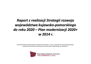Raport z realizacji Strategii rozwoju województwa kujawsko-pomorskiego do roku 2020 – Plan modernizacji 2020+ w 2014 r. Urząd Marszałkowski Województwa Kujawsko-Pomorskiego w Toruniu, Departament Rozwoju Regionalnego Kujawsko-Pomorskie Biuro Planowania Przestrzennego i Regionalnego we Włocławku Strategia rozwoju województwa kujawskopomorskiego do roku 2020 – Plan modernizacji 2020+ została przyjęta 21 października 2013 r. uchwałą Sejmiku Województwa KujawskoPomorskiego Raport z realizacji Strategii rozwoju województwa kujawsko-pomorskiego do roku 2020 - Plan modernizacji 2020+ w 2014 r. STRATEGIA JAKO INSTRUMENT ZARZĄDZANIA ROZWOJEM Wiedza diagnostyczna Jak jest? Wiedza dyrektywna Jak działać, aby było tak, jak być powinno? Raport z realizacji Strategii rozwoju województwa kujawsko-pomorskiego do roku 2020 - Plan modernizacji 2020+ w 2014 r. Plan modernizacji 2020+ Przygotowanie przestrzeni i społeczeństwa regionu do funkcjonowania w nowych warunkach Raport z realizacji Strategii rozwoju województwa kujawsko-pomorskiego do roku 2020 - Plan modernizacji 2020+ w 2014 r. STRATEGIA ROZWOJU WOJEWÓDZTWA MISJA PRIORYTETY CELE STRATEGICZNE KIERUNKI DZIAŁAŃ Raport z realizacji Strategii rozwoju województwa kujawsko-pomorskiego do roku 2020 - Plan modernizacji 2020+ w 2014 r. MISJA ROZWOJU WOJEWÓDZTWA DO ROKU 2020 człowiek Kujawsko-Pomorskie rodzina społeczeństwo Raport z realizacji Strategii rozwoju województwa kujawsko-pomorskiego do roku 2020 - Plan modernizacji 2020+ w 2014 r. Priorytety Konkurencyjna gospodarka Modernizacja wsi i miast Silna metropolia Nowoczesne społeczeństwo Raport z realizacji Strategii rozwoju województwa kujawsko-pomorskiego do roku 2020 - Plan modernizacji 2020+ w 2014 r. Cele strategiczne Dostępność i spójność Aktywne społeczeństwo i sprawne usługi Gospodarka i miejsca pracy Innowacyjność Nowoczesny sektor rolnospożywczy Bezpieczeństwo Sprawne zarządzanie Tożsamość i dziedzictwo Raport z realizacji Strategii rozwoju województwa kujawsko-pomorskiego do roku 2020 - Plan modernizacji 2020+ w 2014 r. Raport z realizacji Strategii rozwoju województwa kujawsko-pomorskiego do roku 2020 - Plan modernizacji 2020+ w 2014 r. Instrumentami realizacji ustaleń Strategii są: Kujawsko-pomorskie programyrozwoju rozwoju Kujawsko-Pomorskie Programy Polityka Polityka terytorialna terytorialna województwa województwa Regionalny Program Operacyjny Województwa Kujawsko-Pomorskiego na lata 2014-2020 Kontrakt Terytorialny dla Województwa Kujawsko-Pomorskiego Plan Zagospodarowania Przestrzennego Województwa Kujawsko-Pomorskiego Raport z realizacji Strategii rozwoju województwa kujawsko-pomorskiego do roku 2020 - Plan modernizacji 2020+ w 2014 r. Model „Moderna” jako instrument realizacji Strategii rozwoju województwa do roku 2020 Raport z realizacji Strategii rozwoju województwa kujawsko-pomorskiego do roku 2020 - Plan modernizacji 2020+ w 2014 r. • Zmiana profilu społeczno-gospodarczego województwa, • Wydobycie walorów dotąd słabo eksponowanych albo nie uważanych za „lokomotywy rozwoju”, • Wykreowanie całkiem nowych walorów oraz wizerunku województwa. Idea modernizacji Włączenie wszystkich w realizację idei modernizacji regionu Kreowanie społecznej otwartości Inwestycja w ludzi Budowa społecznego zaufania Rozwój komunikacji społecznej Wspieranie kreatywności Kreowanie postaw innowacyjnych Promowanie strategii Podstawowym instrumentem realizacji ustaleń strategii będą regionalne programy rozwoju (Kujawsko-Pomorskie Programy Rozwoju) Przyjmuje się, że wraz z uchwaleniem Strategii następuje „nowe otwarcie” w zakresie regionalnych programów rozwoju – to znaczy przystępuje się do sporządzenia programów uwzględniających ustalenia Strategii rozwoju województwa Regionalne programy rozwoju będą opracowywane w ramach trzech obszarów działań strategicznych: Obszar działań strategicznych „Gospodarka” Program strategiczny „Gospodarka” Obszar działań strategicznych „Społeczeństwo” Program strategiczny „Społeczeństwo” programy rozwoju Obszar działań strategicznych „Spójność” Program strategiczny „Spójność” W ramach wskazanych trzech programów strategicznych skupionych będzie około 20 programów Raport z realizacji Strategii rozwoju województwa kujawsko-pomorskiego do roku 2020 - Plan modernizacji 2020+ w 2014 r. Programy rozwoju województwa Regionalna Strategia Innowacji Województwa Kujawsko-Pomorskiego na lata 2014-2020. Strategia na rzecz Rozwoju Inteligentnych Specjalizacji – przyjęta uchwałą Zarządu Województwa Kujawsko-Pomorskiego w dniu 14 stycznia 2015 r. Kujawsko-Pomorski Program na rzecz Ekonomii Społecznej na lata 2013-2020 – przyjęty uchwałą Zarządu Województwa Kujawsko-Pomorskiego w dniu 10 czerwca 2014 r. Kujawsko-Pomorski Program Wspierania Rodziny na lata 2014-2020 – przyjęty uchwałą Zarządu Województwa Kujawsko-Pomorskiego w dniu 25 czerwca 2014 r. Plan działań na rzecz rozwoju gospodarczego województwa kujawsko-pomorskiego na lata 2015-2020 – w trakcie opracowywania Kujawsko-Pomorski Plan Spójności Komunikacji Drogowej i Kolejowej – w trakcie opracowywania: • wynika z zaleceń Komisji Europejskiej •Istotny dla wdrażania RPO WKP Raport z realizacji Strategii rozwoju województwa kujawsko-pomorskiego do roku 2020 - Plan modernizacji 2020+ w 2014 r. Realizacja ustaleń Strategii 15 października 2014 roku Uchwałą Zarządu Województwa Kujawsko-Pomorskiego został przyjęty Szczegółowy plan działań na rzecz realizacji ustaleń Strategii województwa kujawsko-pomorskiego do roku 2020 – Plan modernizacji 2020+ INSTYTUCJA WDRAŻAJĄCA STRATEGIA KOORDYNOWANIE REALIZACJI PLATFORMA DIALOGU SPOŁECZNEGO REALIZOWANIE ZARZĄD WOJEWÓDZTWA RAPORT ROCZNY– realizacja ustaleń Strategii SPOŁECZNO-GOSPODARCZA RADA DS. MODERNIZACJI REGIONU RAPORT 3-letni – stan rozwoju województwa Raport z rea