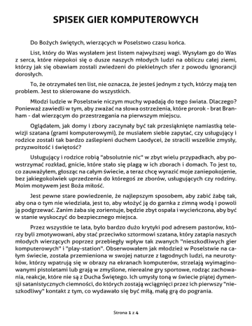 SPISEK GIER KOMPUTEROWYCH Do Bożych świętych, wierzących w Poselstwo czasu końca. List, który do Was wysłałem jest listem najwyższej wagi. Wysyłam go do Was z serca, które niepokoi się o dusze naszych młodych ludzi na obliczu całej ziemi, którzy jak się obawiam zostali zwiedzeni do piekielnych sfer z powodu ignorancji dorosłych. To, że otrzymałeś ten list, nie oznacza, że jesteś jednym z tych, którzy mają ten problem. Jest to skierowane do wszystkich. Młodzi ludzie w Poselstwie niczym muchy wpadają do tego świata. Dlaczego? Ponieważ zawiedli w tym, aby zważać na słowa ostrzeżenia, które prorok - brat Branham - dał wierzącym do przestrzegania na pierwszym miejscu. Oglądałem, jak domy i zbory zaczynały być tak przesiąknięte namiastką telewizji szatana (grami komputerowymi), że musiałem siebie zapytać, czy usługujący i rodzice zostali tak bardzo zaślepieni duchem Laodycei, że stracili wszelkie zmysły, przyzwoitość i świętość? Usługujący i rodzice robią "absolutnie nic" w zbyt wielu przypadkach, aby powstrzymać rozkład, gnicie, które stało się plagą w ich zborach i domach. To jest to, co zauważyłem, głosząc na całym świecie, a teraz chcę wyrazić moje zaniepokojenie, bez jakiegokolwiek uprzedzenia do któregoś ze zborów, usługujących czy rodziny. Moim motywem jest Boża miłość. Jest pewne stare powiedzenie, że najlepszym sposobem, aby zabić żabę tak, aby ona o tym nie wiedziała, jest to, aby włożyć ją do garnka z zimną wodą i powoli ją podgrzewać. Zanim żaba się zorientuje, będzie zbyt ospała i wycieńczona, aby być w stanie wyskoczyć do bezpiecznego miejsca. Przez wszystkie te lata, było bardzo dużo krytyki pod adresem pastorów, którzy byli zmotywowani, aby stać przeciwko sztormowi szatana, który zatapia naszych młodych wierzących poprzez przebiegły wpływ tak zwanych "nieszkodliwych gier komputerowych" i "play-station". Obserwowałem jak młodzież w Poselstwie na całym świecie, została przemieniona w swojej naturze z łagodnych ludzi, na neurotyków, którzy wpatrują się w obrazy na ekranach komputerów, strzelają wyimaginowanymi pistoletami lub grają w zmyślone, nierealne gry sportowe, rodząc zachowania, reakcje, które nie są z Ducha Świętego. Ich umysły toną w świecie piątej dymensji satanistycznych ciemności, do których zostają wciągnięci przez ich pierwszy "nieszkodliwy" kontakt z tym, co wydawało się być miłą, małą grą do pogrania. Strona 1 z 4 I wtedy... Niespodzianka, niespodzianka! Nie są już więcej zainteresowani sprawami Bożymi. Aby zająć czymś młodego brata lub siostrę, mama bądź tata sadzają ich przed ekranem, który kiedyś został zakupiony dla duchowych celów "Poselstwa czasu końca". Tak oto ten ekran pokazuje 5 dymensję zamiast 7. Patrzcie, co powiedział prorok: 133. Wy ojcowie, matki, czy jesteście gotowi ustanowić ołtarz w waszym domu i wynieść z niego telewizję? Czy jesteście gotowi wyrzucić tę talię kart ze stołu? Te komiksy, które czytają wasze dzieci, przygotowują ich młode umysły na wybuch, spustoszenie, które szatan w nich uczyni. Czy jesteście gotowi ustanowić z powrotem ten stary rodzinny ołtarz? Czy może po prosty chcecie to kontynuować na tej drodze, na której jesteście? Jeśli chcecie kontynuować, to znaczy, że jeszcze nie spełniacie warunków, aby przyjść; ale modlę się, abyście byli jak Samson, byście widzieli cenę i byli gotowi zawołać: "Panie, pozwól mi z nimi umrzeć" (Jeszcze tylko jeden raz Panie, niedziela 20.01.1963, Phoenix, Az, USA). Powiesz: "Komiks nie jest grą komputerową". Twoje gry komputerowe są komiksami, które się poruszają!!! Nowa technologia jest niczym innym jak starą technologią, która się rozwinęła do tego, co mamy dzisiaj. Jest to nasienie, które rosło, aby się stać obrzydliwością w niewłaściwych rękach. Zdumiewa mnie, że posiadamy Poselstwa na temat demonologii, Pieczęcie itd. Mimo to, szatan wchodzi do nas głównymi drzwiami, a wszystkie ostrzeżenia, które dał nam prorok, są jak woda, która spływa po kaczce. 151. Teraz, obserwujcie ducha, który za tym podąża. Nadejdą takie czasy, w imieniu Pana, że ludzie staną się zupełnie obłąkani umysłowo. Biblia o tym mówi. Będą krzyczeć i wrzeszczeć: niesamowite, odrażające rzeczy będą w ich urojonych umysłach... Audycje radiowe i inne rzeczy, bądź programy telewizyjne produkują to. Będą takie rzeczy jak mrówki, które powstaną na Ziemi, one będą tak wysokie jak czternaście drzew. Będą... Ptak będzie latał nad ziemią ze skrzydłami o rozpiętości 6 lub 8 km, a ludzie widząc te rzeczy; oni będą krzyczeć i wołać o łaskę; ale to będzie plaga. Poczekajcie, aż będę głosił na temat rozpoczęcia tych plag (A nie wiesz o tym, niedziela 15.08.1965, Jeff., Indiana, USA). Ktoś powie: "Brat Branham nie powiedział, że to są gry komputerowe". Nie mógł. One wtedy nie były jeszcze wymyślone. Zauważcie jednak, że brat Branham powiedział: "i inne rzeczy". Mogłeś o tym nie wiedzieć aż do teraz, ale gra komputerowa jest "rzeczą". 6. Cóż, dowiadujemy się, że zazwyczaj... Ja myślę, że dzisiaj, naszym wielkim problemem, o którym wierzymy, że jest to przestępność nieletnich, w rzeczywistości jest przestępczością rodziców, przestępczością, która jest wynoszona z domu. Nasi ludzie odeszli od rzeczy, przy których powinni byli pozostać. Kościół stał się Strona 2 z 4 letni lub zimny, a dzieci odeszły do świata. Cóż, Hollywood wypuszcza mnóstwo filmów, a telewizja i te inne rzeczy są nawet bez cenzury. Oni tam przeklinają, wzywają imienia Boga na darmo. Przyjęło się, że dla dzieci w świętych zborach, nie jest dobrą rzeczą iść do kina lub na jakiś pokaz filmów. Lecz teraz, szatan posunął się o krok naprzód i przyniósł to wprost do domów w formie telewizji, i to bez cenzury itd. A to jest s