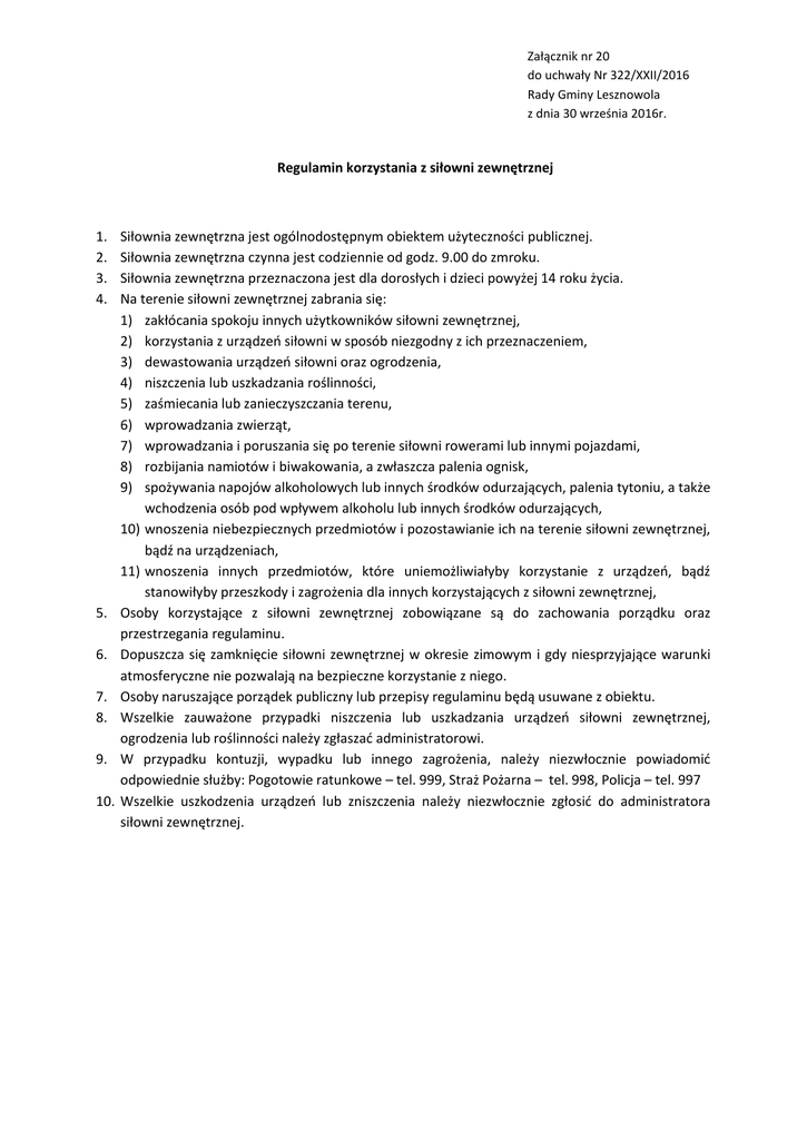 Załącznik nr 20 do uchwały Nr 322/XXII/2016 Rady Gminy Lesznowola z dnia 30 września 2016r. Regulamin korzystania z siłowni zewnętrznej 1. 2. 3. 4. 5. 6. 7. 8. 9. 10. Siłownia zewnętrzna jest ogólnodostępnym obiektem użyteczności publicznej. Siłownia zewnętrzna czynna jest codziennie od godz. 9.00 do zmroku. Siłownia zewnętrzna przeznaczona jest dla dorosłych i dzieci powyżej 14 roku życia. Na terenie siłowni zewnętrznej zabrania się: 1) zakłócania spokoju innych użytkowników siłowni zewnętrznej, 2) korzystania z urządzeń siłowni w sposób niezgodny z ich przeznaczeniem, 3) dewastowania urządzeń siłowni oraz ogrodzenia, 4) niszczenia lub uszkadzania roślinności, 5) zaśmiecania lub zanieczyszczania terenu, 6) wprowadzania zwierząt, 7) wprowadzania i poruszania się po terenie siłowni rowerami lub innymi pojazdami, 8) rozbijania namiotów i biwakowania, a zwłaszcza palenia ognisk, 9) spożywania napojów alkoholowych lub innych środków odurzających, palenia tytoniu, a także wchodzenia osób pod wpływem alkoholu lub innych środków odurzających, 10) wnoszenia niebezpiecznych przedmiotów i pozostawianie ich na terenie siłowni zewnętrznej, bądź na urządzeniach, 11) wnoszenia innych przedmiotów, które uniemożliwiałyby korzystanie z urządzeń, bądź stanowiłyby przeszkody i zagrożenia dla innych korzystających z siłowni zewnętrznej, Osoby korzystające z siłowni zewnętrznej zobowiązane są do zachowania porządku oraz przestrzegania regulaminu. Dopuszcza się zamknięcie siłowni zewnętrznej w okresie zimowym i gdy niesprzyjające warunki atmosferyczne nie pozwalają na bezpieczne korzystanie z niego. Osoby naruszające porządek publiczny lub przepisy regulaminu będą usuwane z obiektu. Wszelkie zauważone przypadki niszczenia lub uszkadzania urządzeń siłowni zewnętrznej, ogrodzenia lub roślinności należy zgłaszać administratorowi. W przypadku kontuzji, wypadku lub innego zagrożenia, należy niezwłocznie powiadomić odpowiednie służby: Pogotowie ratunkowe – tel. 999, Straż Pożarna – tel. 998, Policja – tel. 997 Wszelkie uszkodzenia urządzeń lub zniszczenia należy niezwłocznie zgłosić do administratora siłowni zewnętrznej.