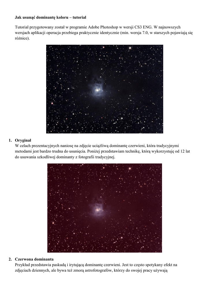 Jak usunąć dominantę koloru – tutorial Tutorial przygotowany został w programie Adobe Photoshop w wersji CS3 ENG. W najnowszych wersjach aplikacji operacja przebiega praktycznie identycznie (min. wersja 7.0, w starszych pojawiają się różnice). 1. Oryginał W celach prezentacyjnych naniosę na zdjęcie uciążliwą dominantę czerwieni, która tradycyjnymi metodami jest bardzo trudna do usunięcia. Poniżej przedstawiam technikę, którą wykorzystuję od 12 lat do usuwania szkodliwej dominanty z fotografii tradycyjnej. 2. Czerwona dominanta Przykład przedstawia paskudą i irytującą dominantę czerwieni. Jest to często spotykany efekt na zdjęciach dziennych, ale bywa też zmorą astrofotografów, którzy do swojej pracy używają zmodyfikowane lustrzanki cyfrowe (wymontowany filtr). Efekt celowo wzmocniłem, aby pokazać, jak moją techniką łatwo pozbyć się tego feleru. 3. Narzędzie Z paletki narzędzi wybieramy pipetę w wersji rozszerzonej – Color Sampler Tool, lub polski odpowiednik. Ikonka przedstawia pipetę z celownikiem. W przeciwieństwie do standardowej pipety celem Color Samplera nie jest bezpośrednie próbkowanie koloru, a zbieranie danych o kolorze z wielu dowolnie wybranych miejsc. Odczyty widoczne są w paletce „Info” (klawisz F8). 4. Obszar próbkowania W standardowym ustawieniu próbnik pobiera informacje o 1 pikselu. Jak wiemy, zdjęcie nigdy nie ma równego tła, co spowodowane jest np. szumem. Aby pominąć wpływ szumu przy odczycie wartości proponuję zmienić obszar próbkowania na 5×5 pikseli. Program uśredni wtedy wartość pikseli odczytanych z matrycy 5 na 5. W przypadku wybrania tej opcji, próbkując zdjęcie, zwracamy uwagę na to, że próbnik czyta więcej niż 1 piksel. Jeżeli chcemy odczytać dokładną wartość danego piksela zmieniamy opcję z powrotem na 1×1. 5. Odczyty Wybieramy miejsce odczytu. W przypadku zdjęcia astronomicznego naszym polem zainteresowań jest tło (czerń) oraz przeciwny koniec dynamiki – czyli przepalona gwiazda (biel). Technika usuwania dominanty, ogólnie mówiąc, wykorzystuje wiedzę o czerni, która często powinna być czarna i bieli, która na ogól jest biała. Jeżeli zdjęcia ma jakąś dominantę to badając np. czerń można dowiedzieć się, jaka to jest dominanta. A teraz zaznaczmy pierwszym wskaźnikiem (klik) tło – czyli puste miejsce bez gwiazd. Drugim kliknięciem zaznaczmy dużą gwiazdę, gdzie na pewno powinno pojawić się białe pole. 6. Info Dane z naszych odczytów wędrują do paletki Info (klawisz F8). Na czerwono zaznaczyłem miejsce, gdzie podane są wartości z naszych 2 odczytów (#1 czerń i #2 biel). 7. Poziomy (Levels) Z menu Image/Adjustments wybieramy narzędzie korekcji koloru Levels (klawisz ctrl+L w PC). Dla nas ważne są w tym okienku 2 rzeczy – trzy małe trójkąciki (selektory) pod histogramem (to ten wykres) oraz wybór kanału, którego korekcja ma dotyczyć (channel na górze – RGB). Teraz musimy przyjrzeć się widocznym w oknie Info odczytom. Zacznijmy od analizy tła, czyli pierwszego odczytu #1. Wiemy, że dotyczy to czerni, która przez komputer w zapisie 8 bitowym reprezentowana jest przez ZERO – 0:0:0. Co pokazuje pipeta na moim przykładzie? Dokładnie wartość 52:7:18. Najbliżej czerni jest środkowa wartość 7, czyli Green (G). Teraz, manipulując suwakami musimy dwie pozostałe wartości doprowadzić także do 7. Robimy to Levelsami, których okienko powinniście mieć cały czas otwarte – pkt. 7. Kanał Green (zielony) zostawiamy w tym przypadku w spokoju, bo reprezentuje najniższą wartość, do której doprowadzić musimy pozostałe. Z pull downu (rozwijane menu) Channel (kanał) wybieramy więc Red ® i następnie modyfikujemy ustawienie jednego z trzech trójkącików pod histogramem. Chcemy zmienić czerń, więc wybieramy lewy (czarny) trójkącik. Przesuwamy go w prawo do momentu, aż wartość Red osiągnie 7. Następnie wybieramy kanał Blue ( i dokładnie tak samo modyfikujemy jego wartość, aby uzyskał dokładnie taką samą liczbę 7 – jak pozostałe. Po tej operacji wszystkie trzy wartości RGB powinny pokazywać to samo, czyli 7:7:7. Powyższą operacją nasze tło doprowadziliśmy do dokładnej szarości (cyfrowej). Czas na odbarwienie jasnych partii. Robimy to bardzo podobnie do czerni, z tą różnicą, że odczyty bierzemy z pipety #2, która przedstawia wartości jasnej gwiazdy, która wg nas powinna być dokładnie biała, czyli uzyskać parametry bliskie 255:255:255. Tym razem, w oknie Levels (Poziomy) manipulujemy trójkącikiem skrajnie prawym, czyli białym. Reprezentuje on jasne partie zdjęcia, w tym wypadku biel. Pipeta przedstawia w moim przypadku wartości: 242:200:202. Ponieważ najbielsza biel w zapisie 8 bitowym to wspomniane już 255:255:255, my wybieramy najbliższą jej wartość, czyli w tym wypadku 242, za która odpowiada kanał R – czyli Red (czerwony). Oznacz to, że pozostałe dwa kanały musimy zmodyfikować tak, żeby wszystkie wskazały nam wartość 242:242:242. Wybieramy w oknie Levels kanał G (Green) i przesuwamy biały (prawy) trójkącik tak, żeby wartość odczytu #2 osiągnęła spodziewaną cyfrę 242. Tak samo robimy z kanałem B. Po naszych operacjach obydwa odczyty powinny zawierać stałe wartości RGB – czyli #1 – 7:7:7, a odczyt #2 – 242:242:242. No i voila. Poniżej skorygowane zdjęcie, które wygląda dokładnie jak oryginał. Metoda wbrew pozorom jest bardzo prosta i przedstawiona na specyficznym, łatwym do zrozumienia przykładzie. Zrozumienie przedstawionych tu zasad pozwoli na wykonywanie bardziej skomplikowanych korekt z zastosowaniem np. krzywych – czyli nie tylko w cieniach, czy światłach, ale także w tonach pośrednich. Na początek polecam tę metodę do korekty tła nieba, żeby wreszcie było czarne, a nie np. czerwone. Jeżeli macie jakieś pytania to zapraszam do komentowania. Mam nadzieję, że od dzisiaj koniec z czerwonymi zdj