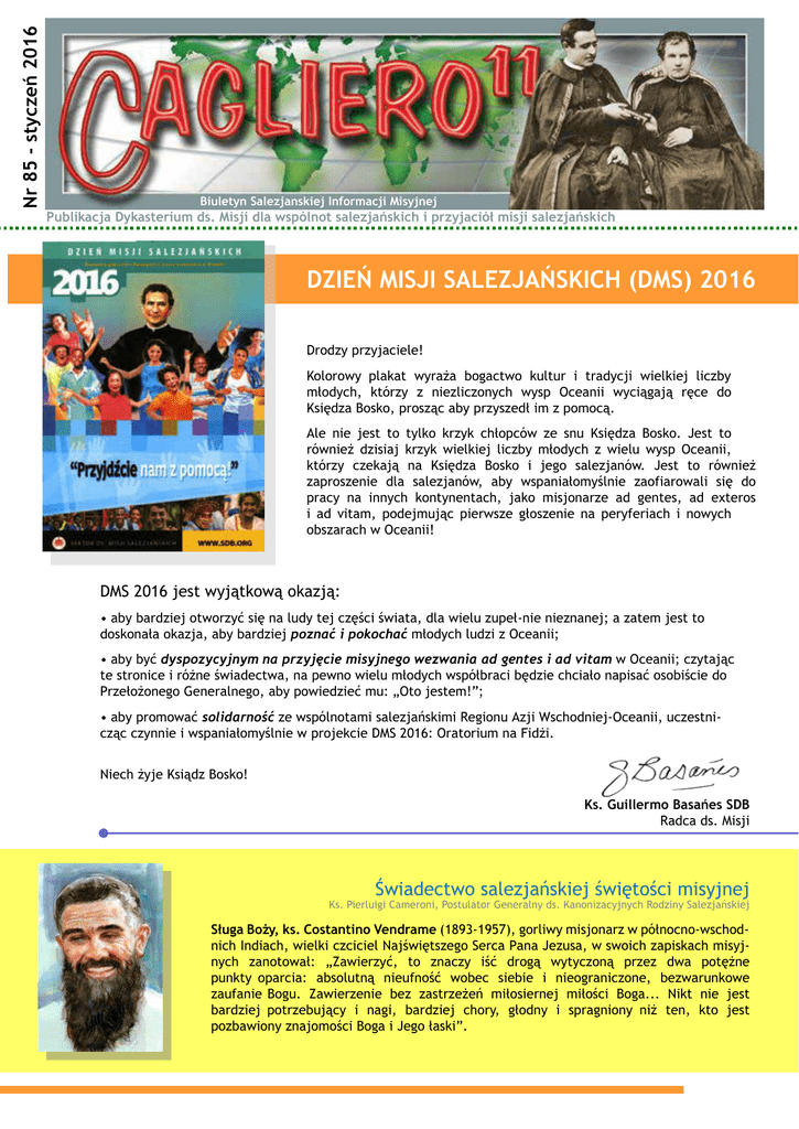 Nr 85 - styczeń 2016 Biuletyn Salezjanskiej Informacji Misyjnej Publikacja Dykasterium ds. Misji dla wspólnot salezjańskich i przyjaciół misji salezjańskich DZIEŃ MISJI SALEZJAŃSKICH (DMS) 2016 Drodzy przyjaciele! Kolorowy plakat wyraża bogactwo kultur i tradycji wielkiej liczby młodych, którzy z niezliczonych wysp Oceanii wyciągają ręce do Księdza Bosko, prosząc aby przyszedł im z pomocą. Ale nie jest to tylko krzyk chłopców ze snu Księdza Bosko. Jest to również dzisiaj krzyk wielkiej liczby młodych z wielu wysp Oceanii, którzy czekają na Księdza Bosko i jego salezjanów. Jest to również zaproszenie dla salezjanów, aby wspaniałomyślnie zaofiarowali się do pracy na innych kontynentach, jako misjonarze ad gentes, ad exteros i ad vitam, podejmując pierwsze głoszenie na peryferiach i nowych obszarach w Oceanii! DMS 2016 jest wyjątkową okazją: • aby bardziej otworzyć się na ludy tej części świata, dla wielu zupeł-nie nieznanej; a zatem jest to doskonała okazja, aby bardziej poznać i pokochać młodych ludzi z Oceanii; • aby być dyspozycyjnym na przyjęcie misyjnego wezwania ad gentes i ad vitam w Oceanii; czytając te stronice i różne świadectwa, na pewno wielu młodych współbraci będzie chciało napisać osobiście do Przełożonego Generalnego, aby powiedzieć mu: „Oto jestem!”; • aby promować solidarność ze wspólnotami salezjańskimi Regionu Azji Wschodniej-Oceanii, uczestnicząc czynnie i wspaniałomyślnie w projekcie DMS 2016: Oratorium na Fidżi. Niech żyje Ksiądz Bosko! Ks. Guillermo Basańes SDB Radca ds. Misji Świadectwo salezjańskiej świętości misyjnej Ks. Pierluigi Cameroni, Postulator Generalny ds. Kanonizacyjnych Rodziny Salezjańskiej Sługa Boży, ks. Costantino Vendrame (1893-1957), gorliwy misjonarz w północno-wschodnich Indiach, wielki czciciel Najświętszego Serca Pana Jezusa, w swoich zapiskach misyjnych zanotował: „Zawierzyć, to znaczy iść drogą wytyczoną przez dwa potężne punkty oparcia: absolutną nieufność wobec siebie i nieograniczone, bezwarunkowe zaufanie Bogu. Zawierzenie bez zastrzeżeń miłosiernej miłości Boga... Nikt nie jest bardziej potrzebujący i nagi, bardziej chory, głodny i spragniony niż ten, kto jest pozbawiony znajomości Boga i Jego łaski”. Oceania to teren żyzny dla charyzmatu salezjańskiego W ostatnim czasie odwiedziłem domy salezjańskie w różnych krajach Oceanii. Pierwszym moim odczuciem jest radość z tego, że tam naprawdę realizuje się misyjny sen naszego ukochanego Ojca Księdza Bosko! Widziałem na własne oczy ogromną różnorodność kulturową… Obecny czas to naprawdę dogodny moment, jeśli chodzi o naszą obecność w Oceanii. We wszystkich jej zakątkach jest pilna potrzeba odważnego i przekonującego głoszenia Jezusa Chrystusa. Szybko dostrzega się otwartość na Ewangelię. Wśród ludzi oddycha się prostotą, zdolną przyjąć Ewangelię jako Dobrą Nowinę. Z naszej strony zawsze musimy przestrzegać rytmów danej części świata, aby serca i umysły otworzyły się na działanie Ducha. Ważne jest nie zaniechać obfitego siewu w sercu każdego młodego człowieka: w swoim czasie On będzie wiedział jak i kiedy siew ten zaowocuje… To jest teren żyzny dla charyzmatu, aby głosić Jezusa: ziemia, gdzie charyzmat może się zakorzenić i przynieść jeszcze więcej owoców, jeśli będziemy dzisiaj wierni Księdzu Bosko i młodym w Oceanii. Zatem moim wielkim pragnieniem jest, aby Dzień Misji Salezjańskich 2016 rozpalił jeszcze bardziej w naszej ukochanej Rodzinie Salezjańskiej pasję apostolską! Salezjanie w Oceanii Ks. Ángel Fernández Artime SDB Z geograficznego punktu widzenia, Oceania obejmuje Australię, liczne wyspy, wielkie i małe, oraz olbrzymie obszary wodne. Morze i ląd, woda i ziemia spotykają się ze sobą na niezliczone sposoby, często urzekając swym pięknem. Mimo geograficznie wielkich rozmiarów Oceanii jej ludność jest nieliczna i nieregularnie rozmieszczona; składa się na nią duża liczba rdzennych ludów i imigrantów. Wielka różnorodność języków i wielkie odległości oddzielające wyspy i rejony sprawiają, że łączność stanowi tu szczególne wyzwanie. W wielu częściach Oceanii dla transportu większe znaczenie mają drogi morskie i powietrzne niż lądowe. Salezjanie przybyli do Australii w 1922 roku. To właśnie z inspektorii australijskiej wyszły dwie odważne inicjatywy. Pierwsza, przeniesienie charyzmatu salezjańskiego na Samoa w 1978 roku, co zaowocowało wieloma powołaniami oraz pracą formacyjną lokalnych katechistów; druga, przybycie i praca salezjanów na Wyspach Fidżi, począwszy od 1999 roku. Obecnie oczekują oni na utworzenie Delegatury Pacyfiku. Ostatnia zapoczątkowana obecność na Pacyfiku to Auckland w Nowej Zelandii (od 2009). Ponadto salezjanie z Filipin otworzyli w 1980 roku trudną misję w Araimiri, w Papui Nowej Gwinei, a salezjanie z Japonii zainicjowali w 1995 roku również trudną misję w Tetere, na Wyspach Salomona. W tych krajach posłannictwo salezjańskie jest realizowane w biednych regionach, wśród ludności w większości chrześcijańskiej (katolicy są mniejszością). Główne wyzwania tam to ewangelizacja i edukacja młodzieży, jak również rozwój społeczny. Od 2005 roku jest tam Delegatura Papui Nowej Gwinei i Wysp Salomona. Aby zaszczepić, rozwinąć i inkulturować charyzmat salezjański w młodych Kościołach Azji czy Oceanii potrzeba dużo cierpliwości, aby nasz duch i nasze działanie wyraziło się wiernie w lokalnych kulturach. Jest to wielkie wyzwanie, które wymaga wiedzy i miłości, zarówno w konfrontacji z własną kulturą, jak i w odniesieniu do Księdza Bosko i Zgromadzenia. Dialog pomiędzy kulturami, z których pochodzą i w jakich pracują nasi współbracia, w połączeniu ze świadectwem Ewangelii Chrystusa przeżywanej po salezjańsku, przynosi dobre owoce. Nie ma wątpliwości, że bliskoś
