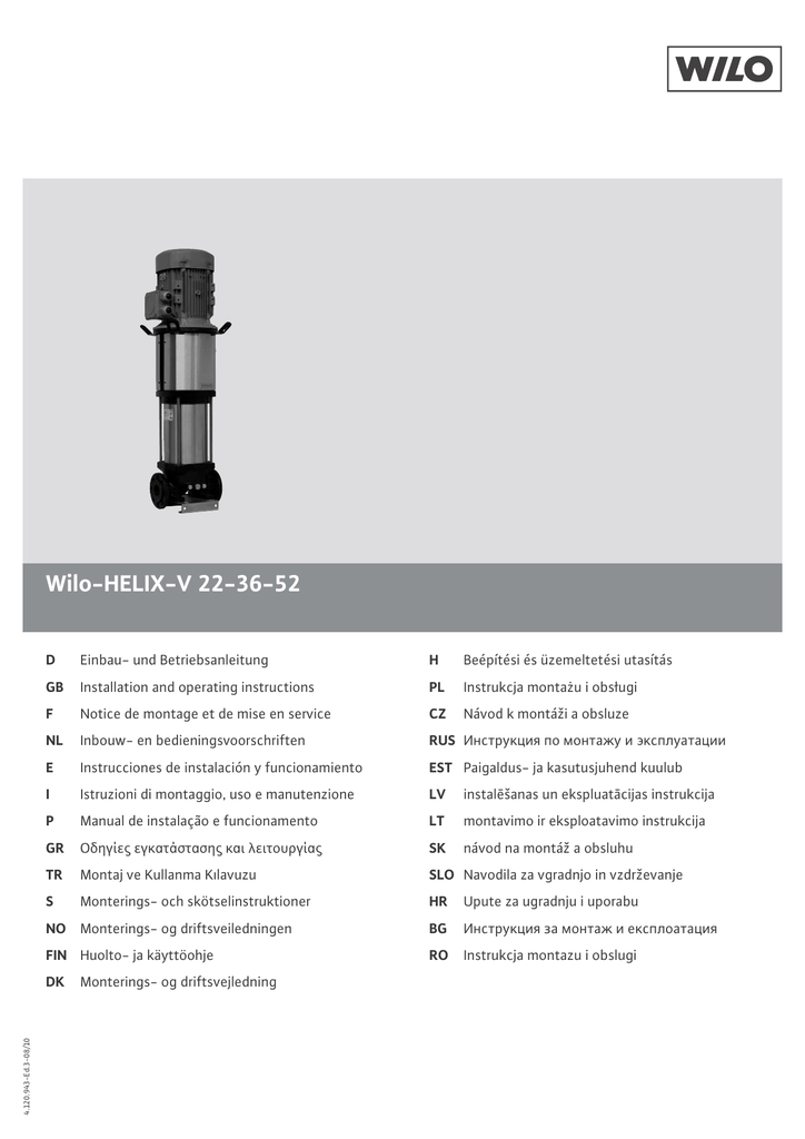 Wilo-HELIX-V 22-36-52 D Einbau- und Betriebsanleitung H Beépítési és üzemeltetési utasítás GB Installation and operating instructions PL Instrukcja montażu i obsługi F Notice de montage et de mise en service CZ Návod k montáži a obsluze NL Inbouw- en bedieningsvoorschriften RUS Инструкция по монтажу и эксплуатации E Instrucciones de instalación y funcionamiento EST Paigaldus- ja kasutusjuhend kuulub I Istruzioni di montaggio, uso e manutenzione LV instalēšanas un ekspluatācijas instrukcija P Manual de instalação e funcionamento LT montavimo ir eksploatavimo instrukcija GR Οδηγίες εγκατάστασης και λειτουργίας SK návod na montáž a obsluhu TR Montaj ve Kullanma Kılavuzu SLO Navodila za vgradnjo in vzdrževanje S Monterings- och skötselinstruktioner HR Upute za ugradnju i uporabu NO Monterings- og driftsveiledningen BG Инструкция за монтаж и експлоатация FIN Huolto- ja käyttöohje RO Instrukcja montazu i obslugi 4.120.943-Ed.3-08/10 DK Monterings- og driftsvejledning Fig. 1 Fig. 2 Fig. 3 Fig. 4 Fig. 5 Fig. 6 Fig. 7 Polski 1 Ogólne informacje 1.1 O niniejszym dokumencie Oryginał instrukcji obsługi jest napisany w języku francuskim. Wszystkie inne języki, w których napisana jest niniejsza instrukcja, to tłumaczenia z oryginału. Instrukcja montażu i obsługi stanowi część produktu. Powinna być stale dostępna w pobliżu produktu. Ścisłe przestrzeganie tej instrukcji stanowi warunek użytkowania zgodnego z przeznaczeniem oraz należytej obsługi produktu. Instrukcja montażu i obsługi jest zgodna z wykonaniem produktu i stanem norm regulujących problematykę bezpieczeństwa, obowiązujących w na dzień złożenia instrukcji do druku. 2 Bezpieczeństwo Niniejsza instrukcja obsługi zawiera podstawowe wskazówki zalecenia , które muszą być uwzględnione przy instalowaniu, uruchamianiu i pracy urządzenia. Dlatego instrukcja obsługi musi być koniecznie przeczytana przez montera i użytkownika przed przystąpieniem do montażu i uruchomienia. Należy przestrzegać nie tylko ogólnych zasad bezpieczeństwa, wymienionych w tym punkcie, ale także szczegółowych zasad bezpieczeństwa, zamieszczonych w dalszych punktach, oznaczonych symbolami niebezpieczeństw. 2.1 Oznaczenia zaleceń zawartych w instrukcji obsługi Symbole: Ogólny symbol niebezpieczeństwa Niebezpieczeństwo związane z napięciem elektrycznym ZALECENIE: ... Teksty ostrzegawcze: NIEBEZPIECZEŃSTWO! Bardzo niebezpieczna sytuacja. Nieprzestrzeganie grozi ciężkimi obrażeniami, a nawet śmiercią. UWAGA! Użytkownik może doznać (ciężkich) obrażeń w razie nieprzestrzegania wskazówki. OSTROŻNIE! Niebezpieczeństwo uszkodzenia pompy/urządzenia. "Ostrożnie" oznacza możliwość uszkodzenia produktu w przypadku niezastosowania się do wskazówki. ZALECENIE: Użyteczna wskazówka dotycząca posługiwania się produktem. Zwraca uwagę na potencjalne trudności. 2.2 Kwalifikacje personelu Personel wykonujący montaż musi posiadać odpowiednie kwalifikacje do wykonania tych zadań. 90 2.3 Niebezpieczeństwa wynikające z nieprzestrzegania zaleceń Nieprzestrzeganie zasad bezpieczeństwa może doprowadzić do zagrożenia dla osób oraz spowodować uszkodzenie pompy/urządzenia. Nieprzestrzeganie zasad bezpieczeństwa pociągną za sobą powoduje utratę wszelkich praw do gwarancji i odszkodowania. W szczególności nieprzestrzeganie tych zasad może nieść ze sobą następujące zagrożenia: • niewłaściwe działanie ważnych funkcji pompy/ urządzenia, • nieskuteczność zabiegów konserwacyjnych i napraw, • zagrożenie ludzi działaniem czynników elektrycznych, mechanicznych i bakteriologicznych, • szkody materialne. 2.4 Zalecenia dla użytkowników Należy przestrzegać obowiązujących zasad bezpieczeństwa i higieny pracy. Należy wyeliminować zagrożenia związane z energią elektryczną. Należy przestrzegać przepisów [np. IEC, VDE itd.] oraz zaleceń lokalnego zakładu energetycznego. 2.5 Zalecenia dla prac montażowych i sprawdzających Użytkownik jest zobowiązany do zapewnienia wykonania wszystkich czynności związanych z przeglądami i montażem przez autoryzowanych, odpowiednio wykwalifikowanych specjalistów, po dokładnym zapoznaniu się z instrukcją obsługi. Prace na pompie/instalacji mogą być wykonywane tylko w czasie jej postoju. 2.6 Samowolna przebudowa i stosowanie niewłaściwych części zamiennych Zmiany w pompie/instalacji są dopuszczalne tylko w uzgodnieniu z producentem. Celem stosowania oryginalnych części zamiennych i atestowanego osprzętu jest zapewnienie bezpieczeństwa. Zastosowanie innych części zwalnia producenta z odpowiedzialności za wynikające z tego skutki 2.7 Niedopuszczalne sposoby pracy Bezpieczeństwo eksploatacji dostarczonej pompy/urządzenia jest gwarantowane tylko pod warunkiem jej użycia zgodnego z przeznaczeniem wg punktu 4 instrukcji obsługi. Wartości graniczne, podane w katalogu/specyfikacji, nie mogą być przekraczane (odpowiednio w górę lub w dół). 3. Transport i magazynowanie Po otrzymaniu produktu natychmiast sprawdzić, czy nie uległ uszkodzeniom podczas transportu. W razie stwierdzenia uszkodzeń transportowych należy z zachowaniem odpowiedniego terminu podjąć stosowne kroki wobec spedytora. OSTROŻNIE! Wpływy zewnętrzne mogą spowodować uszkodzenia. Jeżeli materiał ma być zamontowany później, należy go składować w suchym miejscu. Produkt należy chronić przed upadkiem/uderzeniem oraz wpływami zewnętrznymi (wilgoć, mróz itd. ...). Z pompą należy obchodzić się ostrożnie, aby nie uszkodzić produktu przed montażem. WILO SE 08/2010 Polski 4. Zakres zastosowania Zasadniczą funkcją pompy jest przetłaczanie zimnej i ciepłej wody, mieszanek woda-glikol lub innych mediów o niskiej lepkości, które nie zawierają olejów mineralnych, stałych lub ciągnących elementów, lub mater