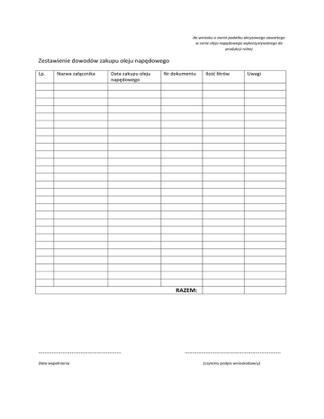 do wniosku o zwrot podatku akcyzowego zawartego w cenie oleju napędowego wykorzystywanego do produkcji rolnej Zestawienie dowodów zakupu oleju napędowego Lp. Nazwa załącznika Data zakupu oleju napędowego Nr dokumentu Ilość litrów Uwagi RAZEM: ………………………………………………. Data wypełnienia ………………………………………………………. (czytelny podpis wnioskodawcy)