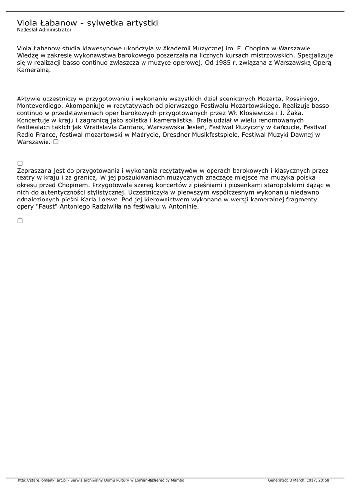 Viola Łabanow - sylwetka artystki Nadesłał Administrator Viola Łabanow studia klawesynowe ukończyła w Akademii Muzycznej im. F. Chopina w Warszawie. Wiedzę w zakresie wykonawstwa barokowego poszerzała na licznych kursach mistrzowskich. Specjalizuje się w realizacji basso continuo zwłaszcza w muzyce operowej. Od 1985 r. związana z Warszawską Operą Kameralną. Aktywie uczestniczy w przygotowaniu i wykonaniu wszystkich dzieł scenicznych Mozarta, Rossiniego, Monteverdiego. Akompaniuje w recytatywach od pierwszego Festiwalu Mozartowskiego. Realizuje basso continuo w przedstawieniach oper barokowych przygotowanych przez Wł. Kłosiewicza i J. Żaka. Koncertuje w kraju i zagranicą jako solistka i kameralistka. Brała udział w wielu renomowanych festiwalach takich jak Wratislavia Cantans, Warszawska Jesień, Festiwal Muzyczny w Łańcucie, Festival Radio France, festiwal mozartowski w Madrycie, Dresdner Musikfestspiele, Festiwal Muzyki Dawnej w Warszawie. Zapraszana jest do przygotowania i wykonania recytatywów w operach barokowych i klasycznych przez teatry w kraju i za granicą. W jej poszukiwaniach muzycznych znaczące miejsce ma muzyka polska okresu przed Chopinem. Przygotowała szereg koncertów z pieśniami i piosenkami staropolskimi dążąc w nich do autentyczności stylistycznej. Uczestniczyła w pierwszym współczesnym wykonaniu niedawno odnalezionych pieśni Karla Loewe. Pod jej kierownictwem wykonano w wersji kameralnej fragmenty opery "Faust" Antoniego Radziwiłła na festiwalu w Antoninie. http://stare.lomianki.art.pl - Serwis archiwalny Domu Kultury w Łomiankach Powered by Mambo Generated: 3 March, 2017, 20:58