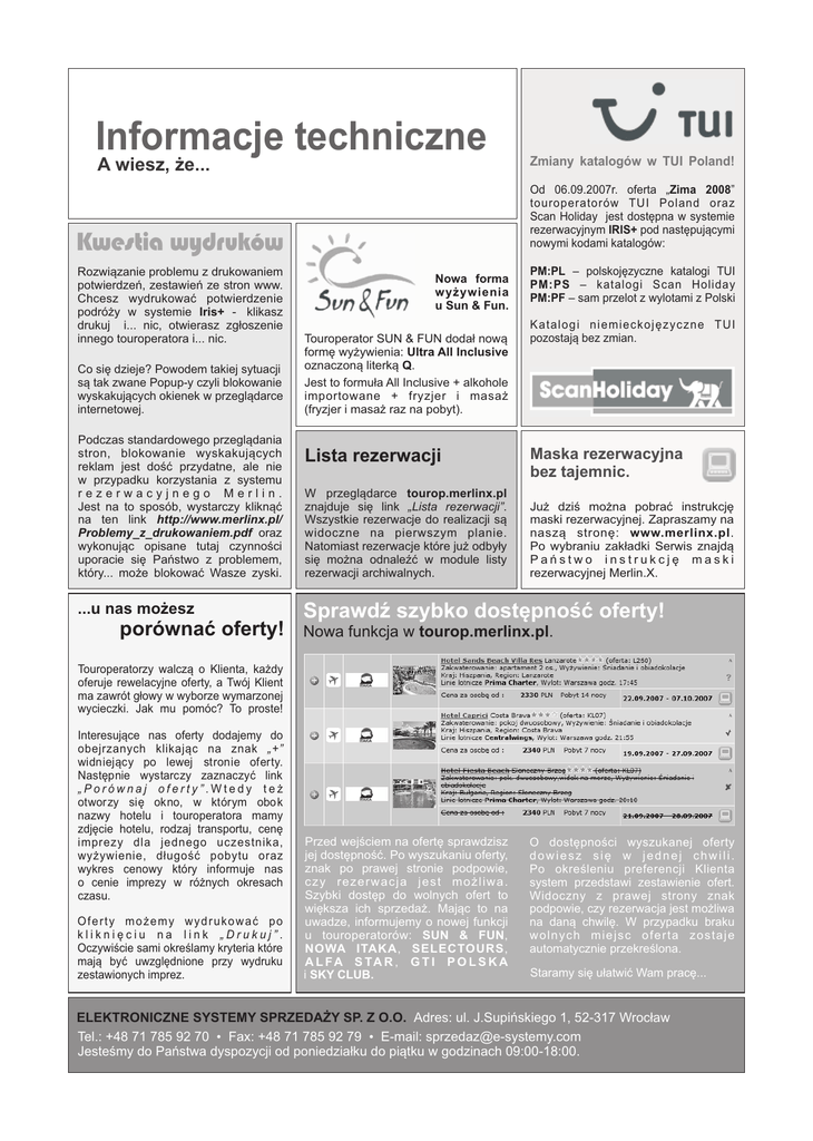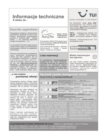 Informacje techniczne A wiesz, ¿e... Od 06.09.2007r. oferta „Zima 2008” touroperatorów TUI Poland oraz Scan Holiday jest dostêpna w systemie rezerwacyjnym IRIS+ pod nastêpuj¹cymi nowymi kodami katalogów: Kwestia wydruków Rozwi¹zanie problemu z drukowaniem potwierdzeñ, zestawieñ ze stron www. Chcesz wydrukowaæ potwierdzenie podró¿y w systemie Iris+ - klikasz drukuj i... nic, otwierasz zg³oszenie innego touroperatora i... nic. Co siê dzieje? Powodem takiej sytuacji s¹ tak zwane Popup-y czyli blokowanie wyskakuj¹cych okienek w przegl¹darce internetowej. Zmiany katalogów w TUI Poland! Nowa forma wy¿ywienia u Sun & Fun. Touroperator SUN & FUN doda³ now¹ formê wy¿ywienia: Ultra All Inclusive oznaczon¹ literk¹ Q. Jest to formu³a All Inclusive + alkohole importowane + fryzjer i masa¿ (fryzjer i masa¿ raz na pobyt). PM:PL – polskojêzyczne katalogi TUI PM:PS – katalogi Scan Holiday PM:PF – sam przelot z wylotami z Polski Katalogi niemieckojêzyczne TUI pozostaj¹ bez zmian. Podczas standardowego przegl¹dania stron, blokowanie wyskakuj¹cych reklam jest doœæ przydatne, ale nie w przypadku korzystania z systemu rezerwacyjnego Merlin. Jest na to sposób, wystarczy klikn¹æ na ten link http://www.merlinx.pl/ Problemy_z_drukowaniem.pdf oraz wykonuj¹c opisane tutaj czynnoœci uporacie siê Pañstwo z problemem, który... mo¿e blokowaæ Wasze zyski. W przegl¹darce tourop.merlinx.pl znajduje siê link „Lista rezerwacji”. Wszystkie rezerwacje do realizacji s¹ widoczne na pierwszym planie. Natomiast rezerwacje które ju¿ odby³y siê mo¿na odnaleŸæ w module listy rezerwacji archiwalnych. ...u nas mo¿esz SprawdŸ szybko dostêpnoœæ oferty! porównaæ oferty! Lista rezerwacji Maska rezerwacyjna bez tajemnic. Ju¿ dziœ mo¿na pobraæ instrukcjê maski rezerwacyjnej. Zapraszamy na nasz¹ stronê: www.merlinx.pl. Po wybraniu zak³adki Serwis znajd¹ Pañstwo instrukcjê maski rezerwacyjnej Merlin.X. Nowa funkcja w tourop.merlinx.pl. Touroperatorzy walcz¹ o Klienta, ka¿dy oferuje rewelacyjne oferty, a Twój Klient ma zawrót g³owy w wyborze wymarzonej wycieczki. Jak mu pomóc? To proste! Interesuj¹ce nas oferty dodajemy do obejrzanych klikaj¹c na znak „+” widniej¹cy po lewej stronie oferty. Nastêpnie wystarczy zaznaczyæ link „Porównaj oferty”.Wtedy te¿ otworzy siê okno, w którym obok nazwy hotelu i touroperatora mamy zdjêcie hotelu, rodzaj transportu, cenê imprezy dla jednego uczestnika, wy¿ywienie, d³ugoœæ pobytu oraz wykres cenowy który informuje nas o cenie imprezy w ró¿nych okresach czasu. Oferty mo¿emy wydrukowaæ po klikniêciu na link „Drukuj”. Oczywiœcie sami okreœlamy kryteria które maj¹ byæ uwzglêdnione przy wydruku zestawionych imprez. Przed wejœciem na ofertê sprawdzisz jej dostêpnoœæ. Po wyszukaniu oferty, znak po prawej stronie podpowie, czy rezerwacja jest mo¿liwa. Szybki dostêp do wolnych ofert to wiêksza ich sprzeda¿. Maj¹c to na uwadze, informujemy o nowej funkcji u touroperatorów: SUN & FUN, NOWA ITAKA, SELECTOURS, A L F A S TA R , G T I P O L S K A i SKY CLUB. O dostêpnoœci wyszukanej oferty dowiesz siê w jednej chwili. Po okreœleniu preferencji Klienta system przedstawi zestawienie ofert. Widoczny z prawej strony znak podpowie, czy rezerwacja jest mo¿liwa na dan¹ chwilê. W przypadku braku w o l n ych m i e j sc o fe r ta z o s ta j e automatycznie przekreœlona. Staramy siê u³atwiæ Wam pracê... ELEKTRONICZNE SYSTEMY SPRZEDA¯Y SP. Z O.O. Adres: ul. J.Supiñskiego 1, 52-317 Wroc³aw Tel.: +48 71 785 92 70 • Fax: +48 71 785 92 79 • E-mail: [email protected] Jesteœmy do Pañstwa dyspozycji od poniedzia³ku do pi¹tku w godzinach 09:00-18:00.