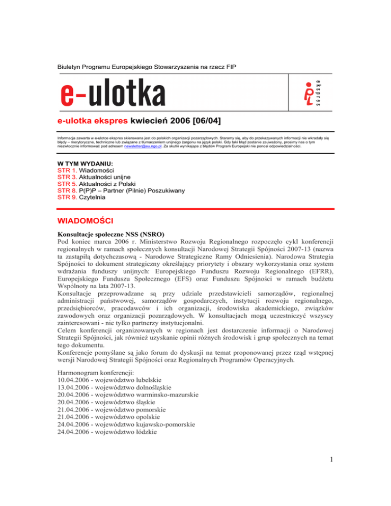 Biuletyn Programu Europejskiego Stowarzyszenia na rzecz FIP e-ulotka ekspres kwiecień 2006 [06/04] Informacja zawarta w e-ulotce ekspres skierowana jest do polskich organizacji pozarządowych. Staramy się, aby do przekazywanych informacji nie wkradały się błędy – merytoryczne, techniczne lub związane z tłumaczeniem unijnego żargonu na język polski. Gdy taki błąd zostanie zauważony, prosimy nas o tym niezwłocznie informować pod adresem [email protected]. Za skutki wynikające z błędów Program Europejski nie ponosi odpowiedzialności. W TYM WYDANIU: STR 1. Wiadomości STR 3. Aktualności unijne STR 5. Aktualności z Polski STR 8. P(P)P – Partner (Pilnie) Poszukiwany STR 9. Czytelnia WIADOMOŚCI Konsultacje społeczne NSS (NSRO) Pod koniec marca 2006 r. Ministerstwo Rozwoju Regionalnego rozpoczęło cykl konferencji regionalnych w ramach społecznych konsultacji Narodowej Strategii Spójności 2007-13 (nazwa ta zastąpiłą dotychczasową - Narodowe Strategiczne Ramy Odniesienia). Narodowa Strategia Spójności to dokument strategiczny określający priorytety i obszary wykorzystania oraz system wdrażania funduszy unijnych: Europejskiego Funduszu Rozwoju Regionalnego (EFRR), Europejskiego Funduszu Społecznego (EFS) oraz Funduszu Spójności w ramach budżetu Wspólnoty na lata 2007-13. Konsultacje przeprowadzane są przy udziale przedstawicieli samorządów, regionalnej administracji państwowej, samorządów gospodarczych, instytucji rozwoju regionalnego, przedsiębiorców, pracodawców i ich organizacji, środowiska akademickiego, związków zawodowych oraz organizacji pozarządowych. W konsultacjach mogą uczestniczyć wszyscy zainteresowani - nie tylko partnerzy instytucjonalni. Celem konferencji organizowanych w regionach jest dostarczenie informacji o Narodowej Strategii Spójności, jak również uzyskanie opinii różnych środowisk i grup społecznych na temat tego dokumentu. Konferencje pomyślane są jako forum do dyskusji na temat proponowanej przez rząd wstępnej wersji Narodowej Strategii Spójności oraz Regionalnych Programów Operacyjnych. Harmonogram konferencji: 10.04.2006 - województwo lubelskie 13.04.2006 - województwo dolnośląskie 20.04.2006 - województwo warminsko-mazurskie 20.04.2006 - województwo śląskie 21.04.2006 - województwo pomorskie 21.04.2006 - województwo opolskie 24.04.2006 - województwo kujawsko-pomorskie 24.04.2006 - województwo łódzkie 1 10.05.2006 - województwo małopolskie 10.05.2006 - województwo lubuskie 11.05.2006 - województwo świętokrzyskie 11.05.2006 - województwo podlaskie 12.05.2006 - województwo podkarpackie 12.05.2006 - województwo mazowieckie W maju rozpocząć się mają również konferencje w ramach konsultacji sektorowych NSS i programów operacyjnych, które potrwają do września. Szczegółowe informacje na temat Narodowej Strategii Spójności 2007-13 i konsultacji społecznych znajdują się w portalu informacyjnym Ministerstwa Rozwoju Regionalnego poświęconym funduszom strukturalnym pod adresem www.funduszestrukturalne.gov.pl/nss oraz na stronie www.nss.ngo.pl mającej stanowić pomoc dla organizacji pozarządowych w konsultacji dokumentów programowych. Porozumienie budżetowe na lata 2007-2013 Parlament Europejski i Prezydencja Austriacka osiągnęli na początku kwietnia 2006 r. kompromis w sprawie długoterminowego budżetu na lata 2007-2013. Po trwających od stycznia negocjacjach eurodeputowani zgodzili się na wydatki w kwocie 866,4 mld euro, czyli o 4 mld więcej niż wynosi kwota wynegocjowana podczas grudniowego szczytu. Porozumienie przewiduje, że na wybrane działania Unii Europejskiej będą dodatkowe 4 mld euro w ciągu siedmiu lat. Jednak budżet UE wzrośnie tylko o 2 mld do 864,4 mld euro. Na znalezienie pozostałych środków pozwoli przesunięcie funduszy przeznaczonych na inne dziedziny (jak pomoc dla krajów poza UE) poza budżet. Wynik trwających od stycznia negocjacji przedstawicieli Parlamentu Europejskiego i rządów krajów członkowskich musi jeszcze zatwierdzić Parlament Europejski i Rada Unii Europejskiej (skupiająca rządy). Dodatkowe pieniądze zostaną przekazane przede wszystkim na edukację, w tym finansowanie programu wymiany studentów Erasmus oraz na politykę zagraniczną i bezpieczeństwo Unii. Zwiększone zostaną także wydatki na kulturę, programy skierowane do młodzieży i ochronę konsumentów, rozwój transeuropejskich sieci elektroenergetycznych i gazowych, wspieranie małych i średnich przedsiębiorstw, badania i rozwój, ponadgraniczną współpracę regionów, politykę sąsiedzką (w tym wspieranie demokratycznych przemian na Białorusi i Ukrainie) oraz politykę społeczną. Porozumienie oznacza, że UE ma na najbliższe siedem lat zapewnione stabilne podstawy finansowe i uniknęła ryzyka oparcia wydatków o budżety roczne, na czym traciłyby nowe kraje członkowskie. Dla Polski oznacza to, że uzgodnione na szczycie w Brukseli 60 mld euro na lata 2007-13 w ramach Funduszy Strukturalnych i spójności będą mogły być uruchomione. Zgoda eurodeputowanych była bowiem niezbędna, aby osiągnięty na szczycie kompromis mógł wejść w życie. Więcej informacji o budżecie na lata 2007-2013 można znaleźć na stronie: www.europarl.eu.int/news/expert/infopress_page/034-6970-095-04-14-905-20060330IPR0687605-04-2006-2006-false/default_en.htm 2 AKTUALNOŚCI UNIJNE KONKURSY Wzmacnianie społeczeństwa obywatelskiego w Republice Mołdowy Do 21 kwietnia 2006 r. można składać w Komisji Europejskiej wnioski o dofinansowanie projektów w ramach programu Tacis, mających na celu wzmacnianie możliwości mołdawskich organizacji pozarządowych działających w sektorze społecznym. Przykłady finansowanych działań: kampanie podnoszące świadomość społeczną; publikacja podręczników i broszur o dobrych praktykach; organizacja konferencji, warszatatów, szkoleń i seminariów; badanie opinii; wymiana studentów i wykładowców