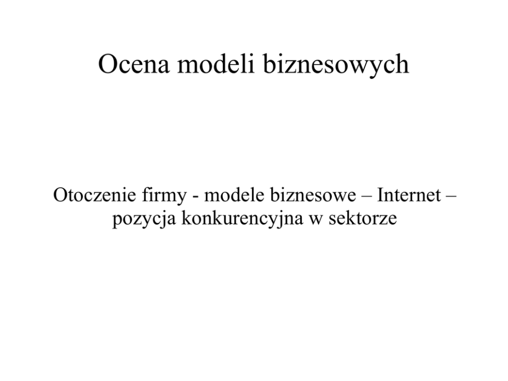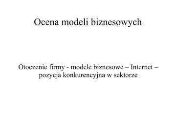 Ocena modeli biznesowych Otoczenie firmy - modele biznesowe – Internet – pozycja konkurencyjna w sektorze Wybrana cele przedsiębiorstwa ● ● ● ● Ekonomiczne – optymalizacja kosztów np. w kontekście relacji z klientem – poprawa wyników ekonomicznych Rynkowe – poprawa pozycji konkurencyjnej – zwiększenie skali działalności – wejście na nowe rynki, segmenty Strategiczne – zwiększenie elastyczności działania – koncentracja na wybranych/strategicznych obszarach działania przedsiębiorstwa – zwiększenie skuteczności działania – dostęp do zewnętrznego know-how Operacyjne – ● Organizacyjne – ● podniesienie jakości realizowanych procesów operacyjnych być może uproszczenie struktury organizacyjnej Motywacyjne – łatwość porównywania wyników/skuteczności działania pracowników Obszary wykorzystania IT w CZT Aplikacje do przechowywani a i zarządzania wiedzą Procedury pracy workflow Routing elektroniczna konwersja Aplikacje e-Learning Przechowywanie wiedzy jawnej Zarządzanie dokumentami Di alo g P ubl ik o dystr wanie ybuc ja Automatyzacja zawierania umów i sprzedaży dyn Koor acja Konferencje w sieci odsyłacze do wiedzy specjalistycznej Szkolenia, studia Technologia Informacyjna w Centrum Zaawansowanych Technologii Rozmowy Społeczności Internetowe Przechowywanie wiedzy ukrytej Dystrybucja łączność publikowanie Współpraca Portal korporacyjny i Intranet Narzędzia pracy grupowej Ekstranet VPN Dane operacyjne eksploracja danych odkrywanie wiedzy weryfikacja oczyszczenie Hurtownie danych również internetowe Wspólne obszary robocze Właściwości Internetu Właściwości Internetu • Technologia pośrednicząca • Globalny zasięg • Sieciowy efekt zewnętrzny • Kanał dystrybucji • Moderacja czasu • Redukcja asymetrii zasobów inforamcji • Niskończona pojemość wirtualna • Tani standard • Twórcza destrukcja • Zmniejszenie kosztów transakcji • Koordynacja • Obórt handlowy • Budowanie społeczności • Prezentacja treści • Komunikowanie się Model biznesowy Kreowanie strategii e-marketingu dla innowacji Analiza otoczenia Wprowadzenie produktu na rynek Ocena modelu biznesowego firmy Jakie są silne i słabe strony firmy ? Jakie okoliczności zapewniły firmie osiągnięcie przewagi konkurencyjnej ? Czy te warunki dadzą się utrzymać ? Model Biznesowy Zmiana Wynik Rozwój Internetu Zmiany strategiczne Zmiany w skali makro Otoczenie Ocena bieżących wyników firmy. Czy firma ma trwałą przewagę konkurencyjną Analiza otoczenia konkurencyjnego Ocena modeli biznesowych konkurencji Pięć sił wpływających na atrakcyjność branży (model Portera ) Prawdopodobne działania i kontr działania rywali Czynniki tworzące wartość w branży Jakie są główne czynniki kosztotwórcze i źródła różnicowania produktu Otoczenie makroekonomiczne Siły ekonomiczne , społeczne , demograficzne i polityczne Szanse i Zagrożenia Obawa przed substytucyjnymi produktami i us ługami Siła przetargowa dostawców (+/-) Sprzeda ż z wykorzystaniem Internetu umożliwia wzrost przewagi dostawców - daje dostawcą większy dostęp do klientów (-) Internet jest kanałem dystrybucji umożliwiającym dotarcie do konsumenta z pominięciem pośredników (-) Dostawy via Internet oraz rynki wirtualne dają wszystkim podmiotom równy dostęp do dostawców i ograniczają zaopatrzenie do standardowych produktów eliminując zróżnicowanie (-) Redukcja barier wejścia na rynek oraz zwiększenie się liczby konkurentów zwiększa siłę przetargową dostawców (+) Przez usprawnienie dzia łania przedsiębiorstw Internet może powodować poszerzenie się rynków. (-) Popularność zastosowania Internetu w biznesie i nie tylko powoduje zwiększenie sie ilości produktów substytucyjnych Klienci Rywalizacja pomiędzy dotychczasowymi konkurentami Siła przetargowa kanału (-) Zacieraie się różnic pomiędzy poszczególnymi konkurentami i ich ofertą rynkową (-) Przeniesienie walki konkurencyjnej na ceny (-) Rozszerzenie się rynków geograficznych zwiększenie się liczby konkurentów (-) Niskie koszty zmienne w porównaniu do kosztów stałych i nacisk na obniżanie cen Bariery wejścia na rynek Siła przetargowa użytkownika końcowego (+) Eliminacja niekt órych kanałów i poprawienie mo żłiwości negocjacyjnych w tadycyjnych kanałach (-) Redukcja barier wejścia na rynek takich jak agenci handlowi, dostęp do kanałów dystrybucji czy aktywa wszystko to, co Technologia Internetowa eliminuje lub ułatwia w barierach wchodzenia na rynek (-) Aplikacje Internetowe są trudne do zastrzeżenia dla nowo wchodzących na rynek (-) Łatwość dostępu dla wszystkiego rodzaju gałęzi przemysłu. (-) Przeniesienie pozycji negocjacyjnej na u żytkownika końcowego (-) redukcja kosztów zmiennych Schemat modelu biznesowego Model biznesowy ● Wartość oferowane klientowi ● Zakres oferty ● Polityka cenowa ● Źródła przychodów ● Działania (funkcje) powiązane ● Realizacja modelu ● Umiejętności firmy ● Trwałość przewagi konkurencyjnej Wynik Internet Otoczenie Klasyfikacja modeli biznesowych ● Model pośrednika ● Model reklamowy ● Model pośrednika informacyjnego ● Model kupca ● Model producenta ● Model sieci afiliowanej ● Model wirtualnej wspólnoty ● Model abonencki ● Model taryfowy Dynamika modelu biznesowego Sama technologia nie gwarantuje osiągnięcia zysku ● ● Możliwość imitowania wynalazku lub technologii – mała możliwość wynika z podstaw prawnych lub braku zdolności/zasobów niezbędnych do przeprowadzenia imitacji Aktywa komplementarne – to wszelkie umiejętności pozwalające firmie na eksploatację danego rozwiązania z wyjątkiem możliwości zapewniających powstanie technologii lub wynalazku Aktywa komplementarne ● Marka ● Potencjał wytwórczy ● Funkcje marketingowe ● Kanały dystrybucji ● Serwis posprzedażowy ● Reputacja ● Asortyment produkt