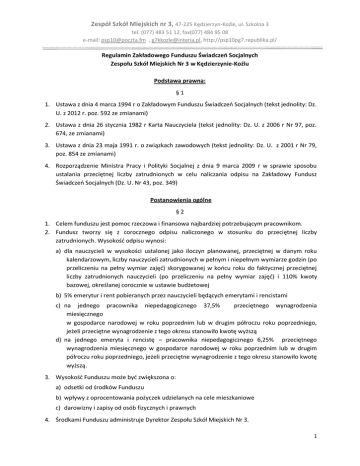 Zespół Szkół Miejskich nr 3, 47-225 Kędzierzyn-Koźle, ul. Szkolna 3 tel. (077) 483 51 12, fax(077) 484 95 08 e-mail: [email protected] , [email protected], http://psp10pg7.republika.pl/ Regulamin Zakładowego Funduszu Świadczeń Socjalnych Zespołu Szkół Miejskich Nr 3 w Kędzierzynie-Koźlu Podstawa prawna: §1 1. Ustawa z dnia 4 marca 1994 r o Zakładowym Funduszu Świadczeń Socjalnych (tekst jednolity: Dz. U. z 2012 r. poz. 592 ze zmianami) 2. Ustawa z dnia 26 stycznia 1982 r Karta Nauczyciela (tekst jednolity: Dz. U. z 2006 r Nr 97, poz. 674, ze zmianami) 3. Ustawa z dnia 23 maja 1991 r. o związkach zawodowych (tekst jednolity: Dz. U. z 2001 r Nr 79, poz. 854 ze zmianami) 4. Rozporządzenie Ministra Pracy i Polityki Socjalnej z dnia 9 marca 2009 r w sprawie sposobu ustalania przeciętnej liczby zatrudnionych w celu naliczania odpisu na Zakładowy Fundusz Świadczeń Socjalnych (Dz. U. Nr 43, poz. 349) Postanowienia ogólne §2 1. Celem funduszu jest pomoc rzeczowa i finansowa najbardziej potrzebującym pracownikom. 2. Fundusz tworzy się z corocznego odpisu naliczonego w stosunku do przeciętnej liczby zatrudnionych. Wysokość odpisu wynosi: a) dla nauczycieli w wysokości ustalonej jako iloczyn planowanej, przeciętnej w danym roku kalendarzowym, liczby nauczycieli zatrudnionych w pełnym i niepełnym wymiarze godzin (po przeliczeniu na pełny wymiar zajęć) skorygowanej w końcu roku do faktycznej przeciętnej liczby zatrudnionych nauczycieli (po przeliczeniu na pełny wymiar zajęć) i 110% kwoty bazowej, określanej corocznie w ustawie budżetowej b) 5% emerytur i rent pobieranych przez nauczycieli będących emerytami i rencistami c) na jednego pracownika niepedagogicznego 37,5% przeciętnego wynagrodzenia miesięcznego w gospodarce narodowej w roku poprzednim lub w drugim półroczu roku poprzedniego, jeżeli przeciętne wynagrodzenie z tego okresu stanowiło kwotę wyższą d) na jednego emeryta i rencistę – pracownika niepedagogicznego 6,25% przeciętnego wynagrodzenia miesięcznego w gospodarce narodowej w roku poprzednim lub w drugim półroczu roku poprzedniego, jeżeli przeciętne wynagrodzenie z tego okresu stanowiło kwotę wyższą. 3. Wysokość Funduszu może być zwiększona o: a) odsetki od środków Funduszu b) wpływy z oprocentowania pożyczek udzielanych na cele mieszkaniowe c) darowizny i zapisy od osób fizycznych i prawnych 4. Środkami Funduszu administruje Dyrektor Zespołu Szkół Miejskich Nr 3. 1 Zespół Szkół Miejskich nr 3, 47-225 Kędzierzyn-Koźle, ul. Szkolna 3 tel. (077) 483 51 12, fax(077) 484 95 08 e-mail: [email protected] , [email protected], http://psp10pg7.republika.pl/ 5. Coroczny plan wydatkowania zatwierdza pracodawca w uzgodnieniu z przedstawicielami zakładowych organizacji związkowych, zwanymi dalej Związkami. 6. Plan wydatkowania jest ustalany corocznie w terminie jednego miesiąca po otrzymaniu naliczenia odpisu na Fundusz, dokonanego przez Dział Finansowy 7. Plan wydatkowania zawiera podział środków Funduszu na poszczególne rodzaje działalności oraz kwot bazowych na podstawie, których oblicza się pomoc finansową lub rzeczową dla uprawnionych do korzystania z funduszu. 8. Zmian w planie wydatkowania Funduszu może dokonać Pracodawca w uzgodnieniu ze Związkami. 9. Fundusz jest funduszem celowym i niekorzystanie z jego świadczeń nie uprawnia do żądania ekwiwalentu. 10. Świadczenia socjalne finansowane z Funduszu nie są świadczeniami należnymi. Osoby, których wnioski nie zostały zaakceptowane (z podaniem przyczyny), nie mogą rościć pretensji do jakiejkolwiek wypłaty z tego tytułu w późniejszym terminie. 11. Decyzja pracodawcy odmawiająca świadczenia jest ostateczna. Osoby uprawnione do korzystania z Zakładowego Funduszu Świadczeń Socjalnych: §3 1. Do korzystania z Funduszu uprawnieni są: 1) Zatrudnieni w Zespole Szkół Miejskich Nr 3 w Kędzierzynie-Koźlu pracownicy, niezależnie od rodzaju umowy o pracę oraz od wymiaru czasu pracy. 2) Pracownicy przebywający na urlopach zdrowotnych, wychowawczych, macierzyńskich. 3) Emeryci i renciści – byli pracownicy Zespołu Szkół Miejskich Nr 3 w Kędzierzynie-Koźlu dla których Szkoła był ostatnim miejscem pracy przed przejściem na emeryturę, świadczenie kompensacyjne lub rentę. 4) Członkowie rodzin pracowników, emerytów i rencistów, do których zalicza się: a) współmałżonków i rodziców, jeżeli prowadzą wspólnie z uprawnionym gospodarstwo domowe (wyłącznie w zakresie, o którym mowa w § 8), b) pozostające na utrzymaniu i wychowaniu osoby uprawnionej dzieci własne, przysposobione lub przyjęte na wychowanie w ramach rodziny zastępczej uczące się i nie pracujące jednak nie dłużej niż do ukończenia 25 roku życia (liczy się rok ukończenia). Fakt kontynuowania nauki należy potwierdzić stosownym zaświadczeniem lub kserokopią aktualnej legitymacji szkolnej lub studenckiej, c) osoby wymienione w punkcie 4b), w stosunku do których orzeczono znaczny lub umiarkowany stopień niepełnosprawności – bez względu na wiek, d) dzieci pracowników zmarłych w czasie zatrudnienia oraz emerytów i rencistów, upoważnione do pobierania renty rodzinnej po zmarłym pracowniku, emerycie lub renciście (wyłącznie w zakresie, o którym mowa w § 8). 5) Uprawnienia do korzystania z Funduszu, jako członkowie rodziny, tracą osoby wymienione w ust. 1 pkt. 4d) w przypadku wstąpienia w związek małżeński. 2 Zespół Szkół Miejskich nr 3, 47-225 Kędzierzyn-Koźle, ul. Szkolna 3 tel. (077) 483 51 12, fax(077) 484 95 08 e-mail: [email protected] , [email protected], http://psp10pg7.republika.pl/ Przeznaczenie Zakładowego Funduszu Świadczeń Socjalnych §4 1. Podział Funduszu na dany rok kalendarzowy następuje na podstawie rocznego planu finansowego dochodów i wydatków Funduszu. 2. Nauczycielom – zgodnie z art. 53 ustawy z dnia 26 stycznia 1982 – Karta Nauczyciela (Dz. U. Nr 56 z 1997 r, poz. 357 z p