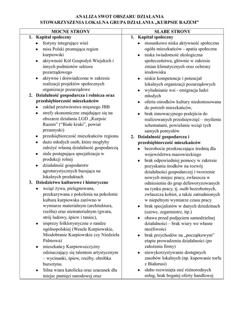 ANALIZA SWOT OBSZARU DZIAŁANIA STOWARZYSZENIA LOKALNA GRUPA DZIAŁANIA „KURPSIE RAZEM” MOCNE STRONY 1. Kapitał społeczny festyny integrujące wieś miss Polski promująca region kurpiowski aktywność Kół Gospodyń Wiejskich i innych podmiotów sektora pozarządowego aktywne i doświadczone w zakresie realizacji projektów społecznych organizacje pozarządowe 2. Działalność gospodarcza i rolnicza oraz przedsiębiorczość mieszkańców zakład przetwórstwa mięsnego JBB strefy ekonomiczne znajdujące się na obszarze działania LGD „Kurpsie Razem” (“Białe kruki”, powiat przasnyski) przedsiębiorczość mieszkańców regionu dużo młodych osób, które mogłyby założyć własną działalność gospodarczą stale postępująca specjalizacja w produkcji rolnej działalność gospodarstw agroturystycznych bazująca na lokalnych produktach 3. Dziedzictwo kulturowe i historyczne wciąż żywa, pielęgnowana, przekazywana z pokolenia na pokolenie kultura kurpiowska zarówno w wymiarze materialnym (architektura, rzeźba) oraz niematerialnym (gwara, strój ludowy, śpiew i taniec), imprezy folklorystyczne o randze ogólnopolskiej (Wesele Kurpiowskie, Miodobranie Kurpiowskie czy Niedziela Palmowa) mieszkańcy Kurpiowszczyzny odznaczający się talentem artystycznym – wycinanki, śpiew, rzeźby, obróbka bursztynu. Silna wiara katolicka oraz szacunek dla miejsc pamięci narodowej oraz SŁABE STRONY 1. Kapitał społeczny stosunkowo niska aktywność społeczna ogółu mieszkańców - apatia społeczna niska świadomość ekologiczna społeczeństwa, głównie w zakresie zmian klimatycznych oraz ochrony środowiska niskie kompetencje i potencjał lokalnych organizacji pozarządowych wyludnianie wsi - emigracja ludzi młodych oferta ośrodków kultury niedostosowana do potrzeb mieszkańców, brak innowacyjnego podejścia do realizowanych przedsięwzięć – myślenie schematami, powielanie wciąż tych samych pomysłów 2. Działalność gospodarcza i przedsiębiorczość mieszkańców bezrobocie przekraczające średnią dla województwa mazowieckiego brak odpowiedniej pomocy w zakresie pozyskania środków na rozwój działalności gospodarczej i tworzenie nowych miejsc pracy, zwłaszcza w odniesieniu do grup defaworyzowanych na rynku pracy, tj. osób bezrobotnych, zwłaszcza kobiet, a także zatrudnionych w niepełnym wymiarze czasu pracy brak specjalistów w danych dziedzinach (szewc, zegarmistrz, itp.) obawa przed podjęciem samodzielnej działalności – brak wiary we własne możliwości brak przychodów na „początkowym” etapie prowadzenia działalności (po założeniu firmy) niewykorzystywanie dostępnych zasobów lokalnych (np. kupowanie torfu z Białorusi) słabo rozwinięta sieć różnorodnych usług, brak bogatej oferty handlowej miejscowych zwyczajów i obyczajów Aktywne środowisko artystów i zespołów lokalnych 4. Środowisko naturalne czyste środowisko naturalne - rzeki Narew, Omulew, Płodownica i inne mniejsze cieki wodne oraz duża powierzchnia lasów, rezerwaty, pomniki przyrody, siedliska rzadkich ptaków warunki środowiskowe sprzyjające produkcji zdrowej żywności ekologicznej wyszczególnione obszary NATURA 2000 zgodnie z unijną dyrektywą ptasią i dyrektywą siedliskową 5. Infrastruktura dobra infrastruktura drogowa, dobra infrastruktura sportowa, kompleksy sportowe przy szkołach dobra komunikacja zewnętrzna – droga krajowa przebiegająca przez środek obszaru działania LGD „Kurpsie Razem” 6. Turystyka i promocja obszaru Sprawdzone i już wypromowane produkty turystyczne, tj. imprezy regionalne (Wesele Kurpiowskie, Niedziela Palmowa czy Miodobranie Kurpiowskie), samorządy dbają o estetykę miejscowości gminnych szlak kajakowy Omulwią zagospodarowanie centrów wsi budowa oraz wytyczanie ścieżek rowerowych interaktywna mapa turystyczna obszaru objętego LSR Rozwijające się zaplecze turystyczne Kurpi na terenie gminy Myszyniec 3. Dziedzictwo kulturowe i historyczne mała promocja twórców ludowych na zewnątrz, poza obrębem danej gminy czy obszaru niedostateczna i słabo zintegrowana informacja na temat obiektów historycznych, kulturalnych i muzealnych zły stan obiektów zabytkowych, w tym małej architektury (pomniki, kapliczki, krzyże przydrożne) 4. Środowisko naturalne nieprzyjazny dla środowiska i mieszkańców sposób ogrzewania budynków mieszkalnych (CO2) słaba melioracja niewielka liczba zbiorników wodnych 5. Infrastruktura skupianie uwagi na miejscowości gminnej i wsiach położonych wokół brak wystarczającej ilości placów zabaw dla dzieci brak miejsc spotkań dla mieszkańców, w tym gównie dla grup defaworyzowanych, tj. osób starszych i młodych matek słabo rozwinięta baza do rozwoju potrzeb społeczno-kulturalnych oraz rekreacyjnych 6. Turystyka i promocja obszaru brak punktu informacji turystycznej w każdej gminie objętej LSR słaba znajomość potraw regionalnych, tj. fafernuchy, piwo kozicowe, rejbak brak przewodników turystycznych poszczególnych gmin mała liczba dobrze prosperujących gospodarstw agroturystycznych słaba infrastruktura turystyczna brak wykwalifikowanej kadry obsługującej ruch turystyczny brak spójności i zintegrowania działań promocyjnych przez różne podmioty działające na terenie LGD „Kurpsie Razem” 1. 2. 3. 4. SZANSE Kapitał społeczny poprawa aktywności społecznej mieszkańców w wyniku aktywnego wykorzystywania lokalnych portali informacji oraz mediów społecznościowych wykreowanie lokalnych liderów rozwój stowarzyszeń, kół gospodyń wiejskich i innych organizacji pozarządowych rozwój społeczeństwa informacyjnego i możliwości kształcenia na odległość Działalność gospodarcza i przedsiębiorczość mieszkańców dostęp do środków unijnych na podjęcie i/lub rozwój działalności gospodarczej dostęp do specjalistycznych szkoleń zawodowych aktywizacja działań proinwestycyjnych odformalizowanie procedur umożliwiają