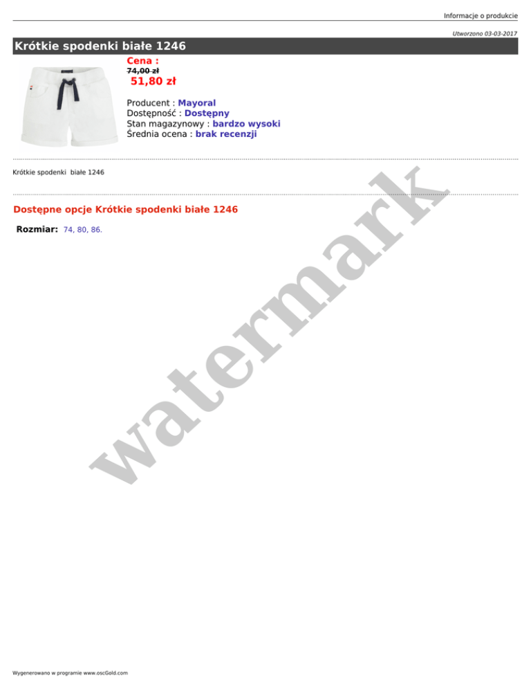 Informacje o produkcie Utworzono 03-03-2017 Krótkie spodenki białe 1246 Cena : 74,00 zł 51,80 zł Producent : Mayoral Dostępność : Dostępny Stan magazynowy : bardzo wysoki Średnia ocena : brak recenzji er m ar k Krótkie spodenki białe 1246 Dostępne opcje Krótkie spodenki białe 1246 w at Rozmiar: 74, 80, 86. Wygenerowano w programie www.oscGold.com