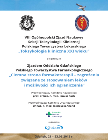 VIII Ogólnopolski Zjazd Naukowy Sekcji Toksykologii Klinicznej Polskiego Towarzystwa Lekarskiego „Toksykologia kliniczna XXI wieku” połączony ze Zjazdem Oddziału Gdańskiego Polskiego Towarzystwa Farmakologicznego „Ciemna strona farmakoterapii – zagrożenia związane ze stosowaniem leków i możliwości ich ograniczenia” Przewodniczący Komitetu Naukowego prof. dr hab. n. med. Janusz Pach Przewodniczący Komitetu Organizacyjnego dr hab. n. med. Jacek Sein Anand ORGANIZATOR Gdańsk, 21 – 23.05.2015 r. VIII Ogólnopolski Zjazd Naukowy Sekcji Toksykologii Klinicznej Polskiego Towarzystwa Lekarskiego „Toksykologia kliniczna XXI wieku” Sekcja Toksykologii Klinicznej Polskiego Towarzystwa Lekarskiego Pracownia Monitorowania Działań Niepożądanych Leków Katedry i Zakładu Farmakologii Gdańskiego Uniwersytetu Medycznego Pomorskie Centrum Toksykologii Centrum Monitorowania Działań Niepożądanych Leków i Środków Chemicznych Pomorskiego Centrum Toksykologii Ośrodek Informacji Toksykologicznej Pomorskiego Centrum Toksykologii Zakład Toksykologii Klinicznej Gdańskiego Uniwersytetu Medycznego Polskie Towarzystwo Badań nad Uzależnieniami Sekcja Geriatrii Polskiego Towarzystwa Lekarskiego Oddział Gdański Polskiego Towarzystwa Gerontologicznego Gdańsk, 21 – 23.05.2015 r. Zjazd Oddziału Gdańskiego Polskiego Towarzystwa Farmakologicznego „Ciemna strona farmakoterapii – zagrożenia związane ze stosowaniem leków i możliwości ich ograniczenia” LIST POWITALNY Szanowni Państwo, W imieniu Komitetu Organizacyjnego mam zaszczyt powitać Państwa na VIII Ogólnopolskim Zjeździe Naukowym Sekcji Toksykologii Klinicznej Polskiego Towarzystwa Lekarskiego, połączonym ze Zjazdem Oddziału Gdańskiego Polskiego Towarzystwa Farmakologicznego. Tematyka obrad będzie dotyczyła aktualnych problemów diagnostyki i terapii w toksykologii klinicznej, kwestii szeroko rozumianych uzależnień, działań niepożądanych leków i środków chemicznych, a także prawnych aspektów pracy toksykologa klinicznego. Mamy głęboką nadzieję, że obecność czołowych specjalistów z naszej dziedziny, a także prawników, psychologów, farmaceutów, farmakologów klinicznych, lekarzy medycyny sądowej, ratunkowej, anestezjologii i intensywnej terapii, neurologii, chorób wewnętrznych, pediatrii, psychiatrii i innych pozwoli na inspirującą wymianę doświadczeń. Wzorem spotkań, które miały już miejsce w Gdańsku, proponujemy Państwu udział w ciekawych sesjach szkoleniowych. Tym razem przygotowaliśmy dla Uczestników warsztaty na temat zastosowania CRRT i ELS w toksykologii klinicznej, możliwości wykorzystania USG w diagnostyce i terapii ostrych zatruć, a także zajęcia dotyczące relacji interpersonalnych między lekarzem i pacjentem. Każdy z kursów zakończy się uzyskaniem przez Państwa odpowiedniego certyfikatu. Przy tej okazji chciałbym Państwa poinformować, że podczas kolejnych zjazdów chcielibyśmy przybliżyć toksykologom klinicznym zagadnienia dotyczące tzw. trudnej intubacji, podstaw bronchoskopii oraz wentylacji mechanicznej. Z wyrazami głębokiego szacunku i poważania Jacek Sein Anand www.gradatim-sympozja.pl VIII Ogólnopolski Zjazd Naukowy Sekcji Toksykologii Klinicznej Polskiego Towarzystwa Lekarskiego „Toksykologia kliniczna XXI wieku” KOMITET NAUKOWY KOMITET ORGANIZACYJNY Przewodniczący: prof. dr hab. n. med. Pach Janusz Przewodniczący: dr hab. n. med. Sein Anand Jacek prof. dr hab. n. med. Kocić Ivan prof. dr hab. n. med. Pach Dorota dr hab. n. med. Kołaciński Zbigniew dr hab. n. med. Krakowiak Anna dr hab. n. med. Magdalan Jan dr hab. n. med. Sein Anand Jacek dr n. med. Groszek Barbara dr n. med. Habrat Bogusław dr n. med. Hydzik Piotr dr n. med. Łukasik – Głębocka Magdalena dr n. med. Schetz Daria dr n. med. Waldman Wojciech dr inż. Wiergowski Marek dr n. med. Schetz Daria dr n. med. Waldman Wojciech dr n. med. Wiśniewski Marek dr Bitel Marcin dr Kabata Piotr dr Nowak – Banasik Livia dr Wiśniewska Katarzyna dr Zając Maciej mgr Barwina Małgorzata mgr Cejrowski Daniel mgr Kaszuba Elżbieta mgr Kleina Dominika Durnakowska Marta Mikita Ewa Szarowicz Dorota Gdańsk, 21 – 23.05.2015 r. Zjazd Oddziału Gdańskiego Polskiego Towarzystwa Farmakologicznego „Ciemna strona farmakoterapii – zagrożenia związane ze stosowaniem leków i możliwości ich ograniczenia” CZWARTEK 21-05-2015 r. DZIEŃ I Przyjazd i zakwaterowanie uczestników Pokoje dla Państwa będą gotowe od godziny 10:00 13:30 - 14:30 Obiad 14:30 - 16:00 Sesja Inauguracyjna Przewodniczący: Janusz Pach, Ivan Kocić, Jacek Sein Anand 1. Krakowska toksykologia kliniczna na przełomie XX i XXI w. Janusz Pach (Collegium Medicum Uniwersytetu Jagiellońskiego) 2. Nowe związki psychostymulujące i psychodysleptyczne Jolanta B. Zawilska (Uniwersytet Medyczny w Łodzi) 3. Ostre zatrucia zakończone zgonem Anna Krakowiak (Instytut Medycyny Pracy w Łodzi) 4. Toksykologia i Psychiatria. Dwie strony tego samego medalu Bogusław Habrat (Instytut Psychiatrii i Neurologii w Warszawie) 16:00 - 16:15 Przerwa kawowa 16:15 - 17:15 Dopalacze Przewodniczący: Jolanta B. Zawilska, Bogusław Habrat, Wojciech Waldman 1. „Spice” syntetyczna marihuana Jolanta B. Zawilska (Uniwersytet Medyczny w Łodzi) 2. Psychiatryczne aspekty używania nowych substancji psychoaktywnych Bogusław Habrat (Instytut Psychiatrii i Neurologii w Warszawie) 3. Dyskusja 17:15 - 17:30 Przerwa kawowa 17:30 – 19:30 Zebranie Sekcji Toksykologii Klinicznej Polskiego Towarzystwa Lekarskiego Przewodniczący: Jacek Sein Anand, Wojciech Waldman, Piotr Burda 1. Wybory władz Sekcji Toksykologii Klinicznej Polskiego Towarzystwa Lekarskiego 2. Taryfikacja świadczeń zdrowotnych w dziedzinie toksykologia kliniczna Aleksandra Świderska (Agencja Oceny Technologii Medycznych i Taryfikacji w Warszawie) 3. Zebranie Konsultanta Krajowego, Konsultantów Wojewódzkich oraz Prezesa Sekcji Toksykologii PTL 20:00 Uroczy