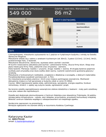 MIESZKANIE na SPRZEDAŻ 549 000 Gdańsk, Ujeścisko, Warszawska 86 m2 24977/3979/OMS Secondary ApartmentBlock 2008 1 4 4 1 Asphalt Opis Czteropokojowe, mieszkanie usytuowanie na 1 piętrze w 4 piętrowym budynku z windą na Osiedlu Słoneczne Wzgórza. Mieszkanie składa się z salonu z aneksem kuchennym (ok 30m2), 3 pokoi (13.5m2, 13.3m2, 9m2), przestronnego holu, 2 łazienek. Mieszkanie dwustronne, słoneczne, wystawa okien zachód i wschód. W kuchni nowoczesna zabudowa pod wymiar. Lakierowane fronty, okucia firmy blum. Okap oraz płyta indukcyjna firmy Teka, piekarnik oraz zmywarka - siemens. Dwie łazienki. Pierwsza: toaleta + prysznic, druga: toaleta + wanna. W drugiej łazience pojemne szuflady pod umywalką oraz duża szafka obok wanny. Łazienki wykończone gustowną glazurą i terakotą. Mieszkanie o funkcjonalnym rozkładzie, urządzone z dbałością o szczegóły, z dobrych materiałów. Ponadstandardowa wysokość pomieszczeń- 2,75m. Do mieszkania przynależy piwnica ( 4m2) oraz miejsce parkingowe zewnętrzne. Możliwość dokupienia miejsca w hali garażowej w budynku obok w cenie 25 000zł. Czynsz: 380zł (ogrzewanie oplata stała, administracja, sprzątanie, energia wspólna, fundusz remontowy, śmieci) + opłaty wg zużycia (woda, ogrzewanie i prąd). Na terenie osiedla zaprojektowano wewnętrzne zielone dziedzińce z ławkami - mały park osiedlowy oraz plac zabaw dla najmłodszych. Osiedle jest doskonale skomunikowane z Centrum Gdańska oraz obwodnicą Trójmiasta. W pobliżu istnieje pełna infrastruktura – szkoła, sieci sklepów, przychodnia, przystanki komunikacji miejskiej. Bliskość centrum Gdańska współgra z odseparowaniem od miejskiego zgiełku. Serdecznie zapraszam na prezentację. Niniejsze ogłoszenie nie stanowi oferty w rozumieniu Kodeksu Cywilnego. Katarzyna Kazior tel. 605175110 email: [email protected] Muskat & Wicher sp. z o.o. s p.k. Muskat & Wicher sp. z o.o. s p.k. Powered by TCPDF (www.tcpdf.org)