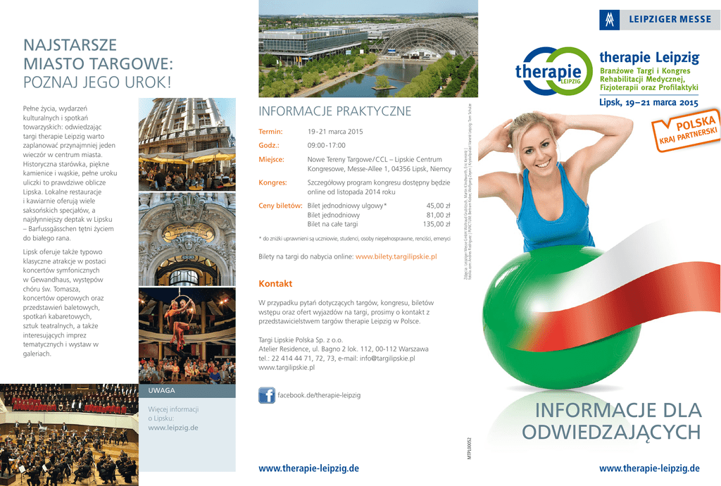 INFORMACJE PRAKTYCZNE Pełne życia, wydarzeń kulturalnych i spotkań towarzyskich: odwiedzając targi therapie Leipzig warto zaplanować przynajmniej jeden wieczór w centrum miasta. Historyczna starówka, piękne kamienice i wąskie, pełne uroku uliczki to prawdziwe oblicze Lipska. Lokalne restauracje i kawiarnie oferują wiele saksońskich specjałów, a najsłynniejszy deptak w Lipsku – Barfussgässchen tętni życiem do białego rana. Termin: 19 - 21 marca 2015 Godz.: 09:00 - 17:00 Miejsce: Nowe Tereny Targowe / CCL – Lipskie Centrum Kongresowe, Messe-Allee 1, 04356 Lipsk, Niemcy Kongres: Szczegółowy program kongresu dostępny będzie online od listopada 2014 roku Ceny biletów: Bilet jednodniowy ulgowy* Bilet jednodniowy Bilet na całe targi 45,00 zł 81,00 zł 135,00 zł * do zniżki uprawnieni są uczniowie, studenci, osoby niepełnosprawne, renciści, emeryci Lipsk oferuje także typowo klasyczne atrakcje w postaci koncertów symfonicznych w Gewandhaus, występów chóru św. Tomasza, koncertów operowych oraz przedstawień baletowych, spotkań kabaretowych, sztuk teatralnych, a także interesujących imprez tematycznych i wystaw w galeriach. Bilety na targi do nabycia online: www.bilety.targilipskie.pl Kontakt Zdjęcia: Leipziger Messe GmbH: Waltraud Grubitzsch, Martin Klindtworth, Eric Kemintz | fotolia.com: Andres Rodriguez | PUNCTUM: Bertram Kober, Wolfgang Zeyen | Krystallpalast Varieté Leipzig: Tom Schulze NAJSTARSZE MIASTO TARGOWE: POZNAJ JEGO UROK! Lipsk, 19 – 21 marca 2015 A POLSERKSKI ARTN KRAJ P W przypadku pytań dotyczących targów, kongresu, biletów wstępu oraz ofert wyjazdów na targi, prosimy o kontakt z przedstawicielstwem targów therapie Leipzig w Polsce. Targi Lipskie Polska Sp. z o.o. Atelier Residence, ul. Bagno 2 lok. 112, 00-112 Warszawa tel.: 22 414 44 71, 72, 73, e-mail: [email protected] www.targilipskie.pl UWAGA facebook.de/therapie-leipzig MTPL00052 Więcej informacji o Lipsku: www.leipzig.de www.therapie-leipzig.de INFORMACJE DLA ODWIEDZAJĄCYCH www.therapie-leipzig.de therapie Leipzig: Wiodące spotkanie branży rehabilitacji medycznej, fizjoterapii i profilaktyki Interdyscyplinarny charakter Międzynarodowa oferta Ponad 300 wystawców i 120 spotkań naukowych, premiery i nowości rynkowe – tak wygląda oferta jedynych w Niemczech i wiodących w Europie Środkowej targów dla branży rehabilitacji medycznej, fizjoterapii oraz profilaktyki prozdrowotnej. therapie Leipzig to jedyne w swoim rodzaju połączenie targów i interdyscyplinarnego programu naukowego, które skierowane są bezpośrednio do fizjoterapeutów, rehabilitantów i masażystów. Targi therapie Leipzig to największe i najważniejsze wydarzenie dla branży rehabilitacji medycznej, fizjoterapii oraz profilaktyki prozdrowotnej w Niemczech. Dla przedsiębiorców z Europy Środkowej stanowią sprawdzoną platformę promocji, prezentacji najnowszej oferty oraz nawiązywania kontaktów handlowych. Targi therapie Leipzig odbywają się w cyklu dwuletnim i w 2015 roku zorganizowane zostaną po raz siódmy. Ostatnia edycja, która odbyła się w 2013 roku, zakończyła się wielkim sukcesem. Targi odwiedzili przedstawiciele klinik i placówek rehabilitacyjnych, klinik bólu, gabinetów fizjoterapii oraz ośrodków medycznej terapii sportowej, fitnessu medycznego, spa i wellness. Dużym zainteresowaniem cieszyły się wystawy specjalne prezentujące alternatywne metody leczenia, m.in. wellness medyczny oraz Tradycyjną Medycynę Chińską. • sprzęt terapeutyczny dla fizjoterapii • sprzęt terapeutyczny dla fizykoterapii • sprzęt terapeutyczny dla ergoterapii/logopedii • sprzęt rehabilitacyjny, • urządzenia fitness i treningowe • wyposażenie placówek rehabilitacyjnych • rehabilitacyjne środki pomocnicze ZAKRES TEMATYCZNY TARGÓW • artykuły pierwszej potrzeby i użytkowe • produkty zdrowotne • alternatywne metody leczenia • koncepcje i produkty wellness • wyposażenie i sprzęt • organizacja i zarządzanie • edukacja, szkolenia i doskonalenie zawodowe • wydawnictwa, literatura fachowa • doradztwo i usługi ODWIEDZAJĄCY DYNAMICZNY WZROST LICZBY WYSTAWCÓW I ODWIEDZAJĄCYCH 2.500 2005 2007 2009 2011 2013 2003 2005 10.200 5.000 6.600 7.500 50 2003 10.000 5.600 146 116 100 188 200 150 2007 2009 2011 12.200 12.500 278 250 242 15.000 226 300 11.300 ODWIEDZAJĄCY 9.100 WYSTAWCY 2013 • fizjoterapeuci • masażyści i medyczni terapeuci sportowi • ergoterapeuci • logopedzi • fizjoterapeuci sportowi • lekarze medycyny sportowej • trenerzy rehabilitacji sportowej i treningu zdrowotnego • lekarze specjaliści z dziedziny neurologii, medycyny sportowej, medycyny fizykalnej oraz rehabilitacji, medycyny manualnej i ortopedii • kierownictwo klinik bólu i klinik rehabilitacyjnych oraz uzdrowisk i ośrodków spa • przedstawiciele sklepów medycznych Polska jako gość honorowy Polska – Kraj Partnerski Na zaproszenie Targów Lipskich w 2015 roku Polska wystąpi jako Kraj Partnerski. W 2013 roku w tej roli występowała Finlandia. Na obecność Polski w charakterze Kraju Partnerskiego składać się będzie organizacja Polskiego Wystąpienia Narodowego, warsztatów tematycznych oraz konferencji naukowej. Partnerem wydarzenia w Polsce jest firma Interservis Sp. z o.o., organizator targów Rehabilitacja w Łodzi. Tytuł gościa honorowego to dla Polski wielka szansa na zaprezentowanie zarówno podczas targów, jak i podczas kongresu naukowego potencjału polskich przedsiębiorców i instytucji oraz dorobku polskich naukowców, lekarzy rehabilitantów, lekarzy medycyny sportowej oraz fizjoterapeutów. Szczegółowe informacje na temat planowanych wydarzeń dostępne są na stronie www.targilipskie.pl. KONGRES NAUKOWY Targom therapie Leipzig towarzyszy największy w Niemczech interdyscyplinarny kongres rehabilitacji medycznej, fizjoterapii i profilaktyki prozdrowotnej. Tematami wiodącymi będą neurologia, ortopedia, limfologia oraz metody