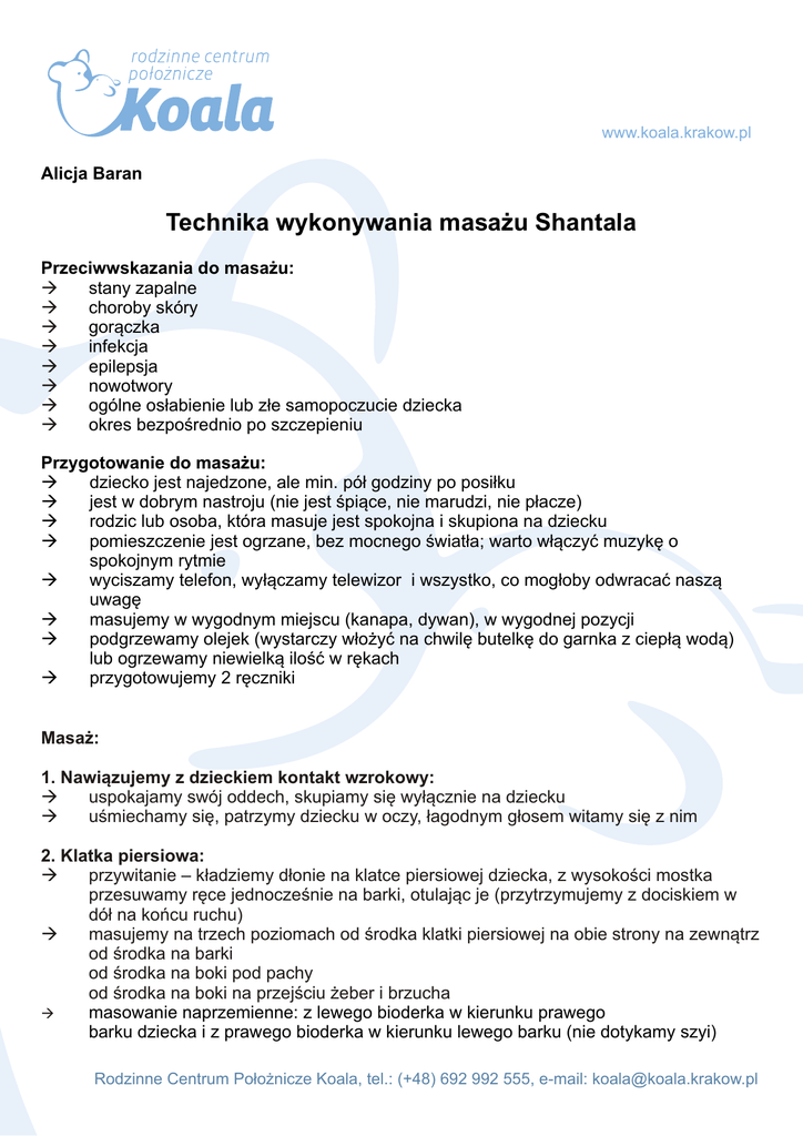 www.koala.krakow.pl Alicja Baran Technika wykonywania masażu Shantala Przeciwwskazania do masażu: stany zapalne choroby skóry gorączka infekcja epilepsja nowotwory ogólne osłabienie lub złe samopoczucie dziecka okres bezpośrednio po szczepieniu Przygotowanie do masażu: dziecko jest najedzone, ale min. pół godziny po posiłku jest w dobrym nastroju (nie jest śpiące, nie marudzi, nie płacze) rodzic lub osoba, która masuje jest spokojna i skupiona na dziecku pomieszczenie jest ogrzane, bez mocnego światła; warto włączyć muzykę o spokojnym rytmie wyciszamy telefon, wyłączamy telewizor i wszystko, co mogłoby odwracać naszą uwagę masujemy w wygodnym miejscu (kanapa, dywan), w wygodnej pozycji podgrzewamy olejek (wystarczy włożyć na chwilę butelkę do garnka z ciepłą wodą) lub ogrzewamy niewielką ilość w rękach przygotowujemy 2 ręczniki Masaż: 1. Nawiązujemy z dzieckiem kontakt wzrokowy: uspokajamy swój oddech, skupiamy się wyłącznie na dziecku uśmiechamy się, patrzymy dziecku w oczy, łagodnym głosem witamy się z nim 2. Klatka piersiowa: przywitanie – kładziemy dłonie na klatce piersiowej dziecka, z wysokości mostka przesuwamy ręce jednocześnie na barki, otulając je (przytrzymujemy z dociskiem w dół na końcu ruchu) masujemy na trzech poziomach od środka klatki piersiowej na obie strony na zewnątrz od środka na barki od środka na boki pod pachy od środka na boki na przejściu żeber i brzucha masowanie naprzemienne: z lewego bioderka w kierunku prawego barku dziecka i z prawego bioderka w kierunku lewego barku (nie dotykamy szyi) Rodzinne Centrum Położnicze Koala, tel.: (+48) 692 992 555, e-mail: [email protected] www.koala.krakow.pl 3. Rączki (najpierw jedna – cała sekwencja ruchów, później druga): przywitanie – zamknij rączki w swoich rękach ruch ściągający (jedną ręką) – „bransoletka” ruch śrubowy (obiema rękami jednocześnie) – „pokrzywka” przygłaskanie rączki z zewnątrz (powinna się otworzyć) masowanie kciukami wnętrza dłoni masowanie każdego paluszka – „ściąganie pierścionków” delikatne uciskanie każdego opuszka paluszka od małego palca do kciuka na koniec zamykamy rączkę w naszej dłoni i przytrzymujemy przez chwilę 4. Brzuszek: przywitanie – kładziemy prawą dłoń na brzuchu dziecka, lewą pod pupą – chwilę tak trzymamy prawą dłonią masujemy brzuszek, z uciskiem, z góry na dół prawe przedramię kładziemy na brzuszku, poniżej żeber i wykonujemy ruch jak powyżej prawym przedramieniem kreślimy literę „Z” – ruch naszej ręki w prawo, następnie w lewo w dół i ponownie w prawo ponownie kładziemy dłoń na brzuchu i masujemy ruchem okrężnym brzuszek dookoła pępka w kierunku zgodnym z ruchem wskazówek zegara (silniejszy nacisk po prawej stronie) 5. Nóżki (podobnie jak przy rączkach, najpierw cała sekwencja na jednej nóżce, następnie na drugiej): przywitanie – podobnie jak rączki, zamknij stópki dziecka w swoich dłoniach, chwilę przytrzymaj ruchem ściągającym masujemy w kierunku od bioderka do stópki – „bransoletka” ruchem śrubowym w kierunku stópki – „pokrzywka” „prasujemy” całą stópkę od pięty do palców masujemy stópkę kciukami na przemian w stronę paluszków ruch bokiem naszej dłoni w poprzek stópki masujemy paluszki prostując je, chwytając dwoma lub trzema palcami – „ściąganie pierścionków”, a następnie delikatnie uciskamy każdy paluszek na koniec przygłaskanie od piętki do palców i zamknięcie stópki w naszej dłoni 6. Plecy: dziecko leży w poprzek na naszych udach, rączki wyciągnięte do przodu, rozcieramy olejek ruchami obejmującymi – na boki przywitanie – prawą dłoń kładziemy nad pupą, lewą na karku dziecka – przez chwilę tak trzymamy prawa dłoń położona na pupie; lewą obejmujemy plecki pod karkiem; masujemy plecki dziecka w dół do pośladków, nie dotykając szyi – „mała zjeżdżalnia” Rodzinne Centrum Położnicze Koala, tel.: (+48) 692 992 555, e-mail: [email protected] www.koala.krakow.pl masujemy całe plecy dziecka obiema rękami zygzakiem w stronę pośladków (ręce ułożone w poprzek plecków) lewą ręką podtrzymujemy dziecko pod czołem, prawą – układamy dwa nasze palce w kształcie literki V i przesuwamy od pupy do barków ruchem: wzdłuż kręgosłupa spiralnym zygzakiem prawą dłonią chwytamy stópki dziecka (asekurujemy kostki), lewą dłoń kładziemy na barkach dziecka i masujemy całe plecy poprzez pośladki, aż do stópek – „duża zjeżdżalnia” kładziemy prawą dłoń na lędźwiach, lewą na barkach i chwilę przytrzymujemy 7. Twarz: obejmujemy główkę dziecka i przegłaskujemy z góry na dół (na bok, przez policzki, do podbródka), nie dotykamy uszu dziecka łączymy nasze palce wskazujący i środkowy na czole dziecka i przesuwamy na boki do skroni, następnie do dolnej linii uszu i do podbródka palce wskazujące lub małe kładziemy u nasady noska i przesuwamy dookoła oczu dziecka tzw. okularki, ruch powyżej brwi zaznaczony mocniej, pod oczami bardzo delikatnie nosek: przegłaskujemy od nasady na policzki; w dół od nasady do skrzydełek nosa (można na przemian palcami) od nasady nosa przesuwamy palce do bródki – „cebulka” usta dookoła, ruchem zgodnym ze wskazówkami zegara ucisk: punkt nad ustami (pod nosem) i pod ustami (na brodzie), przy skrzydełkach noska, w kącikach ust masujemy delikatnie punkt pod bródką dziecka 8. Gimnastyka: rozluźniamy rączki poruszając nimi lekko krzyżujemy rączki na klatce piersiowej dziecka, zatrzymujemy i następnie rozkładamy na boki przekładamy rączki: prawa rączka do góry obok główki, lewa na dół i na zmianę lewą stópkę dziecka i prawą rączkę – delikatnie przyciągamy, analogicznie prawa stópka i lewa rączka chwytamy za bioderka i zginamy je, nie unosimy pośladków chwytając za bioderka dziecka, uginamy je w kolankach i d