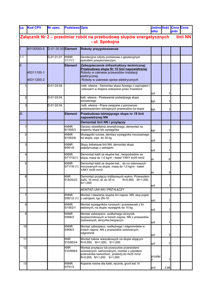 Lp. Kod CPV Nr spec. Podstawa Opis Jedno Ilość Cena Cena stka jedn Załącznik Nr 2 – przedmiar robót na przebudowę słupów energetycznych - ul. Spokojna I 45100000-8 D-01.00.00 Element 1.1 D-01.01.01 KNNR 1/111/1 II Element 45311100-1 45311200-2 Roboty przygotowawcze Geodezyjne roboty pomiarowe z geodezyjnym operatem powykonawczym, Zabezpieczenie infrastruktury technicznej. Przebudowa słupa Nr 15 linii napowietrznej Roboty w zakresie przewodów instalacji elektrycznej. Roboty w zakresie opraw elektrycznych 1 D-01.03.04. kalk. własna - Demontaz słupa Aowego z osprzętem i odwozem w miejsce wskazane przez Inwestora szt 1 2 D-01.03.04. kalk. własna - Postawienie podwójnego słupa wirowanego kpl 1 3 D-01.03.04. kalk. własna - Prace związane z ponownym podwieszeniem istniejacych przewodów na słupie kpl 1 kpl 1 szt 1 szt 1 m 6 m 3 szt 1 szt 1 szt 1 szt 1 szt 3 szt 7 przyłąc z 1 III Element Przebudowa istniejącego słupa nr 18 linii napowietrznej NN Demontaż linii NN i przyłączy 1 KNNR 9/1005/3 Oprawy oświetlenia zewnętrznego, demontaż na trzpieniu słupa lub wysięgnika 2 KNNR 9/1002/6 Wysięgniki rurowe, demtarz wysięgnika mocowanego na słupie, cięż. do 30 kg 3 KNNR 9/901/8 Słupy żelbetowe linii NN, demontaż słupa pojedynczego z ustrojami 4 KNNR 5/717/2(1) Demontaż kabli ze słupów bet., bezpośrednio ze słupa, masa do 1,0 kg/m - kabel YAKY 4x35 mm2 5 KNNR Demontaż kabli ze słupów bet., do rur osłonowych 5/717/6 (1) mocowanych na słupie, masa do 1,0 kg/m - kabel YAKY 4x35 mm2 6 KNR 518/202/3 Demontaż przyłączy trójfazowych wykon. Przewodem 4aAL 16 mm2, dł. do 30 m R=0,955, M=1.000, S=1,000 MONTAŻ LINII NN I PRZYŁĄCZY 7 KNNR Montaż i stawianie słupów lini napow. NN, słup pojed. 5/901/2 (1) z ustrojami, typ ŻN-10 8 KNNR 5/1002/1 Montaż wysięgników rurowych i przewieszek z lin stalowych, na słupie, wysięgnik do 15 kg 9 KNNR 5/906/2 Montaż zabezpiecz. wzdłużnego skrzynek bezpiecznikowych w liniach napow. NN z przewodów izolowanych, skrzynka bezpieczn. 10 KNNR 5/906/3 Montaż zabezpiecz. wzdłużnego i odgromników w liniach napow. NN z przewodów izolowanych, odgromnik 11 KNR 510/802/4 Montaż haków wieszakowych na słupie stojącym R=0,955, M=1,000, S=1,000 12 KNR 510/906/4 Montaż przyłączy lub przerzutów przewodami izolowanymi- samonośnymi, montaż z udziałem podnośnika samochod., przekrój do 4x25 mm2 R=0,955 M=1,000 S=1,000 13 KNNR 5/701/3 Kopanie rowów dla kabli, ręcznie, grunt kat. IV m3 2,88 linii NN 14 KNNR 5/706/1 Nasypanie warstwy piasku na dnie rowu kablowego, szer. do 0,4 m 15 KNNR Układanie kabli w rowach kablowych- ręcznie, kabel 5/707/2 (1) 1,0 kg/m, pokrycie folią-kabel YAKY 4x35 mm2 16 KNNR Układanie kabli na słupach bet., bezpośrednio na 5/717/2 (1) słupie, masa do 1,0 kg/m- kab. YAKY 4x35 mm2 17 KNNR Układanie kabli na słupach bet., do rur osłonowych 5/717/6 (1) mocowanych na słupie, masa do 1,0 kg/m- kab. YAKY 4x35 mm2 18 KNNR 9/806/1 Mufy z tworzyw termokurczliwych przelotowe na kablach energetycznych wielożyłowych o izolacji i powłoce z tworzyw sztucznych w rowach kablowych, kabel o przekroju żył do 50 mm2 19 KNNR 5/702/5 Zasypanie rowów dla kabli, mechanicznie, grunt kat. III-IV 20 KNNR 5/726/10 m 9 m 9 m 6 m 6 szt 1 m3 Obróbka na sucho kabli na napięcie do 1 kV o izolacji ipowłoce z tworzyw sztucznych, kabel 5-żyłowy, do 50 mm2 szt MONTAŻ UZIEMIEŃ OCHRONNYCH 2,16 1 21 KNNR 5/907/3 Montaż uziomów lub przewodów uziemiających, kat. gruntu IV m 20 22 KNNR 5/907/5 Mechaniczne pogrążanie uziomów poionowych prętowych, kat. gruntu III m 18 WYKONANIE POMIARÓW I BADAŃ 23 KNR 403/ 1205/1 Badanie i pomiar instalacji uziemiającej ochronnej lub roboczej, pomiar pierwszy 24 KNR 403/ 1205/2 Badanie i pomiar instalacji uziemiającej ochronnej lub roboczej, pomiar następny 25 KNR 403/ 1203/1 Badanie linii kablowej NN o ilości żył do 4 26 KNR 403/ 1201/1 Sprawdzenie stanu izolacji induktorem Wartość brutto Wartość netto VAT pomiar 1 pomiar 2 odcine k 1 szt 2