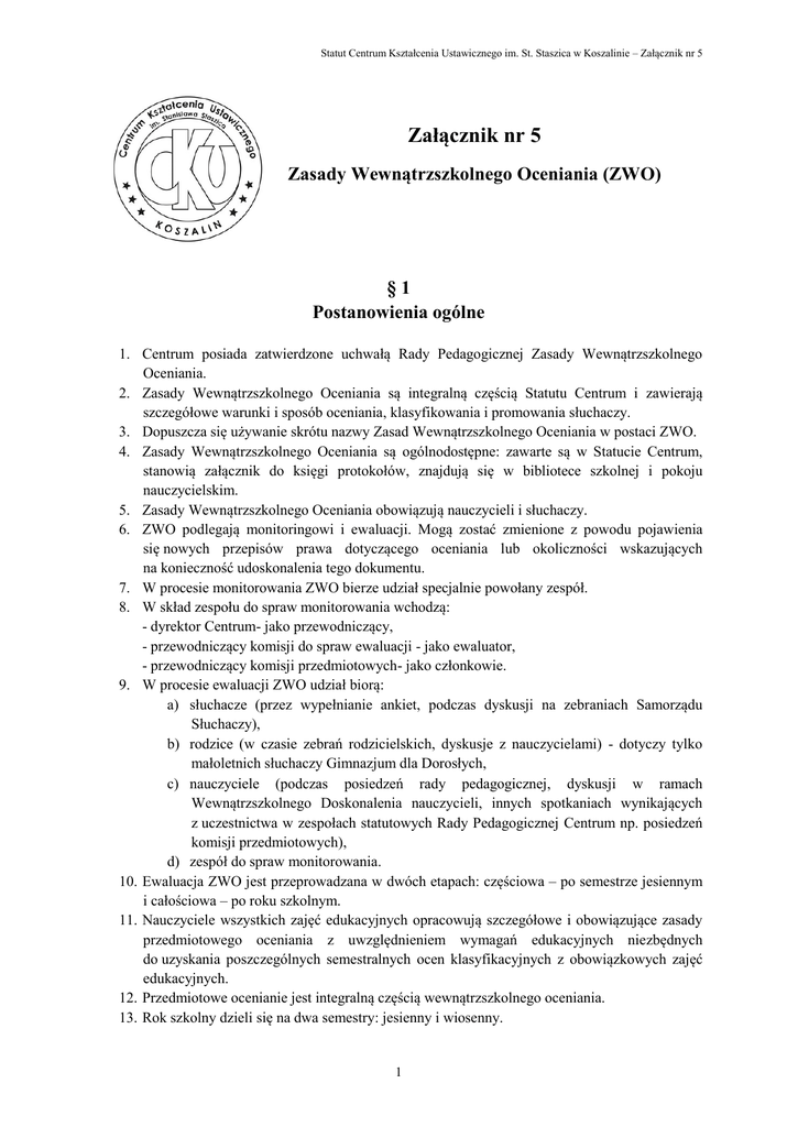 Statut Centrum Kształcenia Ustawicznego im. St. Staszica w Koszalinie – Załącznik nr 5 Załącznik nr 5 Zasady Wewnątrzszkolnego Oceniania (ZWO) §1 Postanowienia ogólne 1. Centrum posiada zatwierdzone uchwałą Rady Pedagogicznej Zasady Wewnątrzszkolnego Oceniania. 2. Zasady Wewnątrzszkolnego Oceniania są integralną częścią Statutu Centrum i zawierają szczegółowe warunki i sposób oceniania, klasyfikowania i promowania słuchaczy. 3. Dopuszcza się używanie skrótu nazwy Zasad Wewnątrzszkolnego Oceniania w postaci ZWO. 4. Zasady Wewnątrzszkolnego Oceniania są ogólnodostępne: zawarte są w Statucie Centrum, stanowią załącznik do księgi protokołów, znajdują się w bibliotece szkolnej i pokoju nauczycielskim. 5. Zasady Wewnątrzszkolnego Oceniania obowiązują nauczycieli i słuchaczy. 6. ZWO podlegają monitoringowi i ewaluacji. Mogą zostać zmienione z powodu pojawienia się nowych przepisów prawa dotyczącego oceniania lub okoliczności wskazujących na konieczność udoskonalenia tego dokumentu. 7. W procesie monitorowania ZWO bierze udział specjalnie powołany zespół. 8. W skład zespołu do spraw monitorowania wchodzą: - dyrektor Centrum- jako przewodniczący, - przewodniczący komisji do spraw ewaluacji - jako ewaluator, - przewodniczący komisji przedmiotowych- jako członkowie. 9. W procesie ewaluacji ZWO udział biorą: a) słuchacze (przez wypełnianie ankiet, podczas dyskusji na zebraniach Samorządu Słuchaczy), b) rodzice (w czasie zebrań rodzicielskich, dyskusje z nauczycielami) - dotyczy tylko małoletnich słuchaczy Gimnazjum dla Dorosłych, c) nauczyciele (podczas posiedzeń rady pedagogicznej, dyskusji w ramach Wewnątrzszkolnego Doskonalenia nauczycieli, innych spotkaniach wynikających z uczestnictwa w zespołach statutowych Rady Pedagogicznej Centrum np. posiedzeń komisji przedmiotowych), d) zespół do spraw monitorowania. 10. Ewaluacja ZWO jest przeprowadzana w dwóch etapach: częściowa – po semestrze jesiennym i całościowa – po roku szkolnym. 11. Nauczyciele wszystkich zajęć edukacyjnych opracowują szczegółowe i obowiązujące zasady przedmiotowego oceniania z uwzględnieniem wymagań edukacyjnych niezbędnych do uzyskania poszczególnych semestralnych ocen klasyfikacyjnych z obowiązkowych zajęć edukacyjnych. 12. Przedmiotowe ocenianie jest integralną częścią wewnątrzszkolnego oceniania. 13. Rok szkolny dzieli się na dwa semestry: jesienny i wiosenny. 1 Statut Centrum Kształcenia Ustawicznego im. St. Staszica w Koszalinie – Załącznik nr 5 14. Datę rozpoczęcia i zakończenia semestrów wyznacza się na podstawie odrębnych przepisów dotyczących organizacji roku szkolnego. 15. Klasyfikowanie i promowanie słuchaczy odbywa się co semestr. 16. Na pierwszym posiedzeniu Rady Pedagogicznej ustala się termin plenarnego posiedzenia rady klasyfikacyjnej w semestrze jesiennym i wiosennym. §2 Ogólne zasady oceniania 1. Każdy słuchacz jest oceniany zgodnie z zasadami zwartymi w ZWO. 2. Oceny są jawne dla słuchacza, rodziców lub opiekunów prawnych (dotyczy nieletnich słuchaczy Gimnazjum dla Dorosłych). 3. Ocenianiu podlegają: wiadomości, umiejętności, przygotowanie i aktywność podczas zajęć, prace kontrolne, egzaminy semestralne przeprowadzane z poszczególnych obowiązkowych zajęć edukacyjnych określonych w szkolnym planie nauczania. 4. Na miesiąc przed Radą Pedagogiczną klasyfikacyjną każdy nauczyciel informuje słuchacza o proponowanej ocenie semestralnej i dokonuje wpisu długopisem w dzienniku lekcyjnym (dotyczy szkół stacjonarnych). 5. Opiekun semestru Gimnazjum dla Dorosłych przekazuje informacje o proponowanych ocenach semestralnych słuchaczy nieletnich rodzicom lub opiekunom prawnym podczas spotkania z rodzicami. W przypadku nieobecności rodziców (opiekunów prawnych) informacje wysyła się listem poleconym i fakt ten odnotowuje się w dzienniku lekcyjnym. 6. Celem oceniania wewnątrzszkolnego jest: a) poinformowanie słuchacza o poziomie jego osiągnięć edukacyjnych, postępach w tym zakresie, b) pomoc słuchaczowi w samodzielnym planowaniu swojego rozwoju, c) motywowanie słuchacza do dalszej pracy, d) wdrażanie do systematyczności, e) rozwijanie poczucia odpowiedzialności słuchacza za osobiste postępy w edukacji, f) wyrabianie umiejętności samooceny, g) dostarczenie nauczycielom informacji o postępach, trudnościach w uczeniu się oraz o specjalnych uzdolnieniach i osiągnięciach słuchacza, h) ujednolicenie zasad i kryteriów oceniania przez poszczególnych nauczycieli, i) doskonalenie metod pracy nauczycieli, planowanie procesu nauczania i jego ewaluacji. 7. Ocenianie osiągnięć edukacyjnych słuchacza Centrum polega na: a) systematycznym rozpoznawaniu przez nauczyciela poziomu i postępów w opanowaniu przez słuchacza wiadomości i umiejętności w stosunku do wymagań edukacyjnych, wynikających z podstawy programowej i realizowanych w szkole programów nauczania, b) formułowaniu i dokumentowaniu oceny, z uwzględnieniem indywidualnych możliwości percepcyjnych tych słuchaczy, c) opiekun semestru zobowiązany jest, na pierwszych zajęciach, do zaznajomienia słuchaczy z Zasadami Wewnątrzszkolnego Oceniania oraz warunkami odbywania praktyk. 2 Statut Centrum Kształcenia Ustawicznego im. St. Staszica w Koszalinie – Załącznik nr 5 8. Nauczyciele poszczególnych przedmiotów zobowiązani są, na pierwszych zajęciach, do zapoznania słuchaczy z Zasadami Przedmiotowego Oceniania. 9. Zapoznanie słuchaczy z ZWO, ZPO oraz warunkami odbywania praktyk należy odnotować w dzienniku lekcyjnym. §3 Skala i ogólne kryteria ocen 1. Oceny bieżące i semestralne wyrażane są w stopniach według skali: a) celujący (cel), (6) b) bardzo dobry (bdb), (5) c) dobry (db), (4) d) dostateczny (dst), (3) e) dopuszczający (dop), (2) f) niedostateczny (ndst.), (1) Dopuszcza się stosowanie plusów (+). 2. Przyjmuje się następującą skalę procentową prac pi