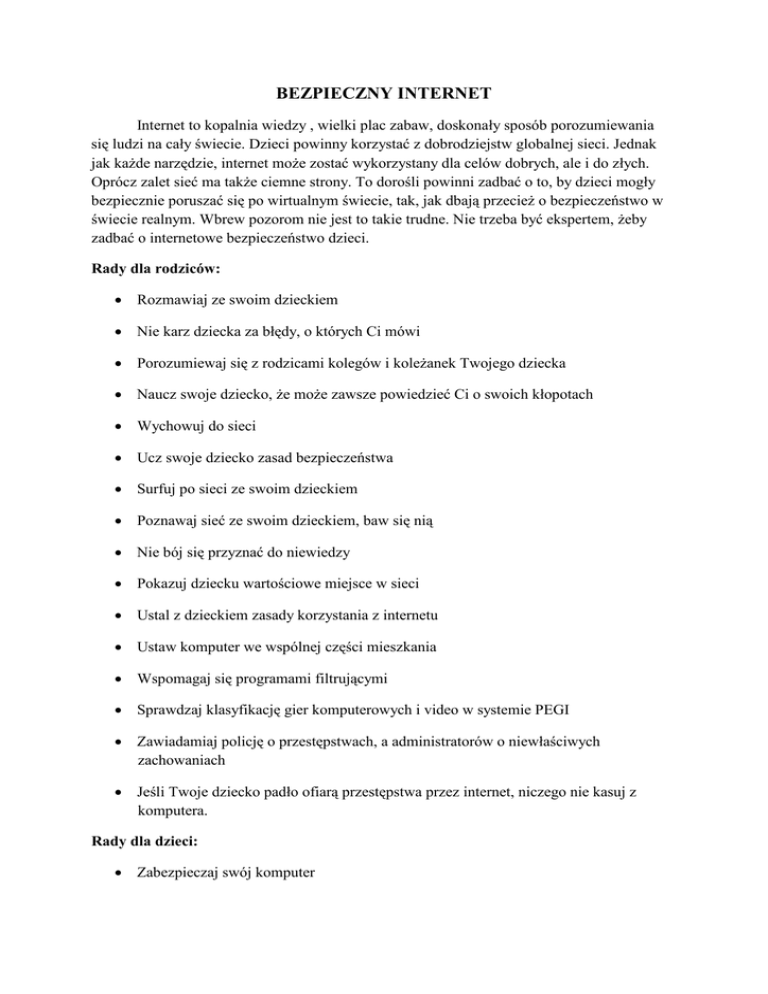 BEZPIECZNY INTERNET Internet to kopalnia wiedzy , wielki plac zabaw, doskonały sposób porozumiewania się ludzi na cały świecie. Dzieci powinny korzystać z dobrodziejstw globalnej sieci. Jednak jak kaŜde narzędzie, internet moŜe zostać wykorzystany dla celów dobrych, ale i do złych. Oprócz zalet sieć ma takŜe ciemne strony. To dorośli powinni zadbać o to, by dzieci mogły bezpiecznie poruszać się po wirtualnym świecie, tak, jak dbają przecieŜ o bezpieczeństwo w świecie realnym. Wbrew pozorom nie jest to takie trudne. Nie trzeba być ekspertem, Ŝeby zadbać o internetowe bezpieczeństwo dzieci. Rady dla rodziców: • Rozmawiaj ze swoim dzieckiem • Nie karz dziecka za błędy, o których Ci mówi • Porozumiewaj się z rodzicami kolegów i koleŜanek Twojego dziecka • Naucz swoje dziecko, Ŝe moŜe zawsze powiedzieć Ci o swoich kłopotach • Wychowuj do sieci • Ucz swoje dziecko zasad bezpieczeństwa • Surfuj po sieci ze swoim dzieckiem • Poznawaj sieć ze swoim dzieckiem, baw się nią • Nie bój się przyznać do niewiedzy • Pokazuj dziecku wartościowe miejsce w sieci • Ustal z dzieckiem zasady korzystania z internetu • Ustaw komputer we wspólnej części mieszkania • Wspomagaj się programami filtrującymi • Sprawdzaj klasyfikację gier komputerowych i video w systemie PEGI • Zawiadamiaj policję o przestępstwach, a administratorów o niewłaściwych zachowaniach • Jeśli Twoje dziecko padło ofiarą przestępstwa przez internet, niczego nie kasuj z komputera. Rady dla dzieci: • Zabezpieczaj swój komputer • Myśl, zanim coś zrobisz • Chroń prywatność swoją i znajomych • Przestrzegaj prawa i etykiety • Szanuj cudzą własność • Chroń swoje hasła • Rozmawiaj z dorosłymi o sieci • Zachowaj ostroŜność przy spotkaniach • Nigdy nie wiesz, kto siedzi po drugiej stronie! Przydatne strony: • www.kidprotect.pl • www.bezpiecznyinternet.org • www.stoppedofilom.pl • www.szkolabezpiecznegointernetu.pl • www.bezpiecznemedia.tp.pl • www.safeinternet.pl • www.dyzurnet.pl • www.sieciaki.pl • www.helpline.org.pl • www.dzieckowsieci.pl • www.f-secure.pl • www.microsoft.com/poland/security/ • www.mocrosoft.com/poland/protect/ psycholog Anna Maria Bindek Bibliografia: Materiały z konferencji „Bezpieczna szkoła”