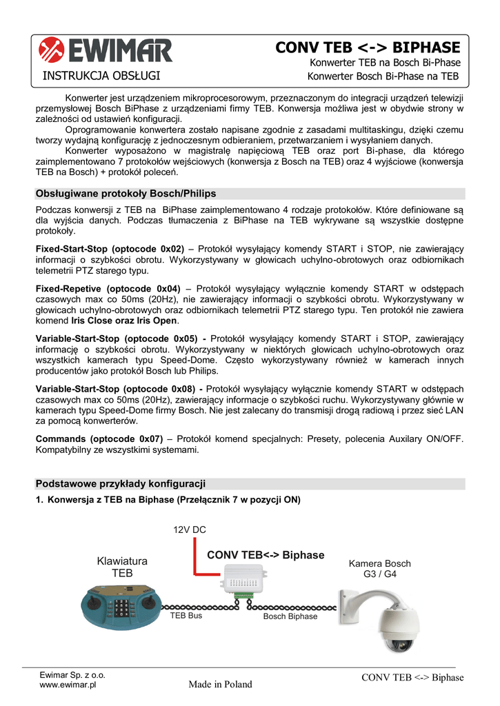 CONV TEB <-> BIPHASE Konwerter TEB na Bosch Bi-Phase Konwerter Bosch Bi-Phase na TEB INSTRUKCJA OBSŁUGI Konwerter jest urządzeniem mikroprocesorowym, przeznaczonym do integracji urządzeń telewizji przemysłowej Bosch BiPhase z urządzeniami firmy TEB. Konwersja możliwa jest w obydwie strony w zależności od ustawień konfiguracji. Oprogramowanie konwertera zostało napisane zgodnie z zasadami multitaskingu, dzięki czemu tworzy wydajną konfigurację z jednoczesnym odbieraniem, przetwarzaniem i wysyłaniem danych. Konwerter wyposażono w magistralę napięciową TEB oraz port Bi-phase, dla którego zaimplementowano 7 protokołów wejściowych (konwersja z Bosch na TEB) oraz 4 wyjściowe (konwersja TEB na Bosch) + protokół poleceń. Obsługiwane protokoły Bosch/Philips Podczas konwersji z TEB na BiPhase zaimplementowano 4 rodzaje protokołów. Które definiowane są dla wyjścia danych. Podczas tłumaczenia z BiPhase na TEB wykrywane są wszystkie dostępne protokoły. Fixed-Start-Stop (optocode 0x02) – Protokół wysyłający komendy START i STOP, nie zawierający informacji o szybkości obrotu. Wykorzystywany w głowicach uchylno-obrotowych oraz odbiornikach telemetrii PTZ starego typu. Fixed-Repetive (optocode 0x04) – Protokół wysyłający wyłącznie komendy START w odstępach czasowych max co 50ms (20Hz), nie zawierający informacji o szybkości obrotu. Wykorzystywany w głowicach uchylno-obrotowych oraz odbiornikach telemetrii PTZ starego typu. Ten protokół nie zawiera komend Iris Close oraz Iris Open. Variable-Start-Stop (optocode 0x05) - Protokół wysyłający komendy START i STOP, zawierający informację o szybkości obrotu. Wykorzystywany w niektórych głowicach uchylno-obrotowych oraz wszystkich kamerach typu Speed-Dome. Często wykorzystywany również w kamerach innych producentów jako protokół Bosch lub Philips. Variable-Start-Stop (optocode 0x08) - Protokół wysyłający wyłącznie komendy START w odstępach czasowych max co 50ms (20Hz), zawierający informacje o szybkości ruchu. Wykorzystywany głównie w kamerach typu Speed-Dome firmy Bosch. Nie jest zalecany do transmisji drogą radiową i przez sieć LAN za pomocą konwerterów. Commands (optocode 0x07) – Protokół komend specjalnych: Presety, polecenia Auxilary ON/OFF. Kompatybilny ze wszystkimi systemami. Podstawowe przykłady konfiguracji 1. Konwersja z TEB na Biphase (Przełącznik 7 w pozycji ON) 12V DC CONV TEB<-> Biphase Klawiatura TEB TEB Bus Ewimar Sp. z o.o. www.ewimar.pl Made in Poland Kamera Bosch G3 / G4 Bosch Biphase CONV TEB <-> Biphase 2. Konwersja z Biphase na TEB (Przełącznik 8 w pozycji OFF) 12V DC CONV TEB<-> Biphase DVR/ Multiplexer Bosch / Philips Kamera TEB Mux/DVR Bosch Biphase TEB Bus Opis zacisków połączeniowych Gniazdo w klawiaturze TEB LED1 LED2 LED1 – Sygnalizacja tłumaczenia i wysyłania danych LED2 – Sygnalizacja odbioru danych Wtyk RJ45 Zasilanie +/- Podłącz zasilacz 12VDC / 500mA. Należy użyć zasilacza stabilizowanego lub impulsowego 12VDC + 120 Ohm 10 TEB Wej. TEB GND Wyj. TEB Przewód C+ GND Zasilanie Zasilanie + 1 Ewimar Sp. z o.o. www.ewimar.pl Bi-Phase – Port Biphase, przeznaczony do podłączenia kamer Bosch lub rejestratorów (krosownic) – zależnie od kierunku konwersji. Dla stabilnej pracy z kamerami Bosch, zalecane jest podłączenia rezystora terminującego Biphase, przez wykonanie połączenia zacisku Term z zaciskiem C+. Wej TEB – Wejście magistrali TEB, służące do podłączenia klawiatury TEB – używane przy tłumaczeniu z TEB na Bi-phase. Podłączenie odbywa się do zacisku Wej TEB oraz GND. Wyj TEB – Wyjście magistrali TEB, służące do podłączenia kamer TEB – używane przy tłumaczeniu z Bi-Phase na TEB. Podłączenie odbywa się do zacisku Wyj TEB oraz GND. Przed podłączeniem magistrali do kamer TEB należy upewnić się, które złącza w kamerach są wykorzystywane do komunikacji. Różne modele kamer mogą zawierać różny rodzaj złącza. Nieprawidłowe podłączenia może spowodować uszkodzenie konwertera lub kamery. Made in Poland CONV TEB <-> Biphase Opis przełączników Przeznaczenie przełączników różni się w zależności od typu wybranej konwersji. Przełącznik DIP nr 7 definiuje kierunek konwersji danych. Przełączniki należy ustawiać przy odłączonym zasilaniu. Konwersja BiPhase -> TEB (Przełącznik 7 – WYŁĄCZONY) Odwrócenie Iris+ - ruch kamery szynowej do przodu Iris+ - ruch kamery szynowej do tyłu IRIS + / IRIS Iris- - ruch kamery szynowej do tyłu Iris- - ruch kamery szynowej do przodu DIP 1 WYŁ ZAŁ Przyciski Iris+ oraz Iris - wykorzystywane są do sterowanie ruchem kamery szynowej. Szybkość regulowania jest za pomocą funkcji SET/RUN SHOT 97-99 – szczegóły w poniższej tabeli Zmiana działania Sterowanie funkcją FOCUS Sterowanie ruchem kamery szynowej przycisków FOCUS (Maksymalna szybkość) DIP 2 WYŁ ZAŁ Przyciski FOCUS normalnie służą do sterowania funkcją FOCUS w kamerze. Po załączeniu przełącznika DIP2, wykorzystywane są do ruchu kamery szynowej zawsze z maksymalną szybkością. Odwrócenie Far - ruch kamery szynowej do przodu Far - ruch kamery szynowej do tyłu FOCUS Near - ruch kamery szynowej do tyłu Near - ruch kamery szynowej do przodu DIP 3 WYŁ ZAŁ Jeżeli przyciski Focus Far oraz Focus Near wykorzystywane są do sterowanie ruchem kamery szynowej (DIP2 załączony), przełącznik DIP 3 dłuży do zmiany kierunku sterowania. Gdy DIP2 jest wyłączony, opcja ta nie ma żadnego znaczenia. Zarezerwowany DIP 4 DIP 5 DIP 6 WYŁ WYŁ WYŁ Kierunek konwersji DIP 7 BIPHASE NA TEB WYŁ Zarezerwowany DIP 8 WYŁ WYŁ Lista komend dla konwersji BiPhase na TEB Nr 1 2 3 4 5 6 7 8 9 10 11 12 Funkcja klawiatury Bosch Ruch w górę / w dół / w lewo / w prawo Zoom in / Zoom out Focus Far / Focus Near Iris open / Iris close (Nie dotyczy protokołu Fixed-Repetive) Call SHOT 00~99 / Set SHOT 00~99 Call SHOT 80 Call SHOT 81 Call SHOT 81 Nagrywanie A (Aux 