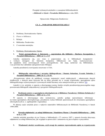 Przegląd wybranych artykułów z czasopism bibliotekarskich: z Biblioteki w Szkole i Poradnika Bibliotekarza z roku 2005. . Opracowała: Małgorzata Zienkiewicz CZ. 2: ,, PORADNIK BIBLIOTEKARZA” 1. Problemy. Doświadczenia. Opinie. 2. Prawo w bibliotece. 3. Relacje. 4. Biblioteka. Środowisko. 5. Z warsztatu metodyka. 1. Problemy. Doświadczenia. Opinie. 1. Treści pornograficzne w Internecie – zagrożeniem dla bibliotek / Barbara Szczepańska // Poradnik Bibliotekarza. – 2005, nr 1, s. 3-5 Autorka zastanawia się, czy wraz z pojawieniem się w bibliotekach komputerów z wolnym dostępem do Internetu komputery biblioteczne nie będą wykorzystywane do oglądania stron zawierających treści pornograficzne. Jak mają zachować się bibliotekarze i czy powinno być zakładane oprogramowanie filtrujące. Autorka przedstawia rozwiązania stosowane w USA. 2. Bibliografia załącznikowa i przypisy bibliograficzne / Danuta Sebastian, Urszula Tobolska // Poradnik Bibliotekarza. – 2005, nr 3, s. 11-19 ,,Przygotowane tekstu do publikacji wymaga znajomości zasad redakcyjnych : odnotowania danych źródłowych, z których autor korzysta lub na które powołał się w swojej wypowiedzi, sporządzenia spisu bibliograficznego wykorzystanych i cytowanych źródeł literatury oraz umiejscowienia go w tekście’’[1]. Autorki w ww. artykule, w oparciu o obowiązujące normy, bardzo zwięźle przedstawiają poszczególne etapy powstawania bibliografii załącznikowej i przypisów bibliograficznych. 3. Realizacja ustawy o egzemplarzu obowiązkowym w Bibliotece Narodowej / Elżbieta Stefańczyk // Poradnik Bibliotekarza. – 2005, nr 6, s. 3-6 W oparciu o obowiązujące akty normatywne, autorka podaje najważniejsze informacje na temat egzemplarza obowiązkowego, przedstawia wykaz bibliotek uprawnionych do otrzymania egzemplarzy obowiązkowych (e. o. ogólnopolski i regionalny). W dalszej części artykułu pisze o wpływie materiałów bibliotecznych do Biblioteki Narodowej w latach 1990-2004. 4. Kwestia odpłatności za usługi biblioteczne / Stanisława Mazur // Poradnik Bibliotekarza. – 2005, nr 6, s. 7-10 Autorka artykułu powołuje się na Ustawę o bibliotekach z 27 czerwca 1997 r. omawia kwestię dotyczącą odpłatności za usługi biblioteczne, jak wygląda ta sprawa dziś i zastanawia się jak to będzie w przyszłości. 5. Wiadomość niezbyt oczekiwana, czyli uwagi do zamiaru wprowadzenia opłat za wypożyczenie książek s. 10-12 / Tomasz Rzępoła // Poradnik Bibliotekarza. – 2005, nr 6, W ww. artykule autor rozważa propozycję Ministerstwa Kultury dotyczącą wnoszenia drobnych opłat przez czytelnika za wypożyczenie książki, co Ministerstwo tłumaczy przepisami unijnymi. Od wielu czynników zależy w naszym kraju funkcjonowanie bibliotek i usytuowanie czytelników. Czy wszystko można przenieść na nasz grunt, czy pozwalają na to warunki otoczenia, czy ,,wprowadzenie opłat ugodzi w istotę bibliotekarstwa’’?[2]. 6. Zastosowanie komputera w biblioterapii : współpraca między terapeutą i informatykiem w bibliotece dziecięco-młodzieżowej / Violetta Trella, Katarzyna Wojciechowska // Poradnik Bibliotekarza. – 2005, nr 7/8, s. 10-12 W ww. artykule autorki dzielą się swoją wiedzą i doświadczeniem w zakresie swojej pracy biblioterapeutycznej z dziećmi i młodzieżą z jednoczesnym wykorzystaniem komputera i komputerowych urządzeń takich jak: projektor multimedialny, drukarka, skaner itp.; podają cele i strukturę zajęć oraz jak ustrzec dzieci przed komputeromanią i komputerofobią. 7. Regionalizm nr 7/8, s. 13-16 w bibliotece / Agata Arkabus // Poradnik Bibliotekarza. – 2005, Autorka artykułu podkreśla, że w chwili obecnej każdy rodzaj biblioteki stara się gromadzić i opracowywać zbiory nie tylko związane z typem i specyfiką placówki, ale z regionem. Przedstawia jakie materiały gromadzone są w obrębie wydawnictw zwartych, jakich wiadomości dostarczają czasopisma, zbierane wycinki prasowe, zbiory specjalne jako grupa zbiorów bardzo zróżnicowanych, bibliografie regionalne, zestawienia bibliograficzne, przeglądy piśmiennictwa, kartoteki regionalne. W dalszej części artykułu pisze o współpracy między bibliotekami, o europejskich programach tj. Sokrates, Program Młodzież dla Europy, Leonardo da Vinci i o aktywnych formach poznawania własnego regionu. 8. Kodeksy etyki bibliotekarzy : (propozycje rozwiązań a ogólnoświatowa praktyka) Zdzisław Gębołyś // Poradnik Bibliotekarza. – 2005, nr 9, s. 4-9 Artykuł w całości poświęcony jest kodeksom etycznym, w tym przede wszystkim kodeksom etyki bibliotekarza – w Polsce, Europie i na świecie. Autor przedstawia krótką historię kodeksów, zastanawia się nad określeniem ich zasięgu i zakresu oddziaływania, ściśle z tym związanym autorstwem, zastanawia się nad nazewnictwem, strukturą formalną i rzeczową kodeksów, pisze też o preambule i formie językowej kodeksów. 9. Biblioteki pedagogiczne – ewolucja do czego? / Agnieszka Jankowska // Poradnik Bibliotekarza. – 2005, nr 11, s. 3-6 W ostatnich latach ciągły rozwój i duża dynamika zmian przede wszystkim jakościowych zachodzących w różnych dziedzinach życia nie omijają bibliotekarstwa. Autorka artykułu zauważa, że gwarancją postępu jest ,,zachowanie równowagi pomiędzy kontynuacją tradycji i inicjowaniem zmian’’[3]. Tę kwestię rozpatruje w kategorii głównych zadań bibliotek, które się nie zmieniły. Zmianie uległa praktyka działania bibliotek. Istotą działalności bibliotecznej jest udostępnianie zbiorów i informacji. ,,Biblioteki pedagogiczne pozostały nadal placówkami wspierającymi system doskonalenia nauczycieli […], źródłem wiedzy i informacji dla środowiska oświatowego’’[4]. W dalszej części artykułu, autorka przedstawia realizację poszczególnych zadań przez jedną z bibliotek filialnych Wojewódzkiej Biblioteki Pedagogicznej w Szczecinie. Na końcu