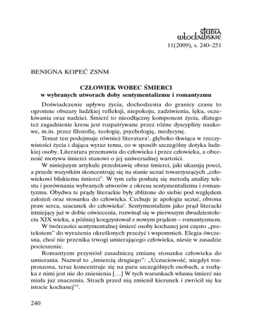 11(2009), s. 240–251 BENIGNA KOPEĆ ZSNM CZŁOWIEK WOBEC ŚMIERCI w wybranych utworach doby sentymentalizmu i romantyzmu Doświadczenie upływu życia, dochodzenia do granicy czasu to ogromne obszary ludzkiej refleksji, niepokoju, zadziwienia, lęku, oczekiwania oraz nadziei. Śmierć to nieodłączny komponent życia, dlatego też zagadnienie kresu jest rozpatrywane przez różne dyscypliny naukowe, m.in. przez filozofię, teologię, psychologię, medycynę. Temat ten podejmuje również literatura1, głęboko tkwiąca w rzeczywistości życia i dająca wyraz temu, co w sposób szczególny dotyka ludzkiej osoby. Literatura przemawia do człowieka i przez człowieka, a obecność motywu śmierci stanowi o jej uniwersalnej wartości. W niniejszym artykule przedstawię obraz śmierci, jaki ukazują poeci, a przede wszystkim skoncentruję się na stanie uczuć towarzyszących „człowiekowi bliskiemu śmierci”. W tym celu posłużę się metodą analizy tekstu i porównania wybranych utworów z okresu sentymentalizmu i romantyzmu. Obydwa te prądy literackie były zbliżone do siebie pod względem założeń oraz stosunku do człowieka. Cechuje je apologia uczuć, obrona praw serca, szacunek do człowieka2. Sentymentalizm jako prąd literacki istniejący już w dobie oświecenia, rozwinął się w pierwszym dwudziestoleciu XIX wieku, a później koegzystował z nowym prądem – romantyzmem. W twórczości sentymentalnej śmierć osoby kochanej jest często „pretekstem” do wyrażenia określonych przeżyć i wspomnień. Elegia ówczesna, choć nie przenika trwogi umierającego człowieka, niesie w zasadzie pocieszenie. Romantyzm przyniósł zasadniczą zmianę stosunku człowieka do umierania. Nazwał to „śmiercią drugiego”: „Uczuciowość, niegdyś rozproszona, teraz koncentruje się na paru szczególnych osobach, a rozłąka z nimi jest nie do zniesienia […] W tych warunkach własna śmierć nie miała już znaczenia. Strach przed nią zmienił kierunek i zwrócił się ku istocie kochanej”3. 240 * * * Kluczowym pojęciem, jakie stosujemy mówiąc o literaturze sentymentalizmu, jest kategoria „czucia” i „serca”. Serce jest siedliskiem uczuć, a szerzej – całego życia wewnętrznego. „Czucie” natomiast to sposób doświadczalnego i subiektywnego „poznania”. Poeta jako człowiek „czuły” słucha poruszeń serca, tak że jego „postawa czułości wyciska znamię w języku wierszy lirycznych, w sferze obrazowania, kręgów słownych i frazeologii”4. Pisze o tym czołowy przedstawiciel polskiego sentymentalizmu – Franciszek Karpiński – w rozprawie O wymowie w prozie albo wierszu, który kategorię „czułości” umieścił w kategoriach teoretycznoliterackich5. Jako poeta Franciszek Karpiński (1741–1825) stosował zawarte we wspomnianym dziele zasady, malując świat i wnętrze człowieka „czułego”, wyrażając jego uczucia, o czym można się przekonać, przyglądając się jednemu z wczesnych jego liryków Trwoga człowieka bliskiego śmierci, który został opublikowany w 1780 r. (w pierwszym tomiku poezji Karpińskiego Zabawki wierszem i przykłady obyczajne). Już się dach zepsuł i przez mdłe ściany Lada się wicher przekradnie, Słusznie, gospodarz, chodzę stroskany, Widząc, że mi dom upadnie. Jeszcze na wstręcie wiatrów upartych, Jak na nieszczęście stawiony, Sto do upadku ma bram otwartych, A żadnej znikąd zasłony. Cóż to za szelest, kto mi ma szkodzić? Trzęsienie z jakiej przyczyny? Któż będzie gwałtem w drzwi moje wchodzić? Idą posłowie ruiny. Ach widzę, jako już wszystko ginie, Co miałem i… co nie miałem. Jednę przynajmniej ratujcie skrzynię, W której nadzieję schowałem!6 Już sam tytuł wiersza określa rodzaj uczucia i przyczynę, jaka je wywołuje. Utwór jest studium emocjonalnych stanów człowieka „czułego”, stojącego w obliczu zbliżającego się nieuchronnie kresu, jest wejściem w tę tak bardzo egzystencjalną i specyficzną – bo ostateczną – sytuację 241 człowieka. Jest również próbą poetyckiego wyrażenia tego, czego ów umierający doświadcza. Tłem do analizy ludzkiego lęku jest obraz chylącego się ku upadkowi domu. Pojęcie „dom” ma bardzo bogatą symbolikę w języku: oznacza bezpieczeństwo, trwałość, schronienie, występuje często jako emblemat ciała ludzkiego7. W utworze, poza tytułem, nie pada słowo „śmierć”, jednak zakreślony obraz postępującego upadku sugeruje takie skojarzenia. Podmiot liryczny przybiera postać gospodarza8, który wypowiada swoje uczucia, obawy rodzące się w nim wobec zaobserwowanego stanu rzeczy. Jego monolog ukazuje poszczególne etapy niszczenia: Już dach się zepsuł i przez mdłe ściany Lada się wicher przekradnie, Słusznie, gospodarz, chodzę stroskany Widząc, że mi dom upadnie. Zepsuty dach wywołuje u gospodarza zdziwienie, połączone z zaniepokojeniem, które podkreśla modulant „już”. Gospodarz przewiduje to, co wkrótce niechybnie nastąpi. „Mdłe ściany” odznaczają się nietrwałością, a pozostawione na pastwę wichru, nie dają spodziewanego bezpieczeństwa i ciepła, a nawet stanowią zagrożenie. Dostrzegane przez podmiot liryczny zagrożenie „upadkiem domu” wzbudza w nim zatroskanie, połączone z lękiem. Przestrach się wzmaga, gdyż sytuacja stale się pogarsza: „wichry uparte” „szturmują” stojący samotnie „bez żadnej zasłony” dom. Napięcie wzrasta, bo „sto do upadków ma bram otwartych” – a sformułowanie to oznacza nieuchronną klęskę9. W opisie zniszczenia domu można zauważyć dwa, biegunowo różne, pola semantyczne. Pierwsze z nich skupia wyrazy odnoszące się do domu i jego mieszkańca, i konotuje określenia słabości, bezsilności: zepsuty dach, mdłe ściany, stroskany gospodarz, dom wystawiony na nieszczęście, brak mu zasłony, przeznaczony na upadek. Drugie pole skupia określenia sił wrogich, przeciwnych człowiekowi, 