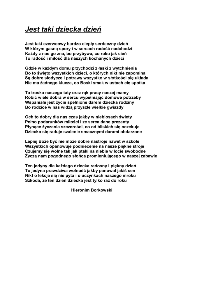 Jest taki dziecka dzień Jest taki czerwcowy bardzo ciepły serdeczny dzień W którym gasną spory i w sercach radość nadchodzi Każdy z nas go zna, bo przybywa, co roku jak cień To radość i miłość dla naszych kochanych dzieci Gdzie w każdym domu przychodzi z łaski z wytchnienia Bo to święto wszystkich dzieci, o których nikt nie zapomina Są dobre słodycze i potrawy wszystko w słotkości się układa Nie ma żadnego klucza, co Boski smak w ustach cię spotka Ta troska naszego taty oraz rąk pracy naszej mamy Robić wiele dobra w sercu wypełniając domowe potrzeby Wspaniałe jest życie spełnione darem dziecka rodziny Bo rodzice w nas widzą przyszłe wielkie gwiazdy Och to dobry dla nas czas jakby w niebiosach święty Pełno podarunków miłości i ze serca dane prezenty Płynące życzenia szczerości, co od bliskich się oczekuje Dziecko się raduje szalenie smacznymi darami obdarzone Lepiej Boże być nie może dobre nastroje nawet w szkole Wszystkich opanowuje podniecenie na nasze piękne stroje Czujemy się wolne tak jak ptaki na niebie w locie swobodne Życzą nam pogodnego słońca promieniującego w naszej zabawie Ten jedyny dla każdego dziecka radosny i piękny dzień To jedyna prawdziwa wolność jakby panował jakiś sen Nikt o lekcje się nie pyta i o uczynkach naszego mroku Szkoda, że ten dzień dziecka jest tylko raz do roku Hieronim Borkowski