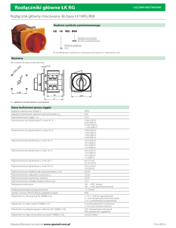 Rozłączniki główne ŁK RG ŁĄCZNIKI KRZYWKOWE Rozłącznik główny mocowany do bazy ŁK16RG B08 Budowa symbolu zamówieniowego ŁK 16 RG\ B08 Sposób mocowania B08 do bazy podpulpitowej Wielkość prądowa 16 16 A W standardowym wykonaniu stosowany jest łącznik nr wykonania 2.421 Wymiary 1...3 10 4 ot w . 4, 5 Mocowanie do bazy podpulpitowej 48 58 64 L* * L - głębokość skrzynki (podać w zamówieniu) Dane techniczne (praca ciągła) Napięcie znamionowe izolacji Ui Napięcie znamionowe udarowe wytrzymywalne Uimp Prąd znamionowy ciągły Iu=Ith Znamionowa moc łączeniowa Pe w kat. AC-3 Znamionowa moc łączeniowa Pe w kat. AC-4 Prąd znamionowy łączeniowy Ie w kat. AC-3 Prąd znamionowy łączeniowy Ie w kat. AC-4 Prąd znamionowy łączeniowy Ie w kat. DC-1 Prąd znamionowy łączeniowy Ie w kat. DC-21 Prąd znamionowy krótkotrwały wytrzymywalny Icw(1s) Prąd znamionowy załączalny zwarciowy Icm Prąd znamionowy zwarciowy umowny Prąd znamionowy wkładka bezpiecznikowa gG Temperatura otoczenia Przekrój przewodów przyłączeniowych Stopień ochrony: PN-EN 60529 względem pulpitu Odporność na wibrację (wg IEC 60068-2-6) Odporność na udary (wg IEC 60068-2-27) Odporność na wilgotne gorąco cykliczne (IEC 60068-2-30) Odporność na mgłę solną cykliczną (wg IEC 60068-2-52) Więcej informacji na stronie www.spamel.com.pl 690 V 6 kV 16 A 5 kW (230 V) 8 kW (400 V) 10 kW (500 V) 11 kW (690 V) 5 kW (230 V) 7 kW (400 V) 7 kW (500 V) 6 kW (690 V) 16 A (230 V) 16 A (400 V) 16 A (500 V) 12 A (690 V) 16 A (230 V) 13 A (400 V) 10 A (500 V) 7 A (690 V) 8 A (110 V) 2,5 A (220 V) 10 A (110 V) 3 A (220 V) 0,9 kA 1,3 kA 13 kA 16 A -40 ... +70°C (pracy) -40 ... +70°C (przechowywania) 1,5...4 mm² IP65 2...13, 2...100 Hz (częstotliwość) ± 1 mm (amplituda przemieszczenia) ± 0,7 g (amplituda przyspieszenia) 15 g (przyspieszenie szczytowe) 11 ms (czas trwania impulsu) 55°C (temperatura otoczenia) 95% (wilgotność względna) ostrość próby 1 19-4-2014