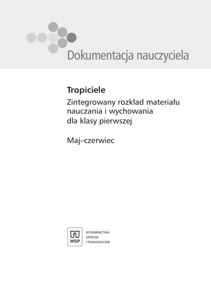 Dokumentacja nauczyciela Tropiciele Zintegrowany rozkład materiału nauczania i wychowania dla klasy pierwszej Maj–czerwiec WYDAWNICTWA SZKOLNE I PEDAGOGICZNE Autorzy rozkładów materiałów: Agnieszka Kamińska, Beata Nadarzyńska; Aldona Danielewicz- -Malinowska (treści muzyczne); Małgorzata Małyska, Janusz Woźniak, Małgorzata Wróblewska (wychowanie muzyczne); Elżbieta Burakowska (treści matematyczne) © Copyright by Wydawnictwa Szkolne i Pedagogiczne sp. z o.o. Warszawa (2012) Wydanie I (2012) ISBN 978-83-02-13165-3 Opracowanie merytoryczne i redakcyjne: Anna Królik (redaktor cyklu), Teresa Nowak (redaktor merytoryczny) Redakcja techniczna: Monika Rudnik-Kulikowska Projekt graficzny: Studio SundayLove Skład i łamanie: Meritum21 Wydawnictwa Szkolne i Pedagogiczne spółka z ograniczoną odpowiedzialnością 00-807 Warszawa, Aleje Jerozolimskie 96 Tel.: 22 576 25 00 Infolinia: 800 220 555 www.wsip.pl Druk i oprawa: Formator Sp. z o.o., Toruń Zintegrowany rozkład materiału nauczania i wychowania dla klasy I część 5 MAJ–CZERWIEC Rozkład tematów w podziale na tygodnie i dni I. Moja ojczyzna IV. Gra w kolory 1. Na majówkę 2. Na wycieczce w lesie 3. Moja mała ojczyzna 4. Czekoladowy raj 5. Mój kraj – Polska 16. Kolorowy rok 17. Różnobarwna działka 18. Mieszkańcy kolorowej łąki 19. W barwach tęczy 20. Wycieczka na pobliską łąkę lub do parku II. Niesamowite podróże V. Wakacje w krainie fantazji 6. Jesteśmy Europejczykami 7. Niesamowite budowle 8. Niesamowite muzea 9. Ruch w mieście 10. Jesteśmy pasażerami 21. Skąd się wzięły smoki? 22. O dinozaurach słów kilka 23. Smok Wawelski 24. Wakacyjne porady 25. Jedziemy na wakacje III. Ja i wszyscy dookoła 11. Wspaniałych rodziców mam 12. Jesteśmy uczniami 13. Jesteśmy koleżeńscy 14. Jacy jesteśmy? 15. Dzień do dyspozycji nauczyciela – klasowa aukcja 3 4 P. s. 3 K. s. 3, 4 1.1) a, b, c 1.2) b, c, d, e, f Odniesienia do stron w materiałach uczniowskich Odniesienia do NPP 3.1) 2) 4) 5) 4.1) K. s. 3 Rysowanie po śladzie konturów orła. Kolorowanie godła. Przypomnienie hymnu Polski. CD – hymn Polski plastyczna muzyczna 5.8) CD – hymn Polski Święta majowe: 1 Maja, 3 Maja, Święto Flagi. Prezentacja symboli narodowych – godła i flagi. Rozpoznawanie flagi Polski wśród flag innych państw. Informacje dotyczące narodowości, języka i prawodawstwa w Polsce. społeczna przyrodnicza Aktywność ucznia – edukacje: 7.2) b M. s. 3–7 Rozwijanie sprawności rachunkowej, dodawanie w zakresie 10 – zapisywanie dodawania trzech składników. Wprowadzenie pojęcia kilometr. Matematyka w działaniu. matematyczna techniczna etyczna *Aktywność ucznia w zakresie edukacji wychowania fizycznego została uwzględniona w rozkładzie materiału oddzielnie, w tabelkach na końcu każdego tygodnia. Przewidywane osiągnięcia ucznia Podstawowe • Słucha w skupieniu tekstu G. Kasdepke Maraton • Wypowiada się na temat nastroju opowiadania • Bierze udział w rozmowie na temat szczęścia • Kulturalnie zwraca się do rozmówcy • Wyznacza sumy trzech składników w zakresie 10, poprawnie zapisuje te działania • Ponadpodstawowe • Wypowiada się na temat świąt majowych: 1 Maja, 3 Maja, Święta Flagi • Opisuje godło Polski • Wysłuchanie tekstu G. Kasdepke Maraton czytanego przez N. Wielozdaniowe wypowiedzi na temat wysłuchanego tekstu, ilustracji i nastroju opowiadania. Słuchanie wiersza Mówię po polsku. Układanie, zapisywanie i uzupełnianie zdań. Wypowiedzi na temat świąt majowych: 1 Maja, Święta Flagi, 3 Maja. polonistyczna Dzień 1. Na majówkę Temat dnia I. Moja ojczyzna Zintegrowany rozkład materiału nauczania i wychowania dla klasy I część 5* MAJ – CZERWIEC Tropiciele. Rozkład materiału nauczania i wychowania dla klasy pierwszej Nauka czytania wyrazów z sz. Doskonalenie techniki czytania na różnych poziomach. Wielozdaniowe wypowiedzi na temat wycieczki do lasu na podstawie tekstu, ilustracji z podręcznika, wysłuchanych odgłosów lasu i doświadczeń U. Wyszukiwanie na ilustracji oraz w tekście wyrazów z sz. Opis szałasu. Układanie pytań i odpowiedzi na temat czynności wykonywanych przez bohaterów w lesie. Analiza i synteza wzrokowo-słuchowa, układanie wyrazów. Przepisywanie zdań. Ćwiczenia grafomotoryczne przygotowujące do nauki pisania sz. P. s. 4, 5 K. s. 5–7 CD 1.1) a, b, c 1.2) b, c, d, e, f Dzień 2. Na wycieczce w lesie Odniesienia do stron w materiałach uczniowskich Odniesienia do NPP 5.2) Współpraca z innymi w zabawie. Przestrzeganie ustalonych reguł podczas wycieczki. 6.1) a, b, c P. s. 4, 5 K. s. 5 Zwierzęta i rośliny występujące w lesie. Właściwe zachowanie w lesie. Wiosenne odgłosy lasu. 7.2) d 7.3) a M. s. 4, 5, 8, 9 Rozwiązywanie zadań tekstowych – czytanie planu, dodawanie i odejmowanie w zakresie 20. Matematyka w działaniu. 9.2) c Bezpieczne poruszanie się po drogach podczas wycieczki. Bezpieczne i kulturalne zachowanie się w środkach komunikacji miejskiej. Tropiciele. Rozkład materiału nauczania i wychowania dla klasy pierwszej 5 6 polonistyczna muzyczna plastyczna społeczna przyrodnicza Aktywność ucznia – edukacje: matematyczna techniczna etyczna Dzień 3. Moja mała ojczyzna Słuchanie tekstu Majowe święta. Wielozdaniowe wypowiedzi na temat sposobu spędzania dni wolnych od pracy i nauki. Poszerzenie słownictwa U. o wyrazy: długi weekend oraz nazwy świąt. Opowiadanie na temat tradycji związanych z obchodzeniem świąt: 1 Maja, 2 maja – Dzień Flagi Rzeczypospolitej Polskiej i 3 Maja – Święto Narodowe Trzeciego Maja. Nazywanie emocji związanych ze świętami majowymi. Opis miejsca, w którym mieszkamy. Rozmowa na temat spędzania wolnego czasu w swojej miejscowości. Planowanie sprzątania szkoły. Poznawanie dźwięku fa. Rysowanie domu po śladzie. Święta państwowe: 1 Maja – Święto Pracy i 3 Maja – Święto Narodowe Trzeciego Maja oraz tradycje związane z ich obch