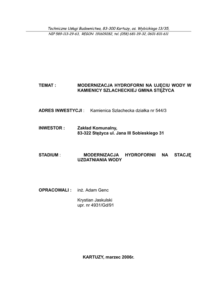 Techniczne Usługi Budownictwa, 83-300 Kartuzy, os. Wybickiego 13/35, NIP 589-113-29-63, REGON 191609282, tel. (058) 681-39-32, 0601-831-611 TEMAT : MODERNIZACJA HYDROFORNI NA UJĘCIU WODY W KAMIENICY SZLACHECKIEJ GMINA STĘŻYCA ADRES INWESTYCJI : Kamienica Szlachecka działka nr 544/3 INWESTOR : Zakład Komunalny, 83-322 Stężyca ul. Jana III Sobieskiego 31 STADIUM : MODERNIZACJA HYDROFORNII UZDATNIANIA WODY OPRACOWALI : inż. Adam Genc Krystian Jaskulski upr. nr 4931/Gd/91 KARTUZY, marzec 2006r. NA STACJĘ 1.OPIS TECHNICZNY..........................................................................................................................................2 1.1CEL OPRACOWANIA......................................................................................................................................3 1.2DANE FORMALNO – PRAWNE....................................................................................................................3 1.3ISTNIEJĄCA ZABUDOWA, UZBROJENIE TERENU...............................................................................3 1.4OGÓLNE ZAŁOŻENIA KONCEPCJI TECHNICZNEJ:............................................................................3 1.5KONCEPCJA TECHNICZNA – BRANŻA SANITARNA............................................................................4 1.6 KONCEPCJA TECHNICZNA – BRANŻA BUDOWLANA.......................................................................6 1.7.KONCEPCJA TECHNICZNA – BRANŻA ELEKTRYCZNA..................................8 2OBLICZENIA – DOBÓR URZĄDZEŃ TECHNOLOGICZNYCH, OPIS ROZWIĄZAŃ PROJEKTOWYCH................................................................................................................................................9 2.1 POMPY GŁĘBINOWE...............................................................................................................9 2.2 NAPOWIETRZANIE (AERACJA) /A/...........................................................................................9 2.3 DOBÓR SPRĘŻARKI /S/...........................................................................................................9 2.4 FILTRY /F1, F2/.................................................................................................................10 2.5 ZŁOŻE FILTRACYJNE............................................................................................................10 2.6 REGENERACJA ZŁOŻA FILTRACYJNEGO..................................................................................10 2.7 DOZOWNIK PODCHLORYNU SODU...........................................................................................11 2.8 RUROCIĄGI TECHNOLOGICZNE..............................................................................................11 2.9 ARMATURA ODCINAJĄCA (PRZEPUSTNICE, ZASUWY, ZAWORY ZWROTNE)....................................12 2.10ODPOWIETRZNIKI...............................................................................................................12 2.11WODOMIERZE....................................................................................................................12 2.12INSTALACJA WOD – KAN......................................................................................................12 2.13INSTALACJA OGRZEWANIA ELEKTRYCZNEGO – WYTYCZNE DLA PROJEKTU.................................13 2.14 WENTYLACJA NAWIEWNO – WYWIEWNA - WYTYCZNE...........................................................13 2.15AUTOMATYKA PROCESÓW TECHNOLOGICZNYCH ....................................................................13 13 2.16 ODSTOJNIK WÓD POPŁUCZNYCH..........................................................................................14 2.17KOLEJNOŚĆ WYKONYWANIA PRAC REMONTOWO MODERNIZACYJNYCH......................................14 2.18UWAGI KOŃCOWE ..............................................................................................................15 3.DOKUMENTY FORMALNO – PRAWNE ....................................................................................................15 4.CZĘŚĆ RYSUNKOWA RYSUNKI NUMER:.................................................................................................16 5.INWENTARYZACJA FOTOGRAFICZNA STANU ISTNIEJĄCEGO......................................................16 2.DOKUMENTACJA FOTOGRAFICZNA STANU ISTNIEJĄCEGO..........................................................16 6.MATERIAŁY INFORMACYJNE...................................................................................................................16 1. OPIS TECHNICZNY 2 Technologii stacji uzdatniania wody i uzbrojenia terenu 1.1 Cel opracowania Celem opracowania jest przygotowanie założeń techniczno – ekonomicznych rozbudowy ujęcia wody z hydrofornią w Kamienicy Szlacheckiej o stację uzdatniania wody, przez co doprowadzenie jakości wody dostarczanej dla ludności wsi Kamienica Szlachecka, Leszczynki, Ostrowo, Balwerk do zgodnej z Rozporządzeniem Ministra Zdrowia z dnia 19.11.2002r. w sprawie wymagań dotyczących jakości wody przeznaczonej do spożycia przez ludność (Dz.U. nr 203, poz. 1718 z 2002r. z późniejszymi zmianami). 1.2 Dane formalno – prawne 1.2.1 1.2.2 1.2.3 Zlecenie Zakładu Komunalnego w Stężycy na opracowanie koncepcji. Decyzja Państwowego Powiatowego Inspektora Sanitarnego w Kartuzach. Dostępna dokumantacja: Projekt podstawowy architektoniczno – konstrukcyjny „Hydroforni we wsi Kamienica Szlachecka, opracowany w 1969r. Operat wodnoprawny – na pobór wód podziemnych z utworów czwartorzędowych i eksploatację urządzeń wodnych, opracowany w 2002r. Pozwolenie wodnoprawne na pobór wód podziemnych z utworów czwartorzędowych w ilości Qdmax = 51,0 m3/h oraz eksploatację urządzeń wodnych na ujęciu składających się ze studni wierconych o parametrach: a) studnia nr 1, o głębokości 105,0 m i wydajności eksploatacyjnej Q= 51,0 m3/h, b) studnia nr 2, o głęb