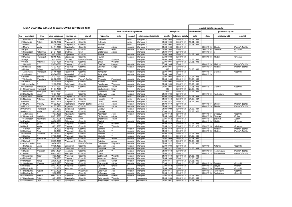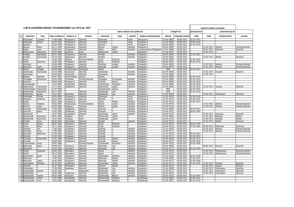 LISTA UCZNIÓW SZKOŁY W WARGOWIE I od 1912 do 1927 opuścił szkołę z powodu: dane rodzica lub opiekuna l.p. nazwisko 1 2 3 4 5 6 7 8 9 10 11 12 13 14 15 16 17 18 19 20 21 22 23 24 25 26 27 28 29 30 31 32 33 34 35 36 37 38 39 40 41 42 43 44 45 46 47 48 49 50 51 52 53 54 55 56 57 58 Ostrowska Ostrowski Nowicki Mucha Kąkol Skotarczak Pawlak Pawlak Smyk Smyk Stroiński Stroiński Meina Jankowiak Jankowiak Brasse Wylegała Kuźniak Czechowska Stachowski Szubertowski Dolatowska Dolatowski Ostrowski Nowicka Urban Mucha Mucha Garczyk Garczyk Adamczak Skotarczak Skotarczak Pawlak Smyk Smyk Stoiński Stoińska Stoińska Stoiński Kuźniak Kuźniak Czechowska Bartosiak Bartosiak Dukat Dukat Sobkowiak Mańczak Mańczak Stachowski Szweda Dolatowski Dolatowska Dolatowska Stachowiak Świerkowski Świerkowski imię Ludwika Antoni ? Maria Leon Katarzyna Agnieszka Franciszek ? Antonina ? Józef Pelagia Franciszek ? Stefania Walentyna ? ? Franciszek Franciszek Katarzyna Ignacy Florian Antonina ? Walenty Józef Franciszek Maria ? Kazimierz Kazimierz Anna Ignacy Maria Jan Anna Marianna ? Franciszek ? Anna Maria ? Wojciech ? Józef ? Jakub Walenty ? ? August ? Józefa Antoni Leon data urodzenia miejsce ur. 11-09-1898 26-10-1902 27-05-1899 04-11-1900 22-06-1901 24-04-1899 20-01-1899 02-10-1907 14-02-1899 12-04-1900 25-09-1899 13-03-1901 26-02-1899 24-10-1899 05-04-1902 24-07-1901 02-02-1899 28-04-1900 17-03-1903 15-11-1901 01-07-1900 08-11-1897 18-07-1901 30-03-1904 23-05-1903 08.01.1906 05.02.1904 02.02.1906 17.02.1903 15.03.1906 13.07.1906 09.01.1903 12.07.1905 06.06.1906 08.07.1903 16.11.1905 11.06.1903 11.06.1904 07.09.1903 07.09.1905 14.01.1903 26.09.1905 30.06.1906 08.08.1907 23.09.1904 22.04.1904 09.12.1905 13.03.1904 17.06.1903 22.06.1905 26.12.1903 23.07.1906 17.09.1902 04.03.1905 19.06.1906 09.03.1906 13.01.1899 12.03.1900 Wargowo II Wargowo II Wargowo II Kowalewko Wargowo II Brodnica Objezierze Objezierze Żydowo Wargowo I Wargowo I Wargowo I Wielbrantowo Neuendorf Neuendorf Suchorzewko Chludowo Wargowo I Świerkówki Zielątkowo ? ? Nieszawa Wargowo II Wargowo II Wargowo II Rostworowo Rogenau Zielątkowo Zielątkowo Kowalewko Chaławy Chaławy Objezierze Wargowo I Wargowo I Wargowo I Wargowo I Wargowo I Wargowo I Wargowo I Wargowo II ? Ocieszyn I Ocieszyn I Nieczajna Nieczajna Wargowo I Wargowo I Wargowo I Zielątkowo Wargowo I Nieszawa ? Trojanowo Wojnowo Kowalewko Kowalewko powiat Oborniki Oborniki Oborniki Oborniki Oborniki Śrem Oborniki Oborniki Poznań-Zachód Oborniki Oborniki Oborniki Starogard Oborniki Oborniki Jarocin Poznań-Zachód Oborniki Oborniki Oborniki ? Oborniki Oborniki Oborniki Oborniki Oborniki Poznań-Zachód Oborniki Oborniki Oborniki Oborniki Śrem Śrem Oborniki Oborniki Oborniki Oborniki Oborniki Oborniki Oborniki Oborniki Oborniki Poznań-Zachód Oborniki Oborniki Oborniki Oborniki Oborniki Oborniki Oborniki Oborniki Oborniki Oborniki Wągrowiec Oborniki Oborniki Oborniki Oborniki nazwisko Ostrowski Ostrowski Nowicki Mucha Kąkol Skotarczak Pawlak Pawlak Smyk Smyk Stroiński Stroiński Meina Jankowiak Jankowiak Brasse Wylegała Kuźniak Czechowski Stachowski Szubertowski Dolatowski Dolatowski Ostrowski Nowicki Urban Mucha Mucha Garczyk Garczyk Adamczak Skotarczak Skotarczak Pawlak Smyk Smyk Stoiński Stoiński Stoiński Stoiński Kuźniak Kuźniak Czechowski Bartosiak Bartosiak Dukat Dukat Sobkowiak Mańczak Mańczak Stachowski Szweda Dolatowski Dolatowski Dolatowski Stachowiak Świerkowski Świerkowski imię Jakub Albin Jakub zawód rolnik rolnik rolnik robotnik robotnik robotnik robotnik Walenty Walenty Longin Longin robotnik robotnik robotnik robotnik Franciszek Antoni Wojciech Jakub Ignacy Jan Jan ? ? Stefan Jakub Jakub ? ? Józef Jakub Jakub ? Walenty Walenty ? ? ? ? Antoni Antoni Wojciech Jan Jan ? ? Walenty Stefan Stefan Jakub Ignacy Jan Jan Jan Marcin Walenty Walenty robotnik robotnik robotnik robotnik ? robotnik robotnik rolnik rolnik robotnik robotnik robotnik robotnik robotnik robotnik ? ? robotnik ? ? robotnik robotnik robotnik robotnik robotnik robotnik robotnik robotnik robotnik robotnik robotnik robotnik robotnik robotnik robotnik ? robotnik robotnik robotnik robotnik ? ? wstąpił do: miejsce zamieszkania szkoły tutejszej szkoły Wargowo II Wargowo II Wargowo II Wargowo II u Ławniczaka w Wargowie Wargowo I Wargowo I Wargowo I Wargowo I Wargowo I Wargowo I Wargowo I Wargowo I Wargowo I Wargowo I Wargowo I Wargowo I Wargowo I Wargowo I Wargowo I Wargowo I Wargowo I Wargowo I Wargowo II Wargowo II Wargowo II Wargowo II Wargowo II Wargowo II Wargowo II Wargowo I Wargowo I Wargowo I Wargowo I Wargowo I Wargowo I Wargowo I Wargowo I Wargowo I Wargowo I Wargowo I Wargowo I Wargowo I Wargowo I Wargowo I Wargowo I Wargowo I Wargowo I Wargowo I Wargowo I Wargowo I Wargowo I Wargowo I Wargowo I Wargowo I Wargowo I Kowalewko Kowalewko 01.04.1905 01.04.1909 04.04.1906 04.04.1908 01.04.1908 01.04.1907 04.04.1905 02.04,1908 27.04.1905 09.04.1907 03.04.1905 04.04.1907 1905 03.04.1906 01.04.1908 02.04.1908 01.04.1906 05.04.1906 01.04.1909 01.04.1908 1905 1905 01.04.1908 31.03.1910 31.03.1910 15.04.1912 31.03.1910 02.04.1912 01.04.1909 15.04.1912 02.04.1912 01.04.1909 02.04.1912 02.04.1912 31.03.1910 02.04.1912 31.03.1910 01.04.1911 31.03.1910 01.04.1911 01.04.1909 02.04.1912 02.04.1912 02.04.1908 03.04.1911 01.04.1910 02.04.1912 31.03.1910 01.04.1909 01.04.1911 05.04.1911 02.04.1912 01.04.1909 01.04.1911 02.04.1912 02.04.1912 01.04.1905 01.04.1907 05.08.1912 05.08.1912 05.08.1912 05.08.1912 05.08.1912 05.08.1912 05.08.1912 05.08.1912 05.08.1912 05.08.1912 05.08.1912 05.08.1912 05.08.1912 05.08.1912 05.08.1912 05.08.1912 05.08.1912 05.08.1912 05.08.1912 05.08.1912 05.08.1912 05.08.1912 05.08.1912 05.08.1912 05.08.1912 05.08.1912 05.08.1912 05.08.1912 05.08.1912 05.08.1912 05.08.1912 05.08.1912 05.08.1912 05.08.1912 05.08.1912 05.08.1912 05.08.1912 05.08.1912 05.08.1912 05.08.1912 05.08.1912 05.08.1912 05.08.1912 05.08.1912 05.08.1912 05.08.1912 05.08.1912 05.08.1912