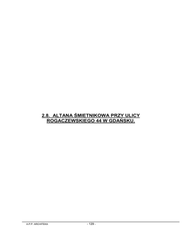 2.8. ALTANA ŚMIETNIKOWA PRZY ULICY ROGACZEWSKIEGO 44 W GDAŃSKU. A.P.P. ARCHITEKA - 129 - 2.8.1. OKREŚLENIE PRZEDMIOTU ZAMÓWIENIA. 2.8.1.1. Podstawowe parametry i ogólny zakres prac objętych zadaniem. Zadanie obejmuje opracowanie dokumentacji projektowej wraz z wykonaniem altany śmietnikowej dla potrzeb gromadzenia komunalnych odpadów dla Punktów Gromadzenia Odpadów przy ulicy Rogaczewskiego 44 oraz zagospodarowanie terenu. Orientacyjna lokalizacja altany śmietnikowej oraz jej użytkownicy zostali określeni przez Zamawiającego (PGO przy ul. Rogaczewskiego 44 - załącznik nr 2.8). 2.8.1.2. Podstawowe wymagania materiałowe Zamawiający określił kształt i formę wiaty wraz z schematem rozbudowy, jej rozwiązania konstrukcyjne, sposób połączenia z podłożem i pokrycia (opis wiaty śmietnikowej - załącznik nr 1). Należy wykonać tablice informacyjne (opis - załącznik nr 6). 2.8.1.3. Zakres zadania objęty wyceną ofertową: W cenie oferowanej realizacji zadania należy ująć: 1) wykonanie dokumentacji projektowej zgodnie z rozporządzeniem Ministra Transportu Budownictwa i Gospodarki Morskiej z dnia 25 kwietnia 2012r. w sprawie szczegółowego zakresu i formy projektu Budowlanego (Dz.U. 2012.462) 2) uzyskanie stosownych pozwoleń w imieniu Inwestora. 3) wykonanie altan śmietnikowych. 4) wykonanie utwardzonych dojść zgodnie z projektem zagospodarowania 5) wywóz gruntu z wykopów na miejsce tymczasowego składowania i przywóz gruntu z powrotem do zasypania wykopów. 6) odtworzenie terenu, przywrócenie do stanu pierwotnego, 7) poniesienie kosztów obsługi geodezyjnej do celów sprawdzań, wytyczeń i inwentaryzacji powykonawczej, 8) ubezpieczenie budowy z tytułu: -zniszczenia wykonanych robót i materiałów podczas budowy, -zniszczenia własności prywatnej osób trzecich, spowodowanego działaniami lub niedopatrzeniami Wykonawców. 2.8.1.4. Zakres prac do wykonania 2.8.1.4.1. W części dotyczącej projektowania - pozyskanie, zebranie i weryfikacja wszystkich materiałów i dokumentów niezbędnych do wykonania dokumentacji projektowo - kosztorysowej i uzyskania pozwolenia na budowę: • badania geotechniczne - miejsce odwiertu należy ustalić z konstruktorem • uzyskanie odpowiedniego zezwolenia na przeprowadzenie prac ziemnych wymagających zapewnienia nadzorów archeologicznych A.P.P. ARCHITEKA - 130 - • pozytywna decyzja Pomorskiego Wojewódzkiego Konserwatora zabytków (istnieje pozytywna opinia od Wojewódzkiego Konserwatora Zabytków ZAŁĄCZNIK nr 4) • ze względu na projektowaną pow. utwardzoną poza granicą działki przy projekcie budowlanym należy złożyć wniosek o wydanie warunków na wykonanie wjazdu na działkę po czym uzyskać uzgodnienie ZDiZ ws. projektu wjazdu. - opracowana dokumentacja projektowa musi posiadać wszystkie uzgodnienia wymagane Prawem Budowlanym - opracowana dokumentacja musi być kompletna w zakresie wszelkich rozwiązań podstawowych i branżowych niezbędnych do przyszłego prawidłowego wykonania altany śmietnikowej, zawierać m.in.: • projekt zagospodarowana terenu projekt wjazdu na działkę wraz z wymaganym warunkami i uzgodnieniami • projekt budowlany branży architektury • projekt budowlany branży konstrukcji • projekt drogowy utwardzenia terenu • projekt odwodnienia placu - opracowana dokumentacja projektowa musi bezwzględnie być zgodna ze wszystkimi założeniami MPZP - opracowanie planu BIOZ - przygotowanie i złożenie wszystkich dokumentów niezbędnych do uzyskania pozwolenia na budowę. - przygotowanie kosztorysów i przedmiarów robót oraz specyfikacji technicznych wykonania odbioru robót. 2.8.1.4.2. W części wykonawczej. - organizacje, zagospodarowanie i utrzymanie zaplecza Wykonawcy w miejscu wyznaczonym przez Zamawiającego, - zorganizowanie i wykonanie dostaw materiałów - wykonanie prac budowlano - montażowych - wykonanie dokumentacji powykonawczej łączenie z inwentaryzacją geodezyjną - wszelkie prace ziemne wymagają zapewnienia nadzorów archeologicznych 2.8.2. WYMAGANIA ZAMAWIAJĄCEGO 2.8.2.1. Techniczne. Altanę należy zaprojektować w oparciu o wytyczne Zamawiającego (opis wiaty śmietnikowej - załącznik nr 1) oraz projekt koncepcyjny. A.P.P. ARCHITEKA - 131 - 2.8.2.2. Ekonomiczne. Projekt budowlany należy wykonać w oparciu o projekt koncepcyjny, który pokazuje możliwości formalno-prawne usytuowania altany, ale nie jest wiążący do projektu budowlanego. 2.8.2.3. Architektoniczne. Projekt budowlany branży architektury altany należy zaprojektować w oparciu o wytyczne Zamawiającego (opis wiaty śmietnikowej - załącznik nr 1) oraz projekt koncepcyjny. 2.8.2.4. Konstrukcyjne. Projekt budowlany branży konstrukcyjnej altany należy zaprojektować w oparciu o wytyczne Zamawiającego (opis wiaty śmietnikowej - załącznik nr 1) oraz projekt koncepcyjny 2.8.2.5. Materiałowe. Projekt budowlany branży architektury altany należy zaprojektować w oparciu o wytyczne Zamawiającego (opis wiaty śmietnikowej - załącznik nr 1) 2.8.2.6. Funkcjonalne. Projekt budowlany należy wykonać w oparciu o projekt koncepcyjny, który pokazuje możliwości formalno-prawne usytuowania altany, ale nie jest wiążący do projektu budowlanego 2.8.2.7. Wymagania dotyczące przygotowania terenu. 2.8.2.7.1. Architektury terenu. Wykopy pod altanę śmietnikową wykonać jeśli to możliwe bez rozbiórek istniejących ogrodzeń. W przypadku takiej konieczności uwzględnić w projekcie odtworzenie ogrodzenia. 2.8.2.7.2. Konstrukcja nawierzchni dróg placów chodników, terenów zielonych. Odtworzenie nawierzchni dróg, placów, chodników - przyjąć z materiału rozbiórkowego istniejącego - po uzupełnieniu ubytków. - Trawniki - dokonać humusowania i zasiewu trawy po wykopach w istniejących trawnikach. 2.8.2.8. Warunki wykonania i odbioru robót projektowych Część informacyjna: - projekt musi bazować na najnowszych rozwiązaniach technologicznych, - rozwiązania wynika