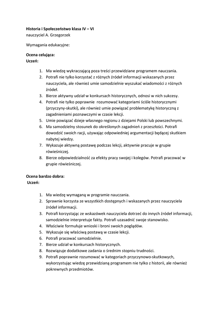 Historia i Społeczeństwo klasa IV – VI nauczyciel A. Grzegorzek Wymagania edukacyjne: Ocena celująca: Uczeń: 1. Ma wiedzę wykraczającą poza treści przewidziane programem nauczania. 2. Potrafi nie tylko korzystać z różnych źródeł informacji wskazanych przez nauczyciela, ale również umie samodzielnie wyszukać wiadomości z różnych źródeł. 3. Bierze aktywny udział w konkursach historycznych, odnosi w nich sukcesy. 4. Potrafi nie tylko poprawnie rozumować kategoriami ściśle historycznymi (przyczyny-skutki), ale również umie powiązać problematykę historyczną z zagadnieniami poznawczymi w czasie lekcji. 5. Umie powiązać dzieje własnego regionu z dziejami Polski lub powszechnymi. 6. Ma samodzielny stosunek do określonych zagadnień z przeszłości. Potrafi dowodzić swoich racji, używając odpowiedniej argumentacji będącej skutkiem nabytej wiedzy. 7. Wykazuje aktywną postawę podczas lekcji, aktywnie pracuje w grupie rówieśniczej. 8. Bierze odpowiedzialność za efekty pracy swojej i kolegów. Potrafi pracować w grupie rówieśniczej. Ocena bardzo dobra: Uczeń: 1. Ma wiedzę wymaganą w programie nauczania. 2. Sprawnie korzysta ze wszystkich dostępnych i wskazanych przez nauczyciela źródeł informacji. 3. Potrafi korzystając ze wskazówek nauczyciela dotrzeć do innych źródeł informacji, samodzielnie interpretuje fakty. Potrafi uzasadnić swoje stanowisko. 4. Właściwie formułuje wnioski i broni swoich poglądów. 5. Wykazuje się właściwą postawą w czasie lekcji. 6. Potrafi pracować samodzielnie. 7. Bierze udział w konkursach historycznych. 8. Rozwiązuje dodatkowe zadania o średnim stopniu trudności. 9. Potrafi poprawnie rozumować w kategoriach przyczynowo-skutkowych, wykorzystując wiedzę przewidzianą programem nie tylko z historii, ale również pokrewnych przedmiotów. Ocena dobra: Uczeń: 1. Opanował w stopniu zadawalającym materiał przewidziany w programie nauczania. 2. Poprawnie posługuje się kategoriami historycznymi, wskazuje przyczyny i skutki wydarzeń. 3. Poprawnie formułuje wnioski i udaje mu się bronić swoich poglądów. 4. Potrafi korzystać ze wszystkich poznanych w czasie lekcji źródeł informacji. 5. Jest aktywny w czasie lekcji. 6. Chętnie pracuje w grupie rówieśniczej, potrafi właściwie komunikować się z kolegami, uczestniczy w dyskusji. 7. Zna najważniejsze wydarzenia z historii swojego regionu. Ocena dostateczna: Uczeń: 1. Opanował podstawowe elementy wiadomości programowych, pozwalające mu na rozumienie najważniejszych zagadnień. 2. Potrafi pod kierunkiem nauczyciela korzystać z podstawowych źródeł informacji. 3. W czasie lekcji wykazuje się aktywnością w stopniu zadawalającym. 4. Nie pracuje systematycznie i niechętnie podejmuje pracę indywidualną, grupową. 5. Rzadko uczestniczy w dyskusji i pracach grupowych. 6. Czasami poprawnie formułuje wnioski, ma problemy z obroną swoich poglądów. 7. Nie zawsze wywiązuje się z powierzonych mu zadań. 8. Zna niektóre wydarzenia i postacie z historii regionu. Ocena dopuszczająca: Uczeń: 1. Opanował zakres wiedzy i umiejętności na poziomie koniecznym. 2. Nie pracuje systematycznie i niezbyt chętnie podejmuje zadanie wskazane przez nauczyciela. 3. Przy pomocy nauczyciela potrafi wykonywać proste polecenia wymagające zastosowania podstawowych umiejętności. 4. Nie potrafi sformułować własnych wniosków. 5. Ma poważne braki w wiedzy, które jednak można nadrobić w dłuższym czasie.